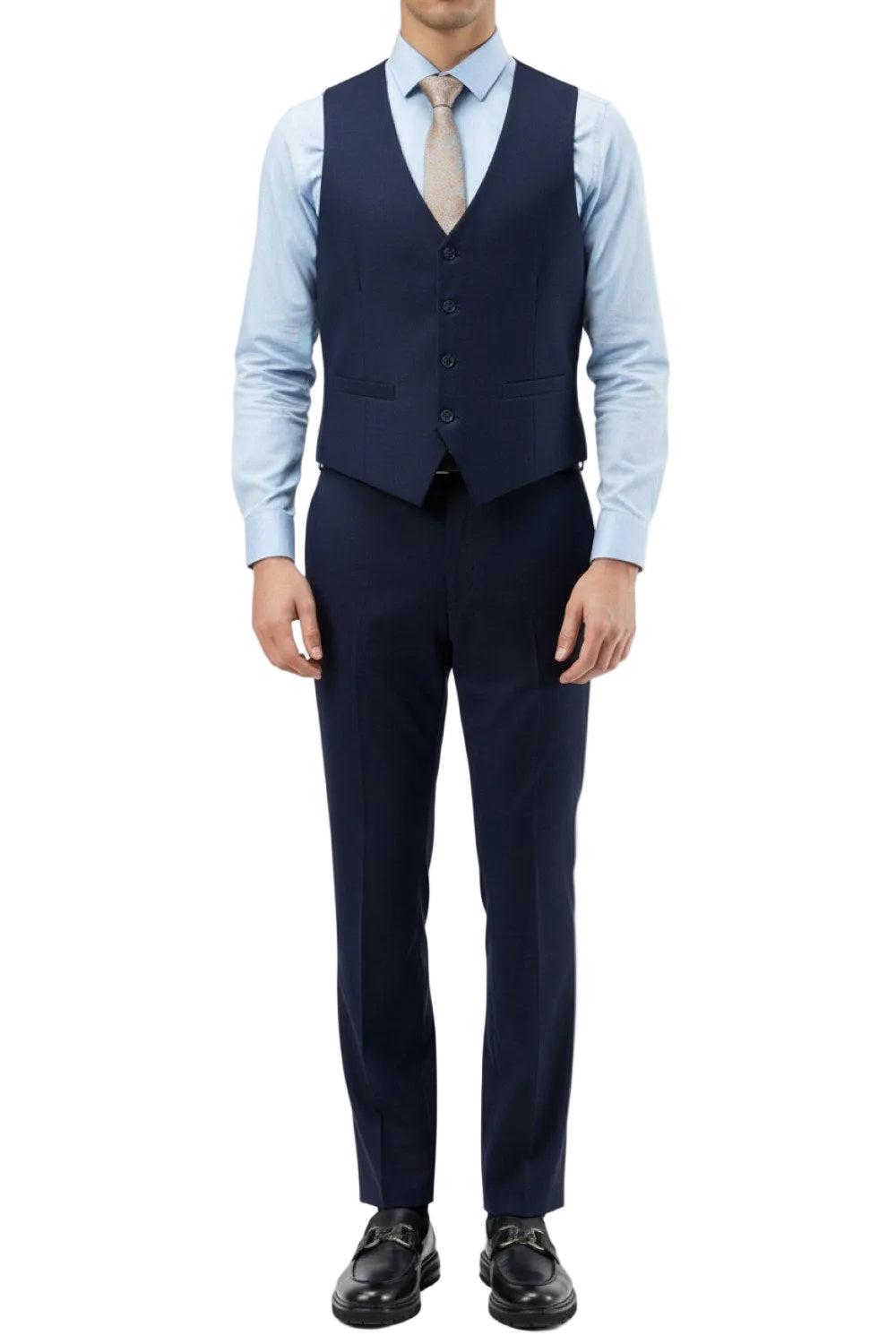 Jacket Solid Two-Button Front Closure Slim Fit Notch Lapel Side Vents Interior French Facing Two Besom Front Pockets with Flap Closure Three interior Pockets Underarm Sweat Guards Vest Solid Four-Button Closure V-Neck Pants Flat Front Two Back Besom Pockets with Button Closure Two Front Angled Slip Pockets Lined To the Knee 37 Inch Inseam Zip Fly & Extended Button Closure on Waistband