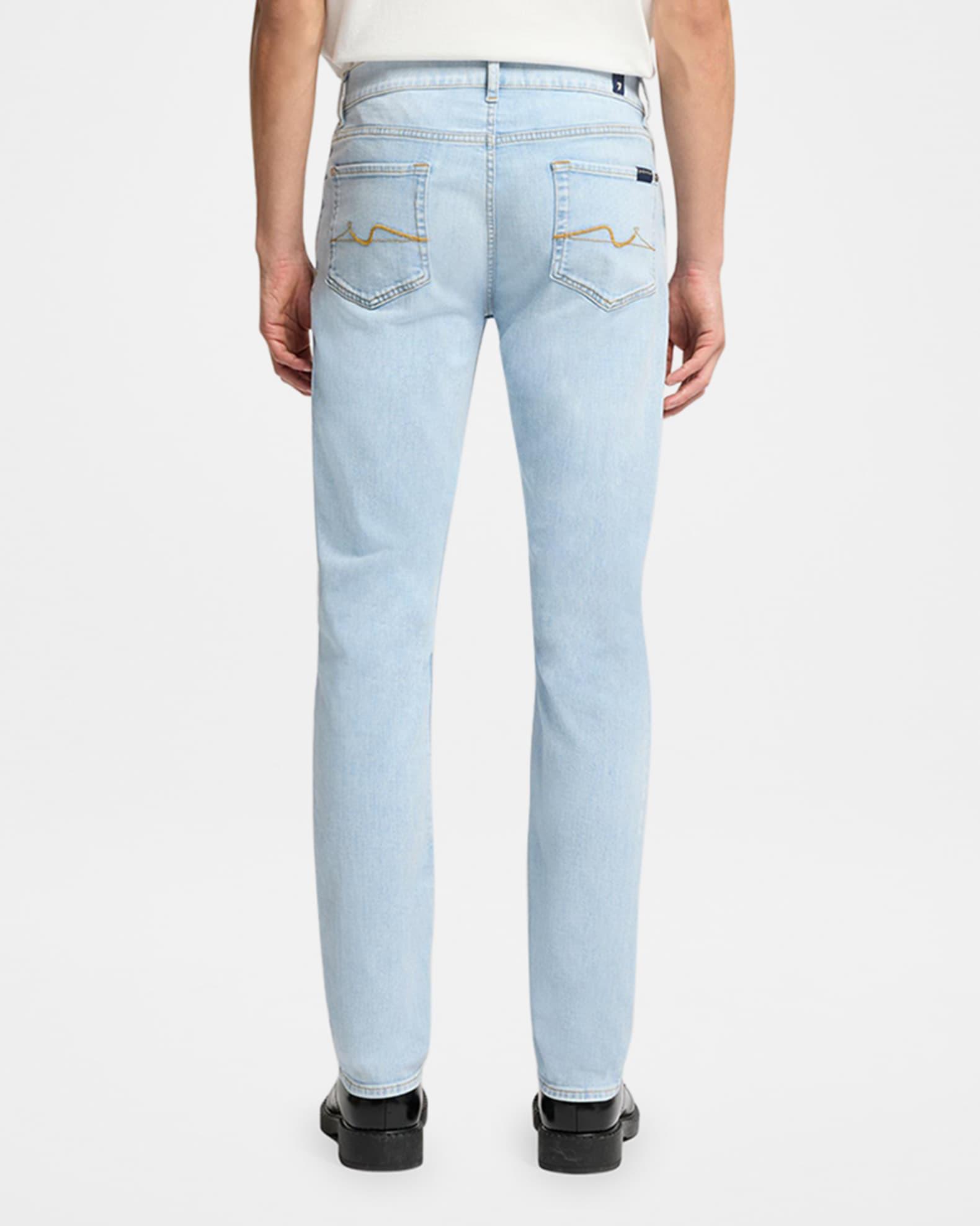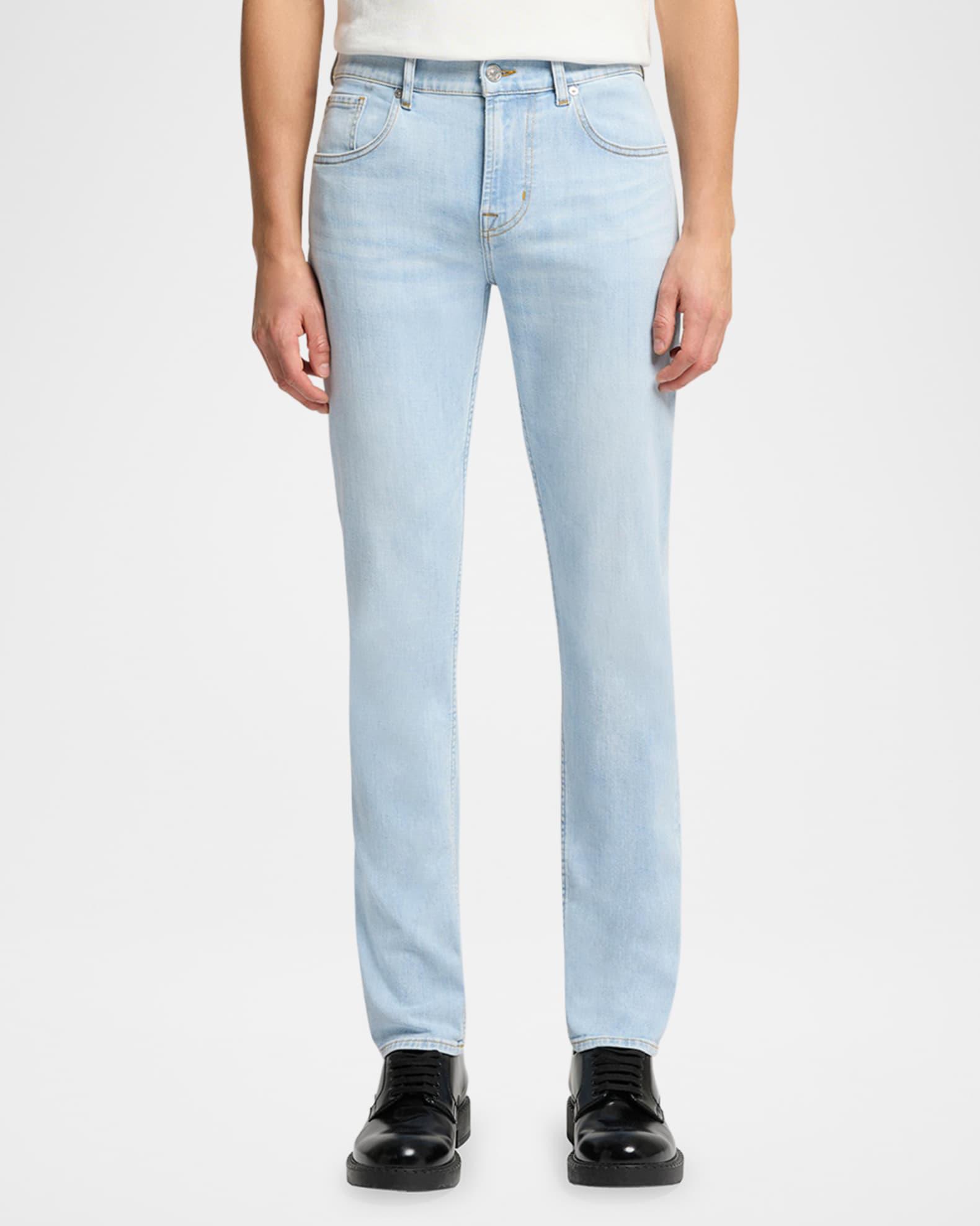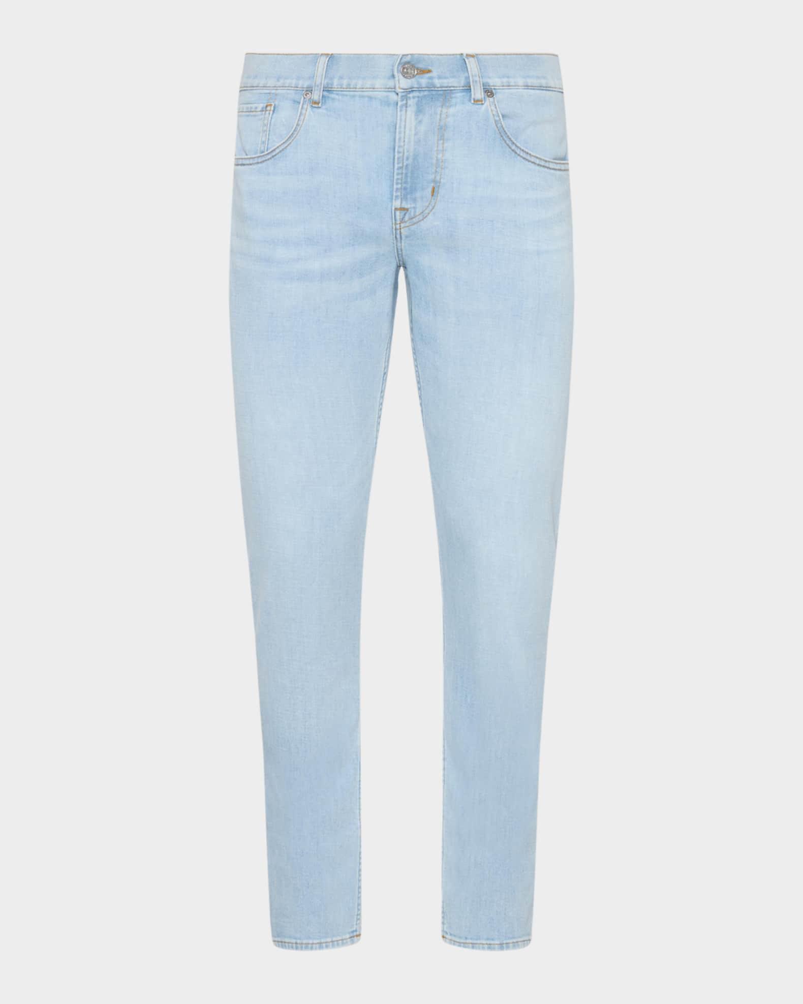 7 For All Mankind "Slimmy" jeans crafted from Left Hand Denim, featuring a reverse weave and ultra-soft feel Regular rise Five-pocket style Full length Slim, tapered legs Button/zip closure; belt loops Cotton/elasterell-p/elastane Machine wash cold, line dry, wash inside out, wash separately Made in USA Model is 6'1"/185cm.