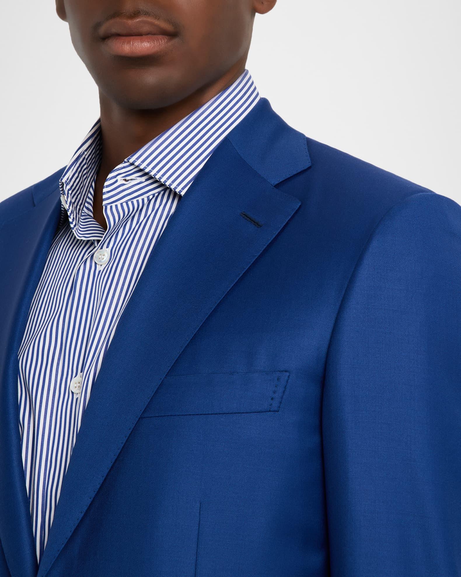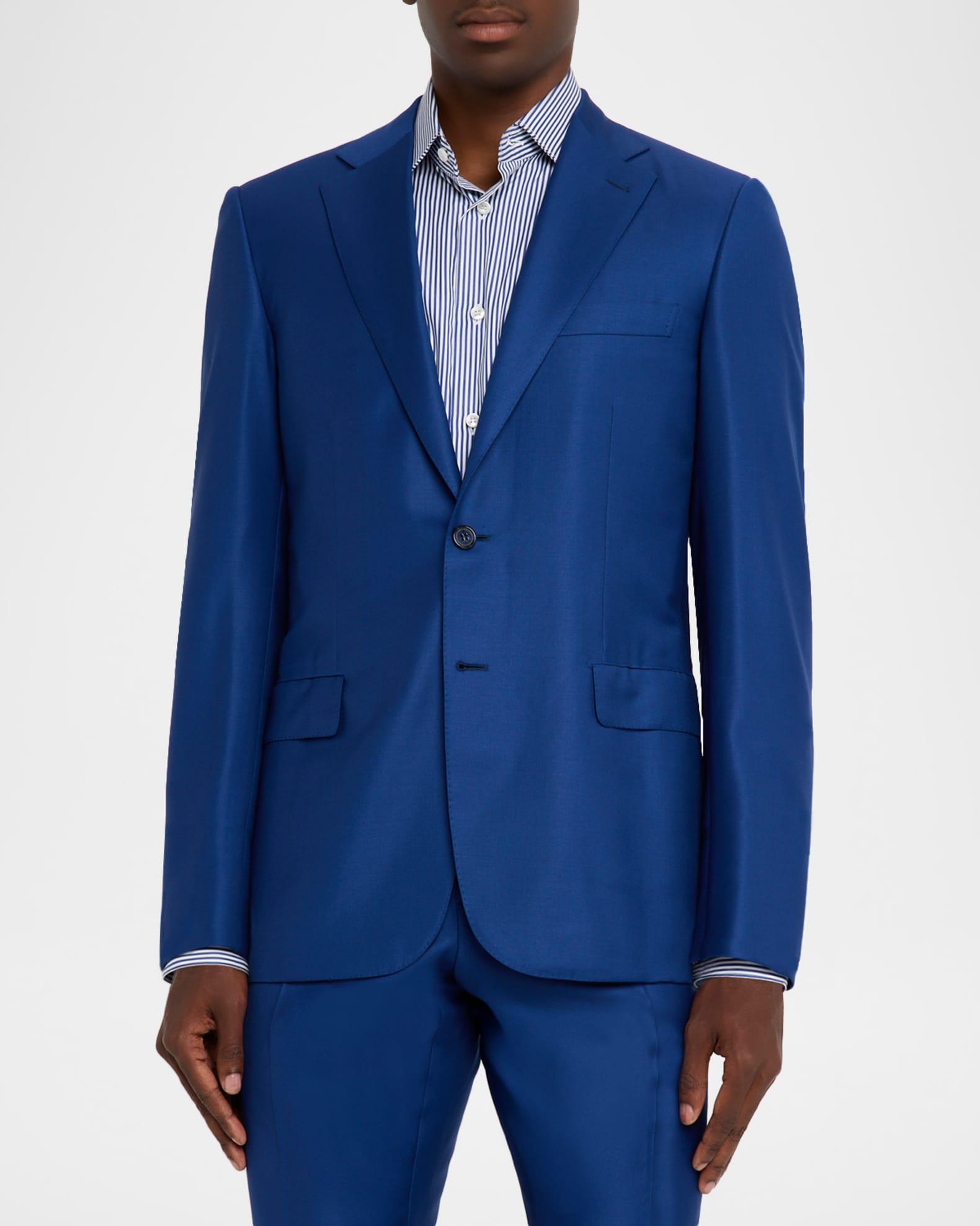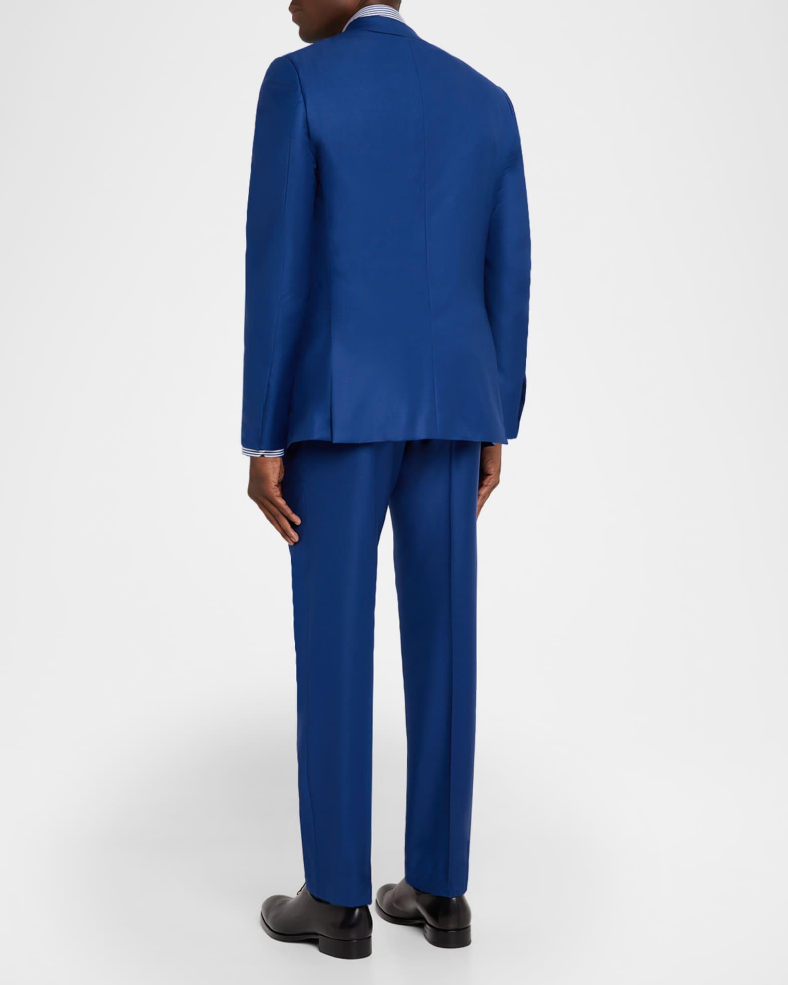 Brioni suit in a solid blue Notch lapels; single-breasted front Long sleeves; unfinished cuffs Chest welt pocket Hip flap pockets Tailored fit Double walking vent Regular rise Angled side slip pockets Back welt pockets Classic fit Full length Button/zip fly; belt loops Wool Dry clean Made in Italy