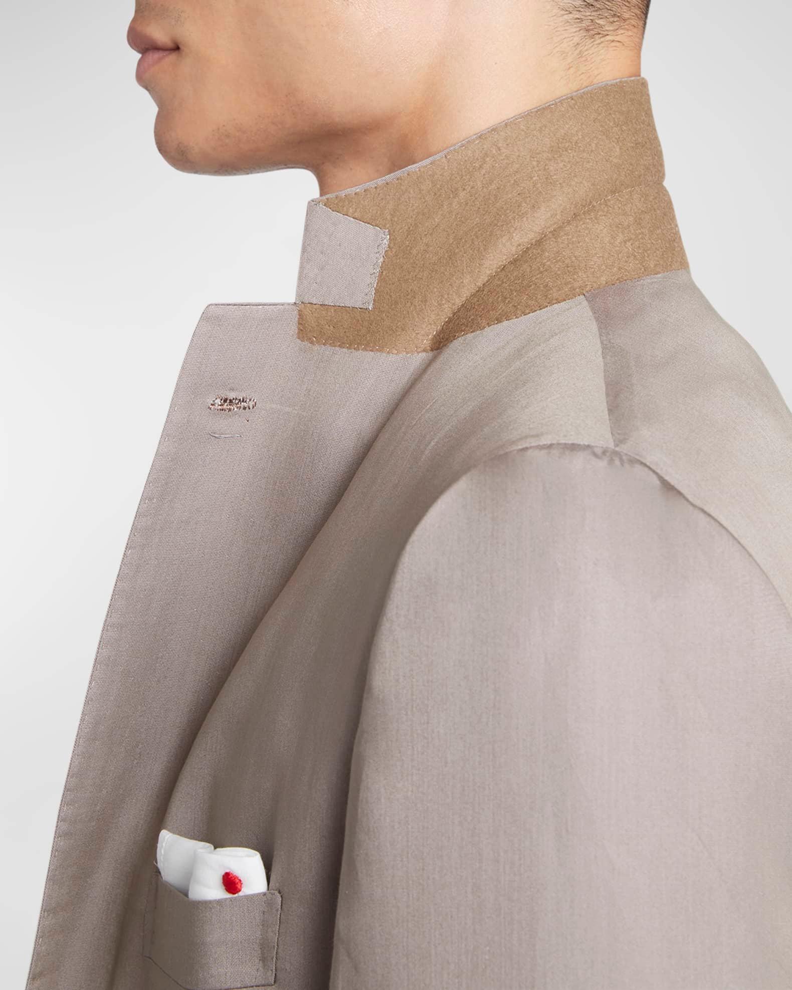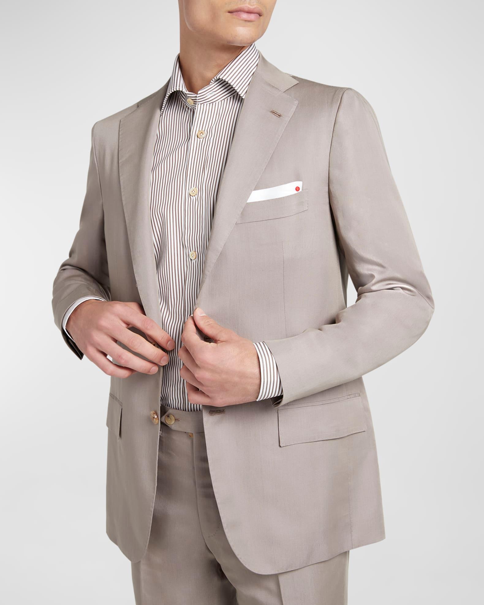 Mens solid suit byKiton Notched lapels; three-button closure Chest welt pocket Side flap pockets Unfinished sleeves Double-vented back Straight-leg trousers Unfinished hem to be tailored to desired length Lyocell/viscose Dry clean Made in Italy