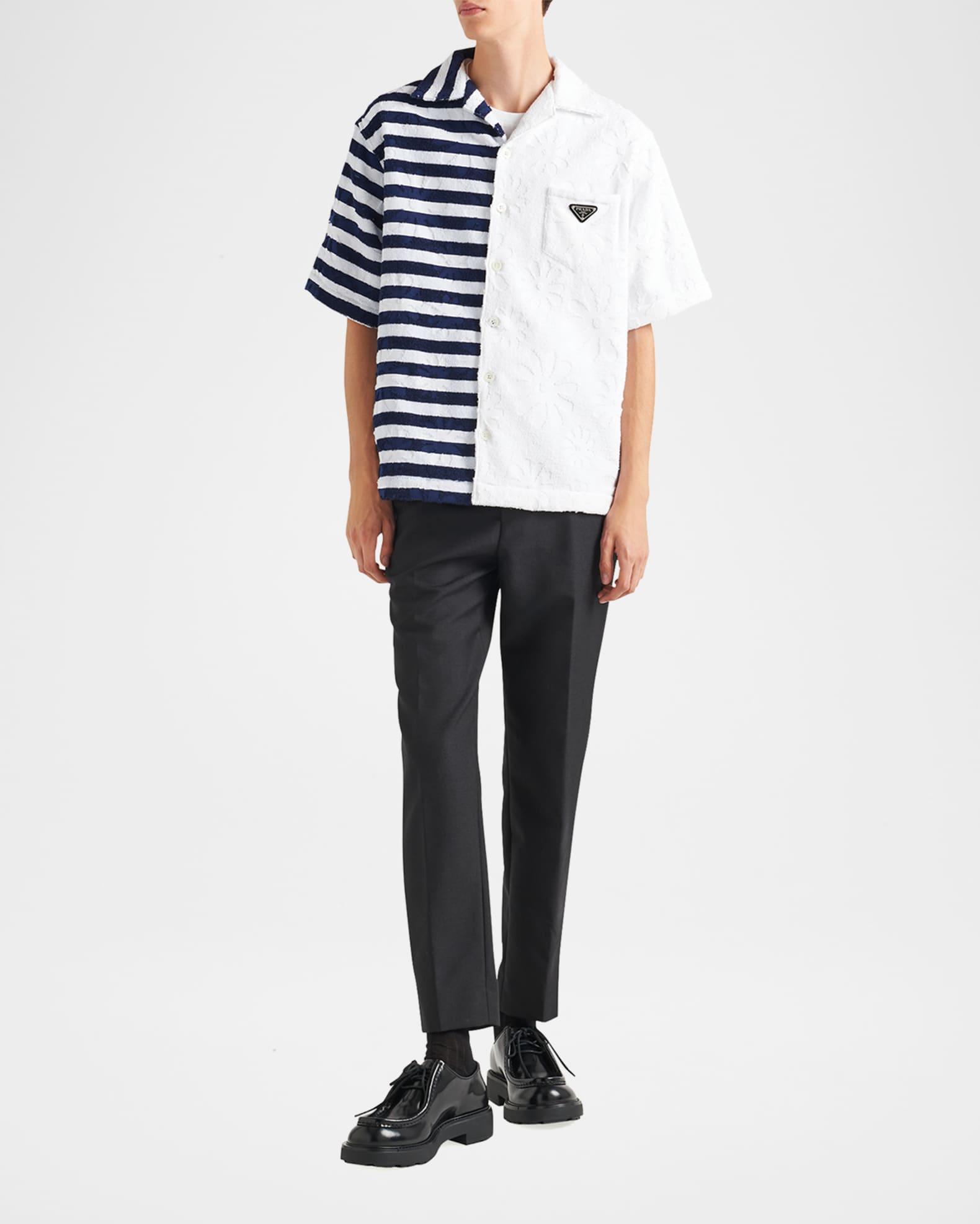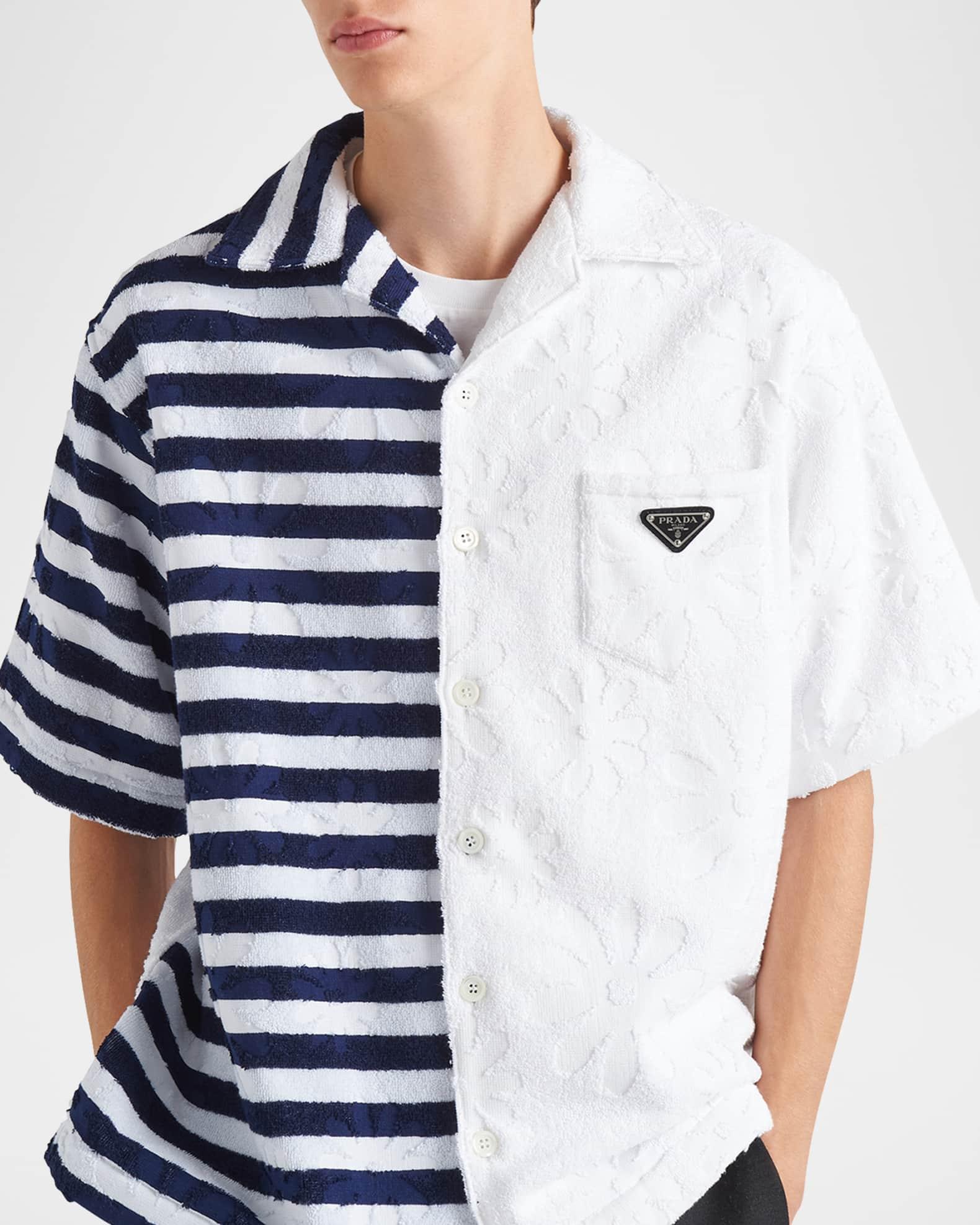 Prada sport shirt in contrasting terry panels, creating a play of duality and juxtaposition that is emblematic of the brand Camp collar; button closure Chest patch pocket with enameled metal triangle logo Short sleeves Oversized fit Cotton Imported