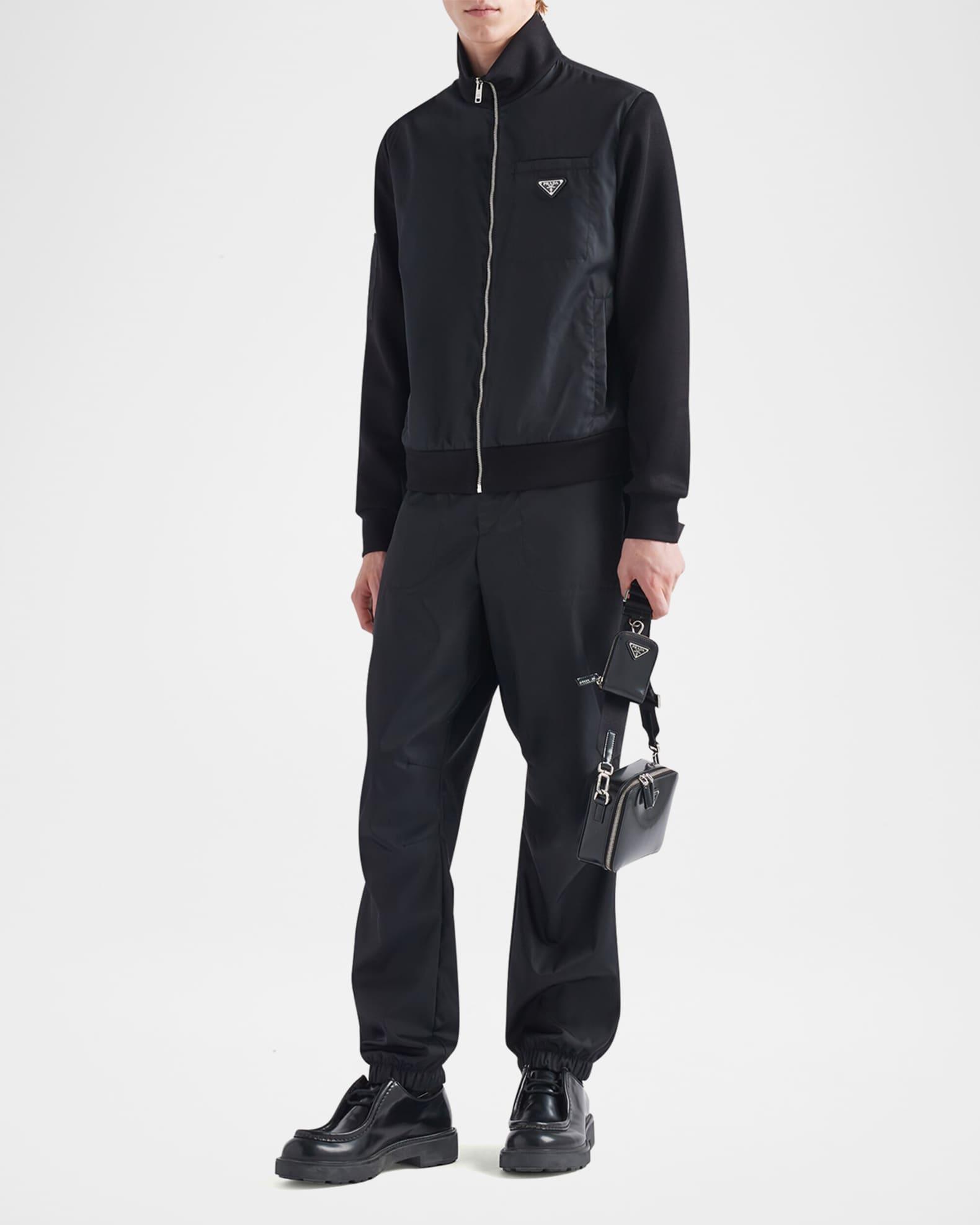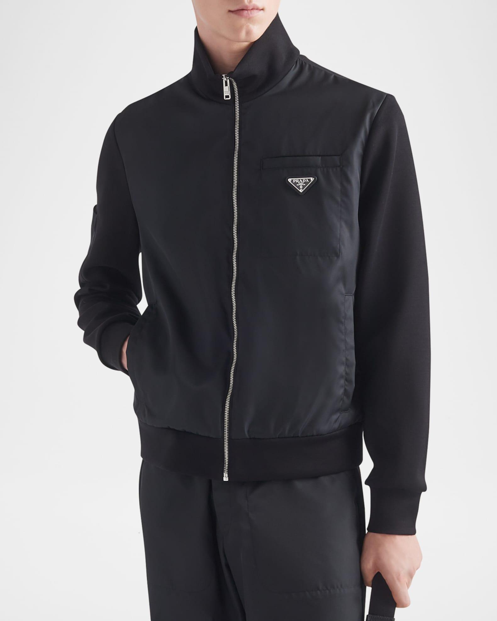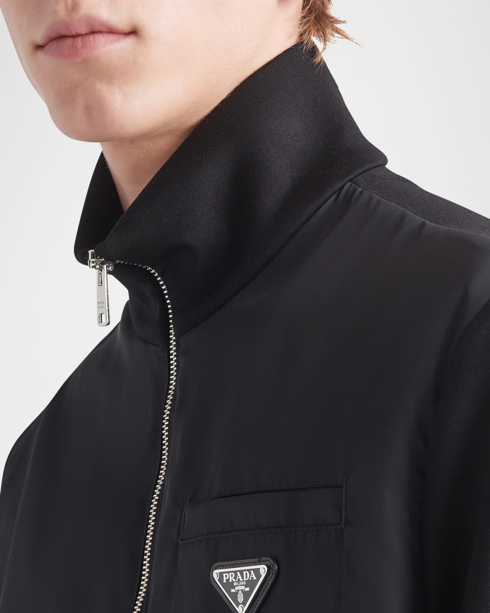 Prada fleece jacket with Re-Nylon details Re-nylon is a regenerated yarn produced from recycled plastic trash collected in the ocean Stand collar Zip front Chest patch pocket Signature metal triangle logo Long sleeves Sleeve patch pocket Side welt pockets Nylon/polyamide/cotton/polyester Imported