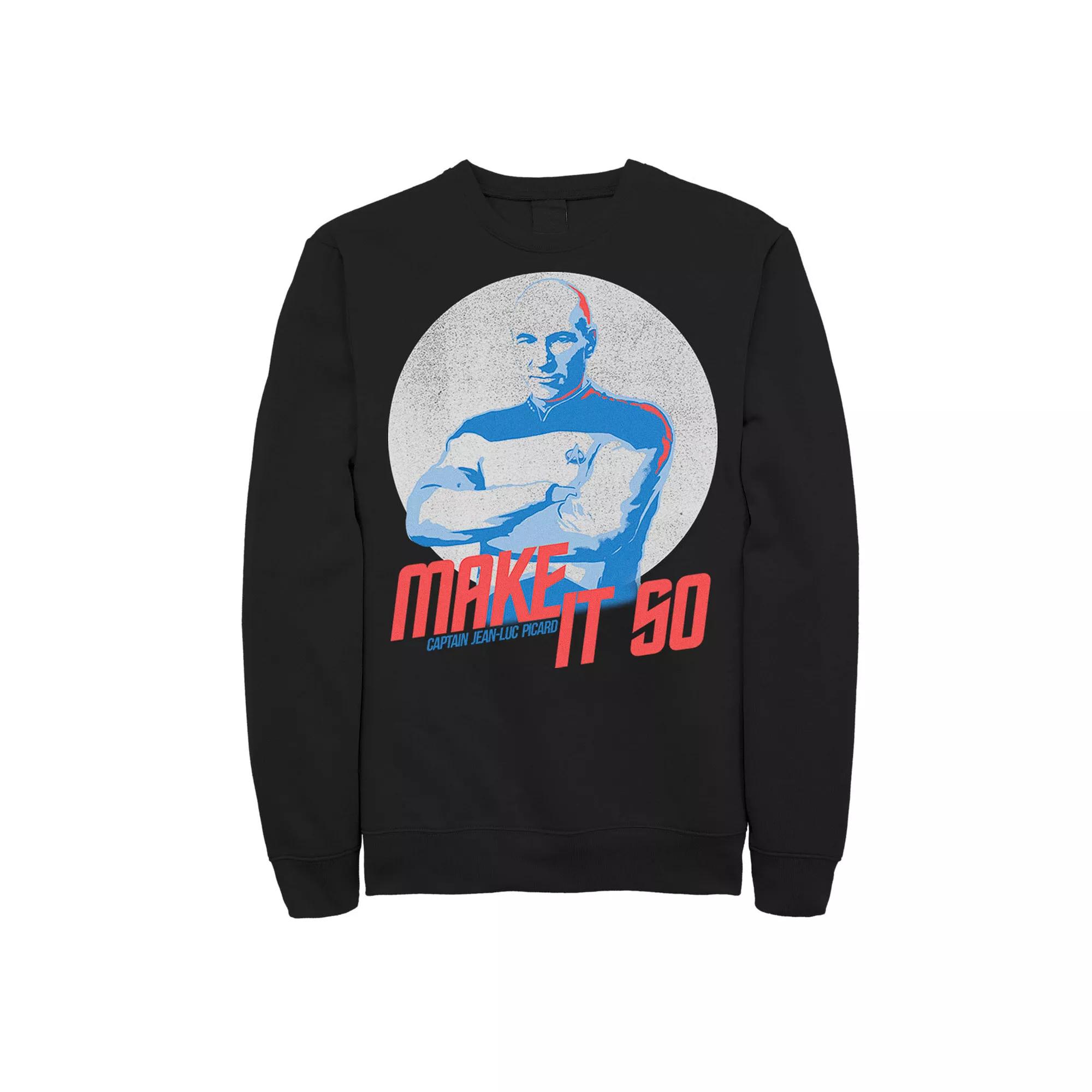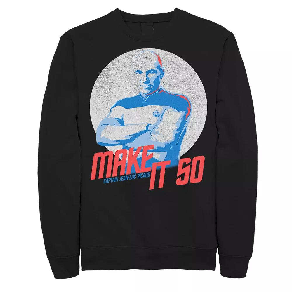 Make it so with a Fifth Sun™ Star Trek The Next Generation sweatshirt! Help the crew of the USS Enterprise-D convince the god-like alien, Q, of humanity's worth by showing him an awesome Next Generation style with Captain Jean-Luc Picard, Riker, and Data. | Star Trek Men's Make It Pop Graphic Crew Fleece Sweatshirt, Black, 3Xl