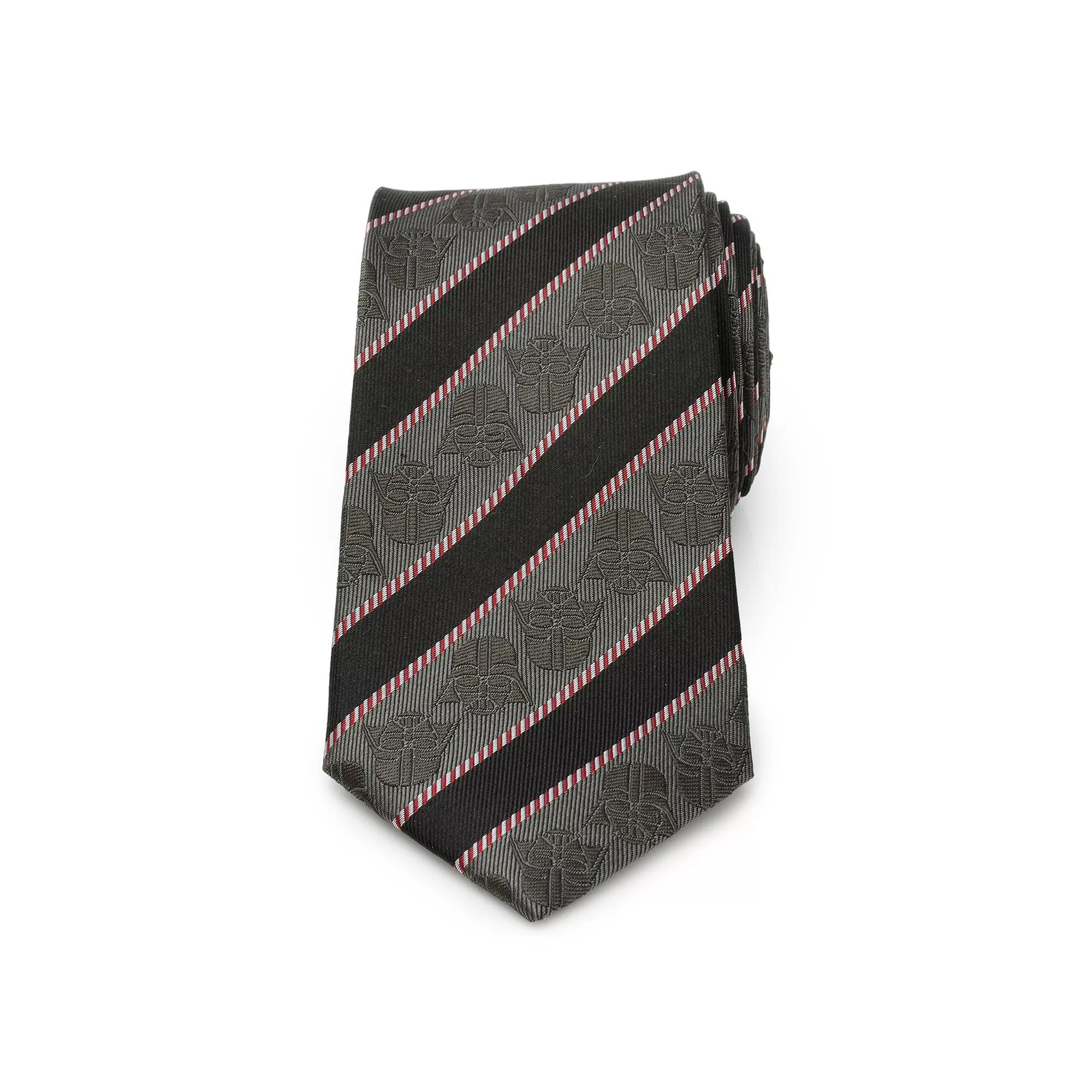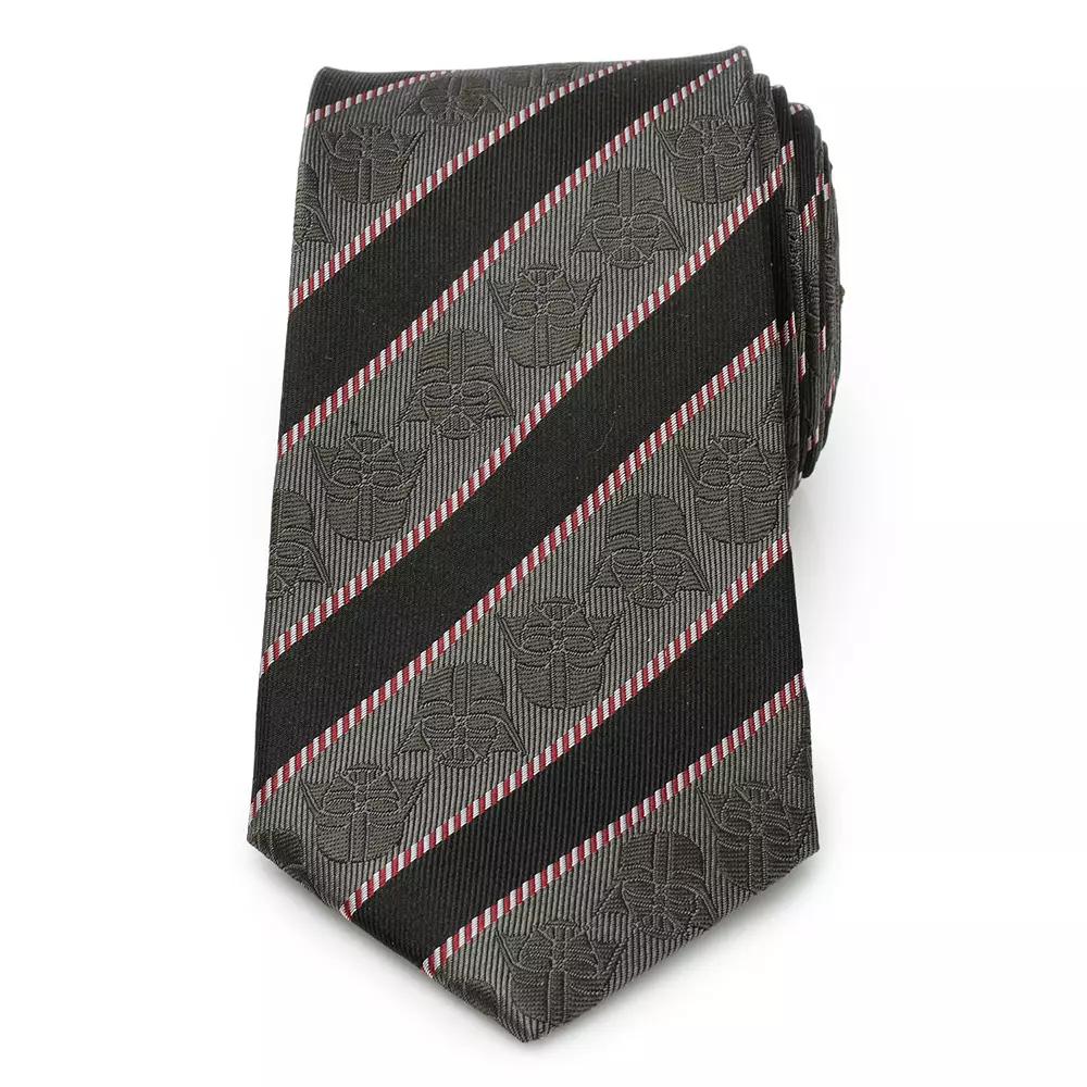 Alternating gray tonal Vader Helmets compliment the stripe pattern on this silk blend tie. Black stripes are accented by a red and white border, creating a subtle pop of color to the subdued tones of the tie. Pairs with any of our Darth Vader products. Officially licensed by LucasFilm LTD. | Star Wars Men's Vader Black Stripe Tie