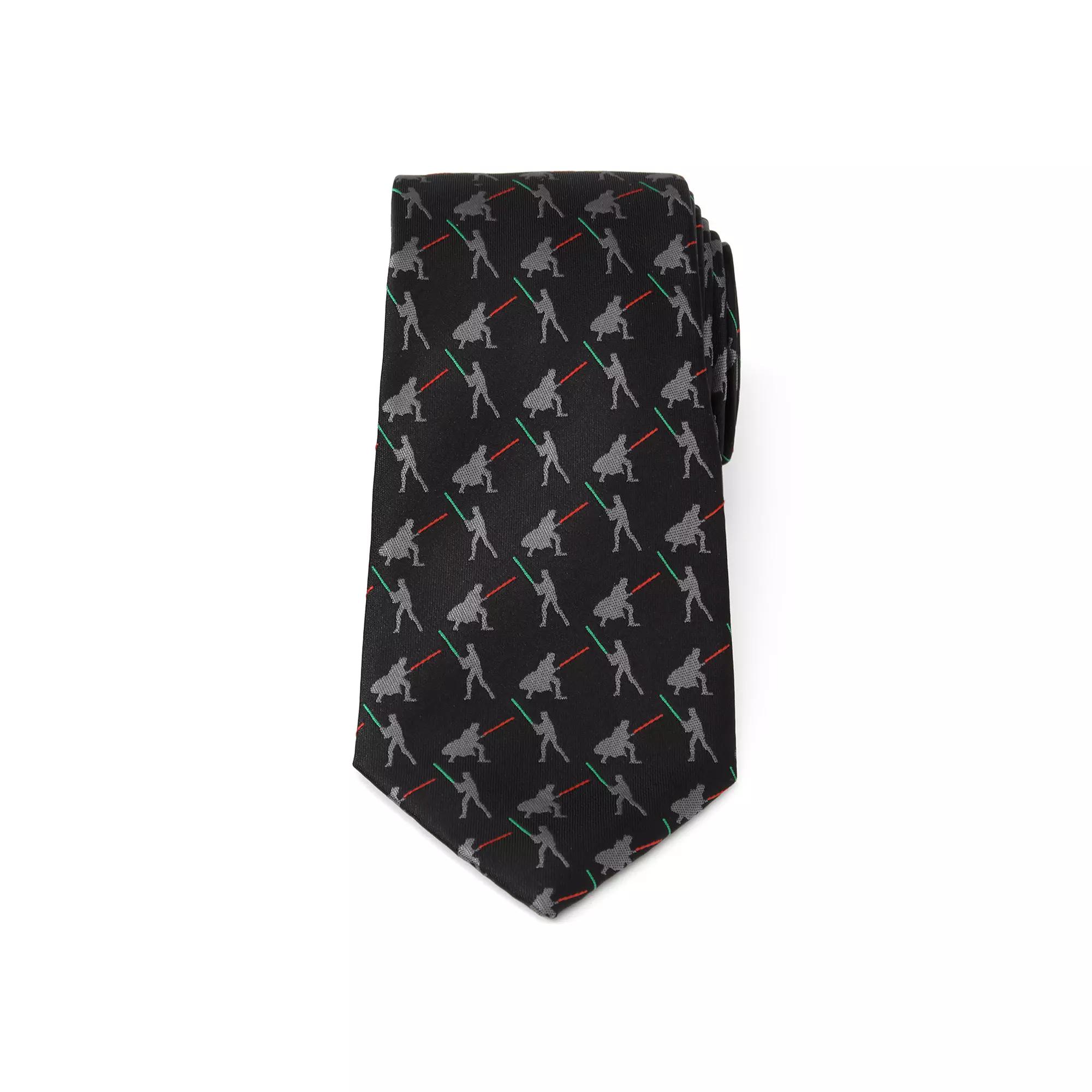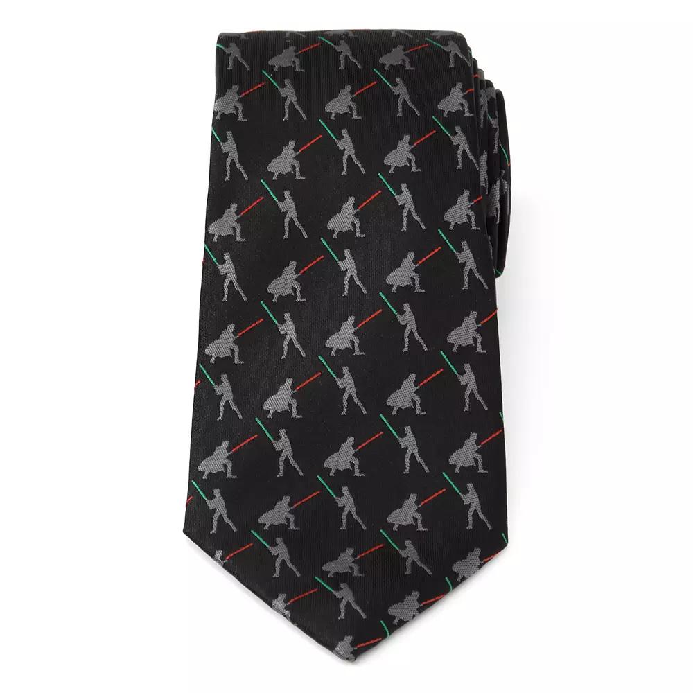 A legendary battle between the forces of good and evil. The green of the Jedi and the red of the Sith stand out against the black base of this tie. Do you have what it takes to fight? Choose your side and pair it with any of our matching Sith or Jedi items. Officially licensed by Lucasfilm LTD. | Star Wars Men's Vader V. Luke Battle Lightsaber Black Tie