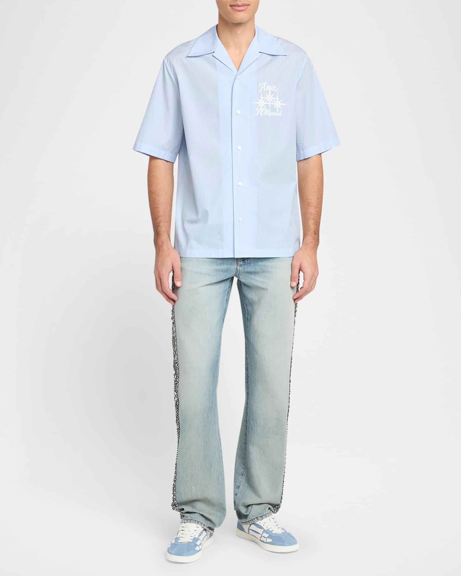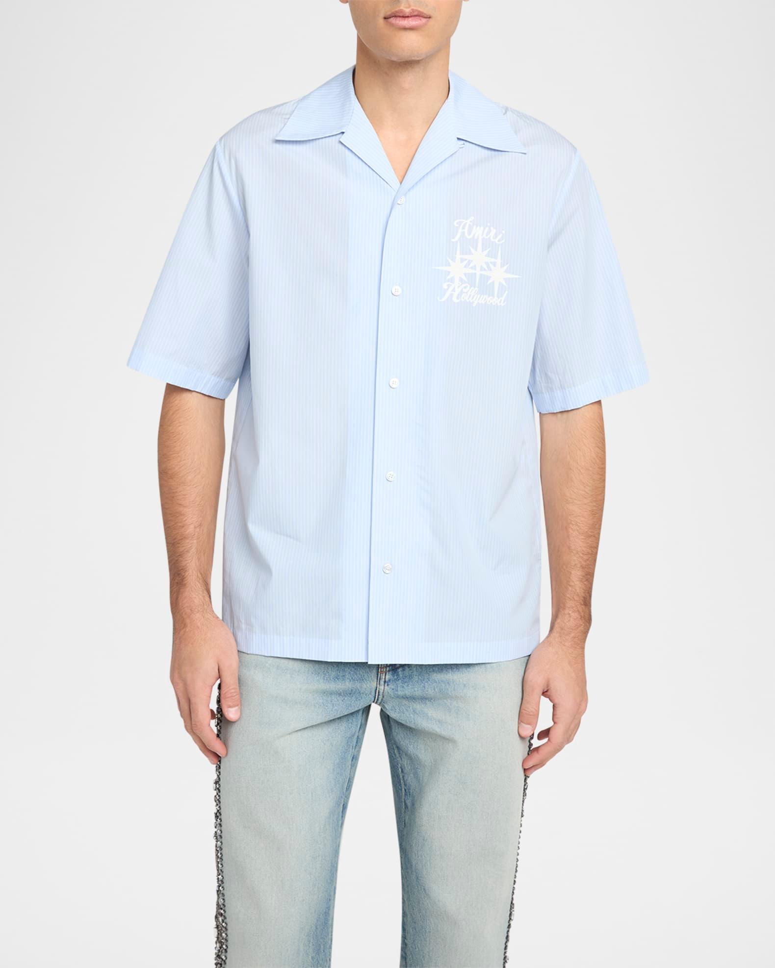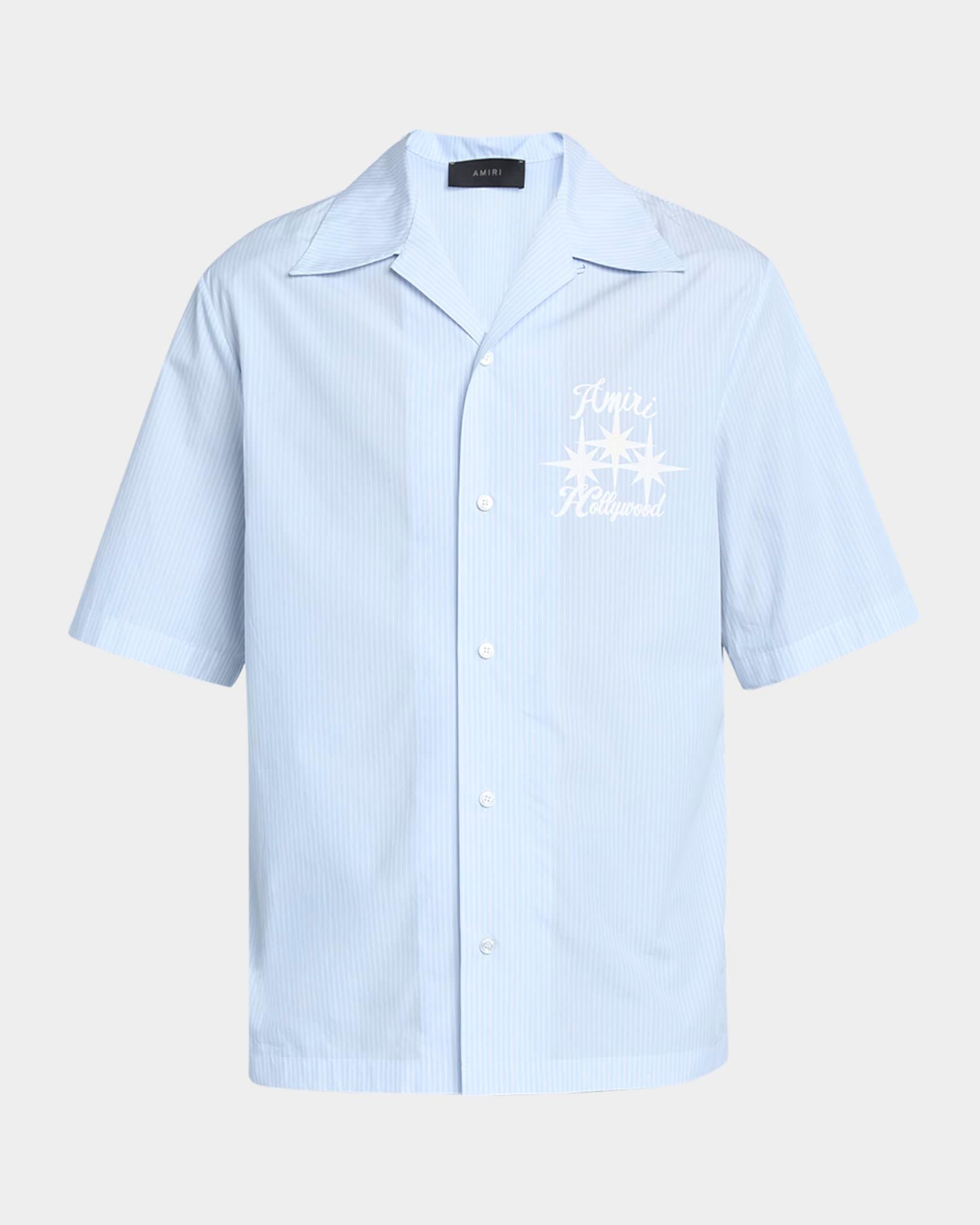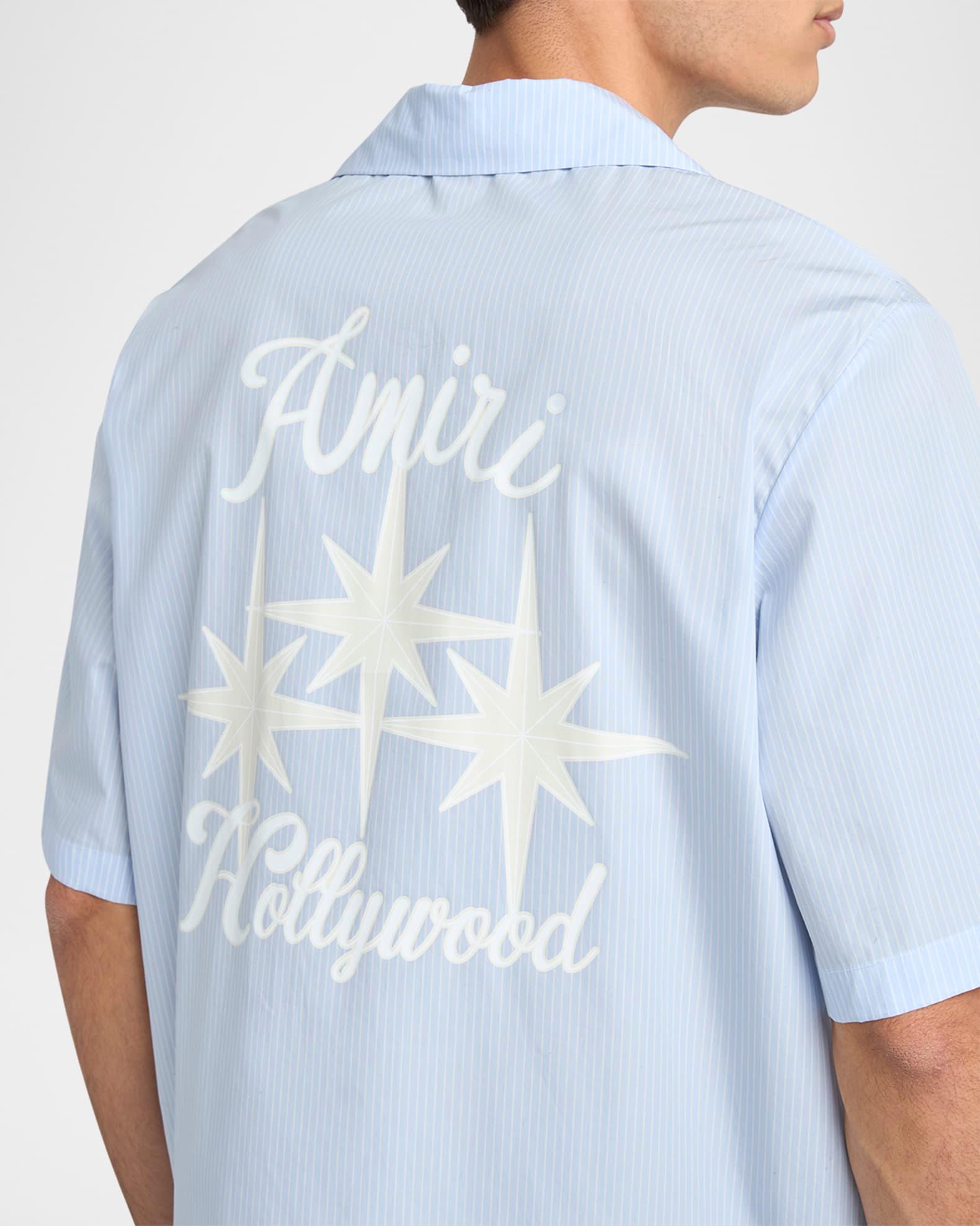 Amiri camp shirt in cotton poplin adorned with thin pencil stripes Starburst Amiri Hollywood motif on the chest and back Logo stitching on the back neck Notch collar Button placket Short sleeves Straight hem Boxy fit Cotton Dry clean Made in Italy