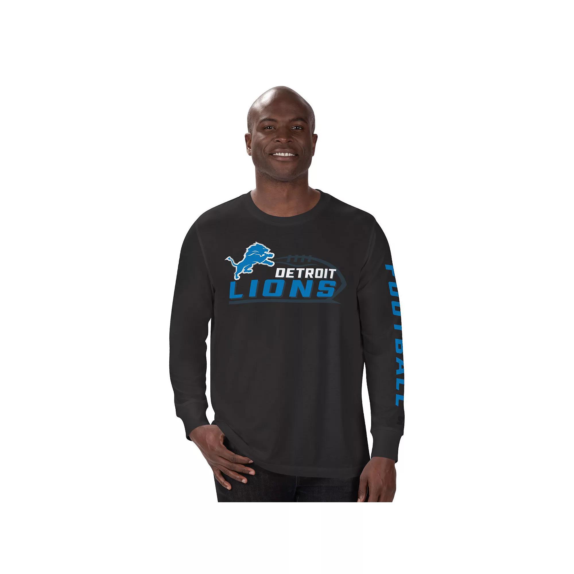 Gear up for game day with this Detroit Lions Half Time Long Sleeve T-Shirt. Crafted by Starter, it features eye-catching team graphics over a classic design. In the stands or on the couch, cheer on the Detroit Lions with this sleek shirt.Gear up for game day with this Detroit Lions Half Time Long Sleeve T-Shirt. Crafted by Starter, it features eye-catching team graphics over a classic design. In the stands or on the couch, cheer on the Detroit Lions with this sleek shirt.PRODUCT FEATURESOfficially licensedBrand: StarterScreen print graphicsImportedMachine wash, tumble dry lowCrew neck provides a traditional look and is comfortable to wear all dayMaterial: 60% Cotton/40% PolyesterLong sleeveTagless collar Color: Black. Gender: male. Age Group: adult.