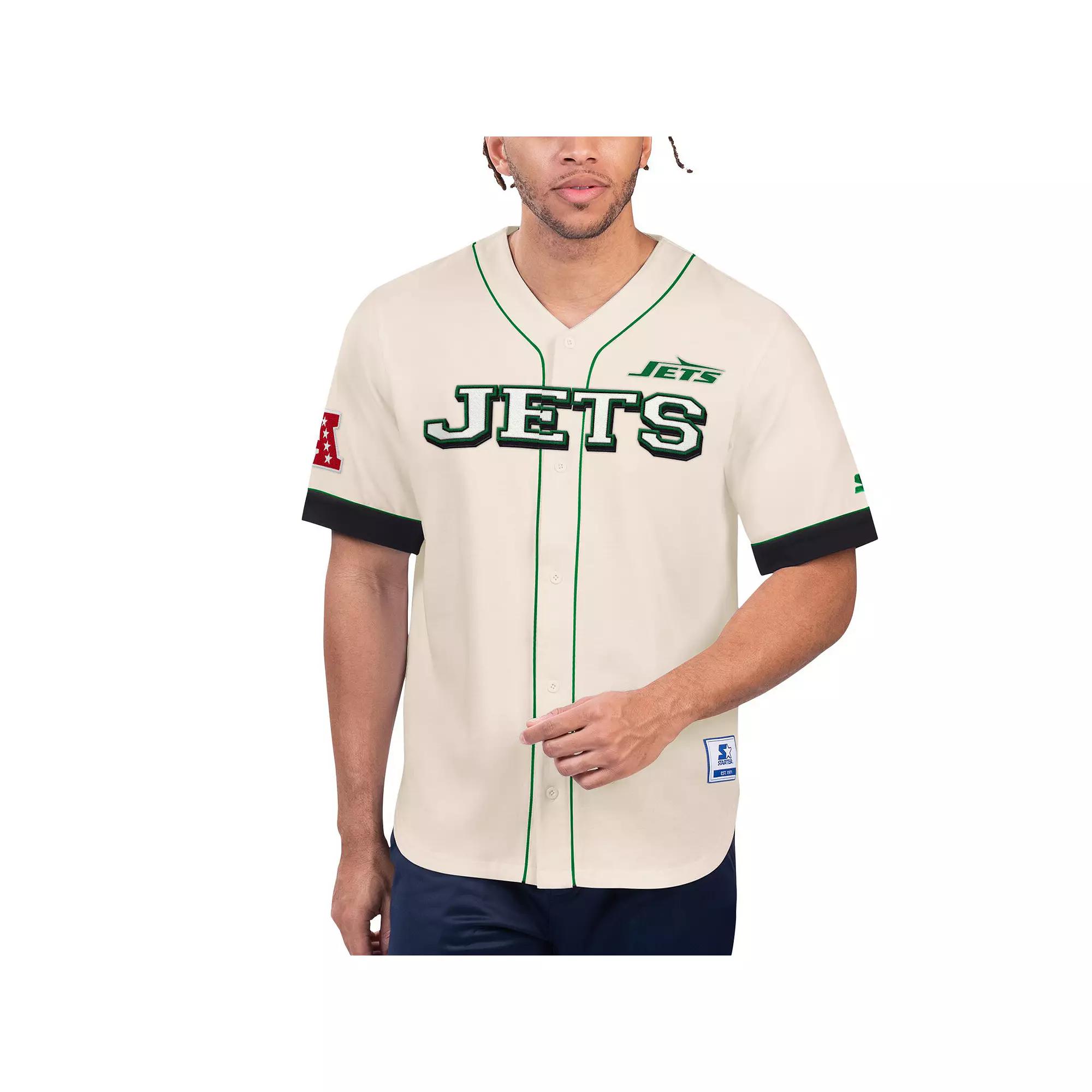 The next time your New York Jets hit the field, support them in a bold new way with this Relay Vintage Baseball Top from Starter. It features an embroidered throwback fabric applique and piping in an eye-catching team color. This crossover top brings the full-button style seen on the baseball diamond to the football gridiron, making it a must-have piece of gear to proudly display your New York Jets fandom. Rounded hem Machine wash with garment inside out, tumble dry low Short sleeve Officially licensed Brand: Starter Embroidered fabric appliques Imported Full-button front Material: 100% Cotton