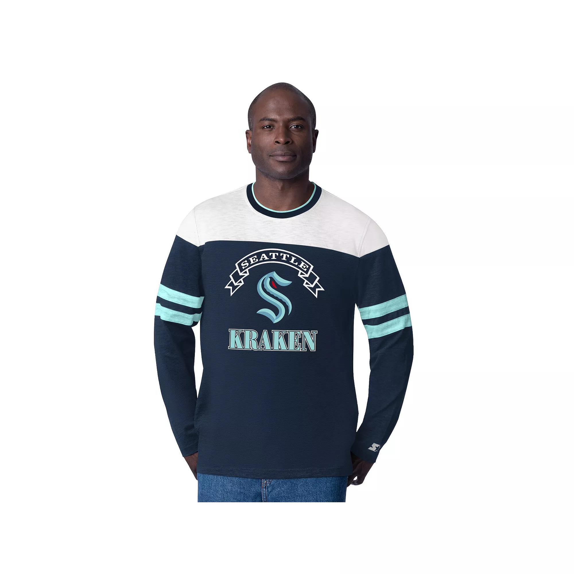 Channel the vintage vibes of your favorite hockey team with the Seattle Kraken Blitz Durene Long Sleeve T-Shirt from Starter. Featuring screen print Seattle Kraken graphics with a self-fabric team wordmark applique at the front, everyone will know who you're rooting for. Its rib-knit crew neck and droptail hem provide a classic look and flattering fit.Channel the vintage vibes of your favorite hockey team with the Seattle Kraken Blitz Durene Long Sleeve T-Shirt from Starter. Featuring screen print Seattle Kraken graphics with a self-fabric team wordmark applique at the front, everyone will know who you're rooting for. Its rib-knit crew neck and droptail hem provide a classic look and flattering fit.PRODUCT FEATURESOfficially licensedMachine wash, tumble dry lowMaterial: 55% Cotton/45% PolyesterRib-knit crew neck for a classic lookImportedBrand: StarterSewn-on stripes at sleevesScreen print team graphic with self-fabric team wordmark applique at frontLong sleeveDroptail hem for a flattering fit and ease of stylingScreen print team name at upper back Size: XL. Color: Krk Navy. Gender: male. Age Group: adult.