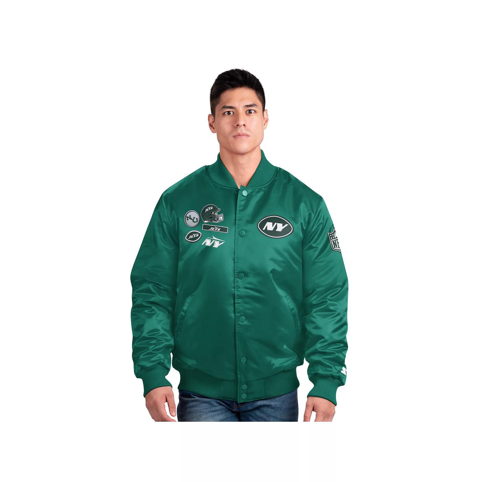 Showcase your devotion to the New York Jets by sporting this Exclusive Satin Full-Snap Varsity Jacket from Starter. It boasts tackle twill team appliques that make your fandom undeniable and a football player caricature on the lining for a surprising detail. Satin fabric creates a lustrous finish, making this New York Jets jacket a statement piece.Showcase your devotion to the New York Jets by sporting this Exclusive Satin Full-Snap Varsity Jacket from Starter. It boasts tackle twill team appliques that make your fandom undeniable and a football player caricature on the lining for a surprising detail. Satin fabric creates a lustrous finish, making this New York Jets jacket a statement piece.PRODUCT FEATURESMaterial: 100% PolyesterTackle twill team appliquesLocker loopRib-knit stand-up collar, cuffs and hemTwo side pocketsOfficially licensedImportedBrand: StarterFootball player caricature displayed down center of liningFull SnapSatin fabric creates a lustrous finishMidweight jacket suitable for moderate temperaturesLong sleeveMachine wash, line dry Color: Green. Gender: male. Age Group: adult.