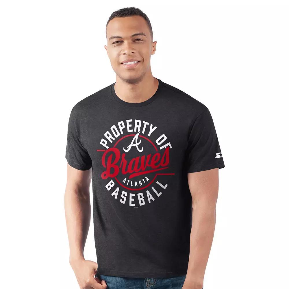 Rep your Atlanta Braves pride in effortless style with this Starter Prime Time Property Of T-Shirt. Made from a blend of soft cotton and durable polyester, this tee provides a comfortable feel that's perfect for all-day wear. The bold screen-printed Atlanta Braves graphics on the chest leave no doubt about where your baseball allegiance lies.Rep your Atlanta Braves pride in effortless style with this Starter Prime Time Property Of T-Shirt. Made from a blend of soft cotton and durable polyester, this tee provides a comfortable feel that's perfect for all-day wear. The bold screen-printed Atlanta Braves graphics on the chest leave no doubt about where your baseball allegiance lies.PRODUCT FEATURESBrand: StarterCrew neckShort sleeveImportedScreen print team graphics at chestMachine wash, tumble dry lowOfficially licensedMaterial: 60% Cotton/40% Polyester Color: Navy. Gender: male. Age Group: adult.
