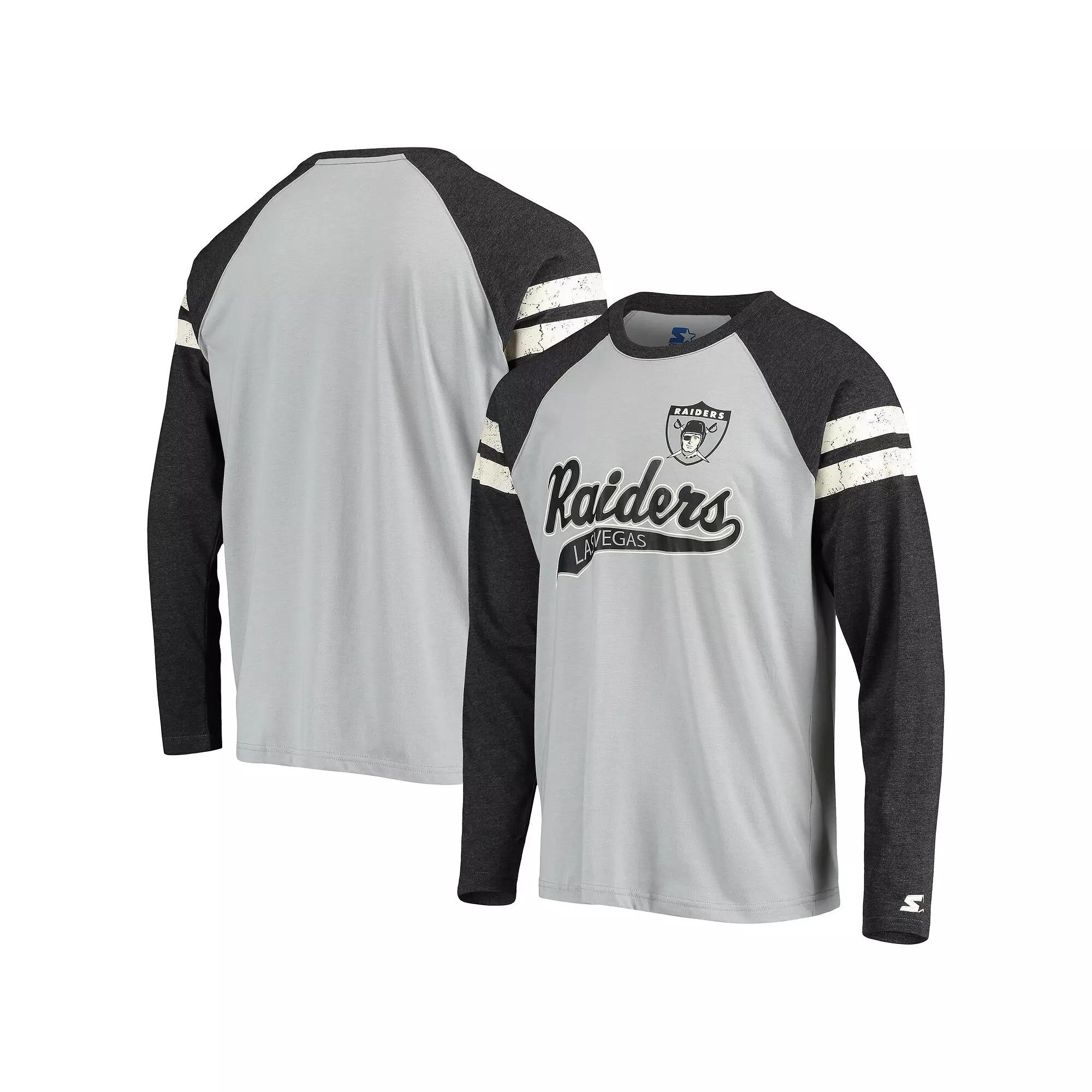 Give your wardrobe a stylish Las Vegas Raiders upgrade with this Throwback League Tri-blend T-shirt. Featuring a bold wordmark and a throwback Las Vegas Raiders logo, this Starter tee features a relaxed construction thanks to its raglan sleeves. Keep comfortable while you rep your gridiron favorites in this distinct tee.Give your wardrobe a stylish Las Vegas Raiders upgrade with this Throwback League Tri-blend T-shirt. Featuring a bold wordmark and a throwback Las Vegas Raiders logo, this Starter tee features a relaxed construction thanks to its raglan sleeves. Keep comfortable while you rep your gridiron favorites in this distinct tee.Long sleeveImportedTagless CollarOfficially licensedCrew neckDistressed screen print stripesMachine wash with garment inside out, tumble dry lowMaterial: 50% Polyester/38% Cotton/12% RayonRaglan sleevesBrand: StarterScreen print graphics Color: LVR SILVER. Gender: male. Age Group: adult.