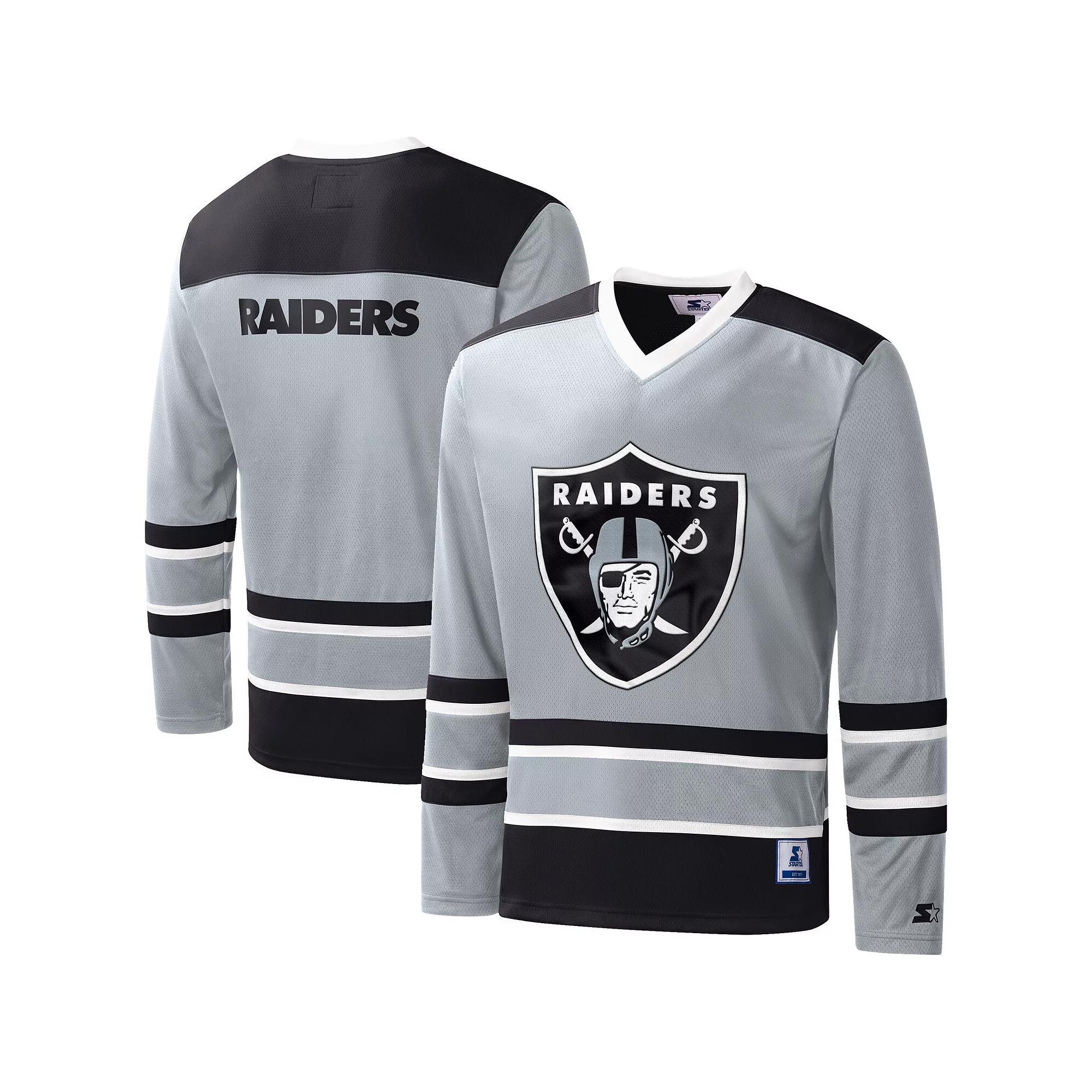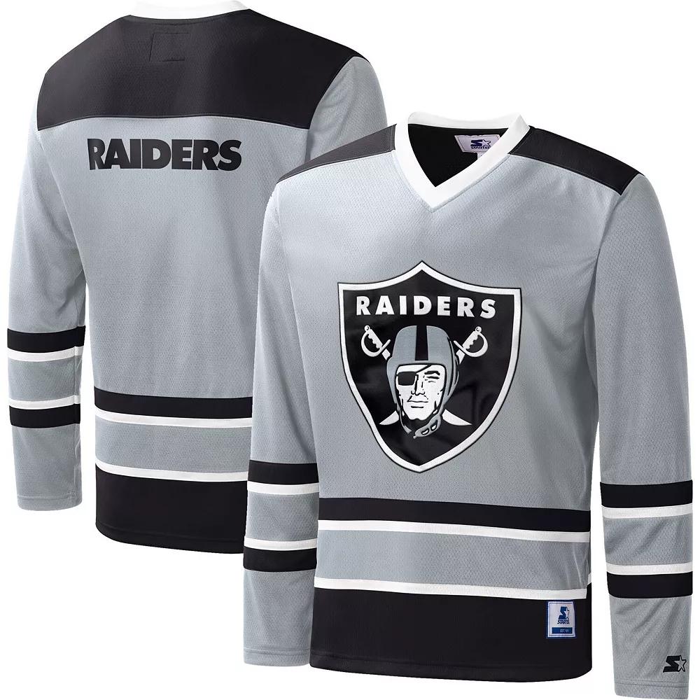 Display the colors of your Las Vegas Raiders loud and proud with this Cross-Check T-shirt from Starter. It features eye-catching Las Vegas Raiders graphics highlighted by the contrasting V-neck and stripes. Mesh fabric also provides a breathable feel for comfortable wearing all day.Display the colors of your Las Vegas Raiders loud and proud with this Cross-Check T-shirt from Starter. It features eye-catching Las Vegas Raiders graphics highlighted by the contrasting V-neck and stripes. Mesh fabric also provides a breathable feel for comfortable wearing all day.Material: 100% PolyesterLong sleeveTackle twill appliqueSewn-on stripesImportedScreen print graphicsMesh fabricV-neckMachine wash, tumble dry lowPulloverOfficially licensedBrand: StarterV-neck Size: 2XL. Color: Silver. Gender: male. Age Group: adult.