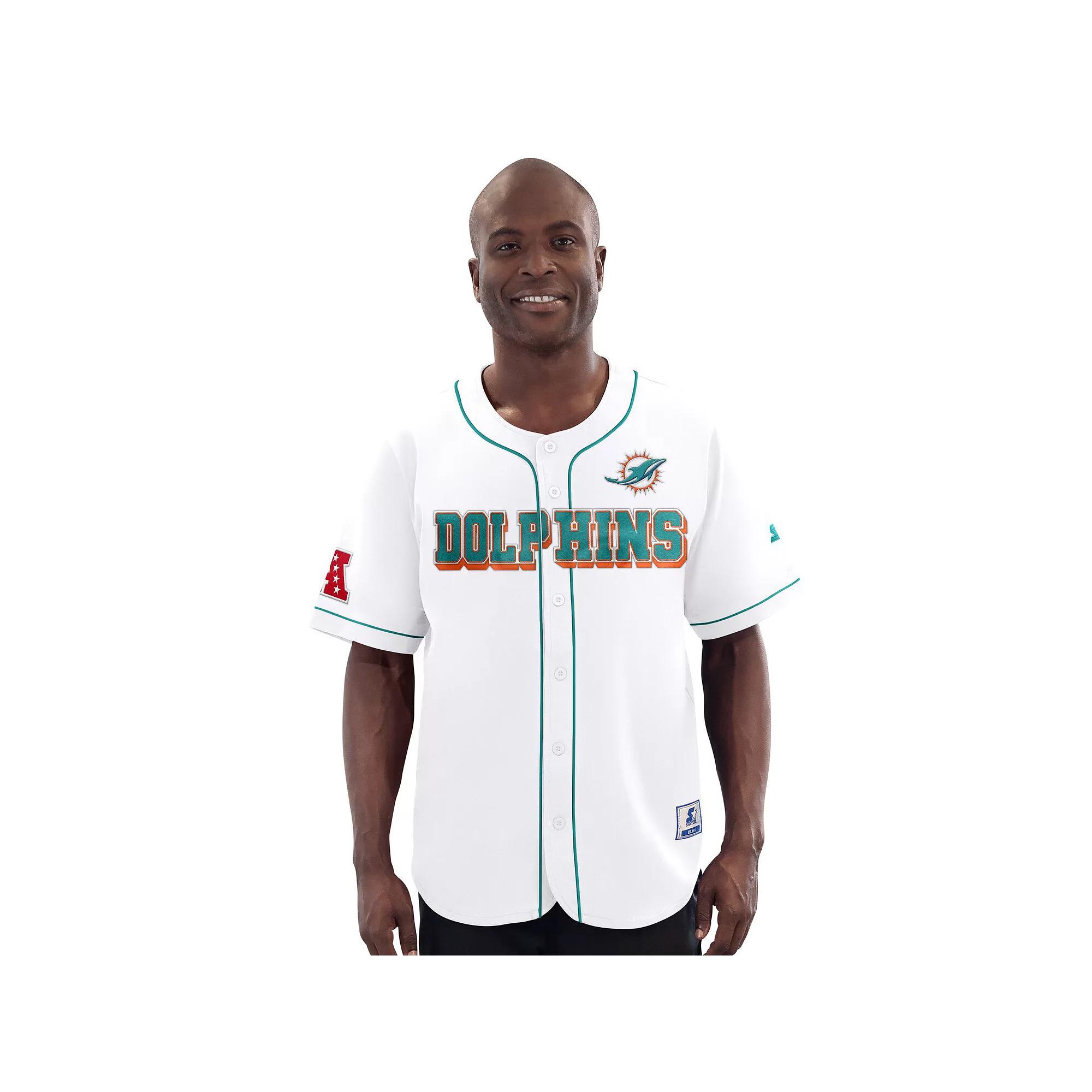 Channel classic baseball style while repping the Miami Dolphins with this Starter Relay Full-Button Baseball Jersey. Made from breathable 100% cotton, this baseball jersey provides a comfortable and classic fit for everyday wear. The embroidered fabric applique graphics add a touch of texture and dimension, showcasing your Miami Dolphins pride with a vintage athletic aesthetic.Channel classic baseball style while repping the Miami Dolphins with this Starter Relay Full-Button Baseball Jersey. Made from breathable 100% cotton, this baseball jersey provides a comfortable and classic fit for everyday wear. The embroidered fabric applique graphics add a touch of texture and dimension, showcasing your Miami Dolphins pride with a vintage athletic aesthetic.PRODUCT FEATURESImportedMachine wash with garment inside out, tumble dry lowFull-button frontTeam color pipingBrand: StarterSewn-on team wordmark applique across frontShort sleeveRounded droptail hem for freedom of movement and ease of stylingOfficially licensedMaterial: 100% CottonEmbroidered team logo at left chestConference applique at right sleeve Color: White. Gender: male. Age Group: adult.