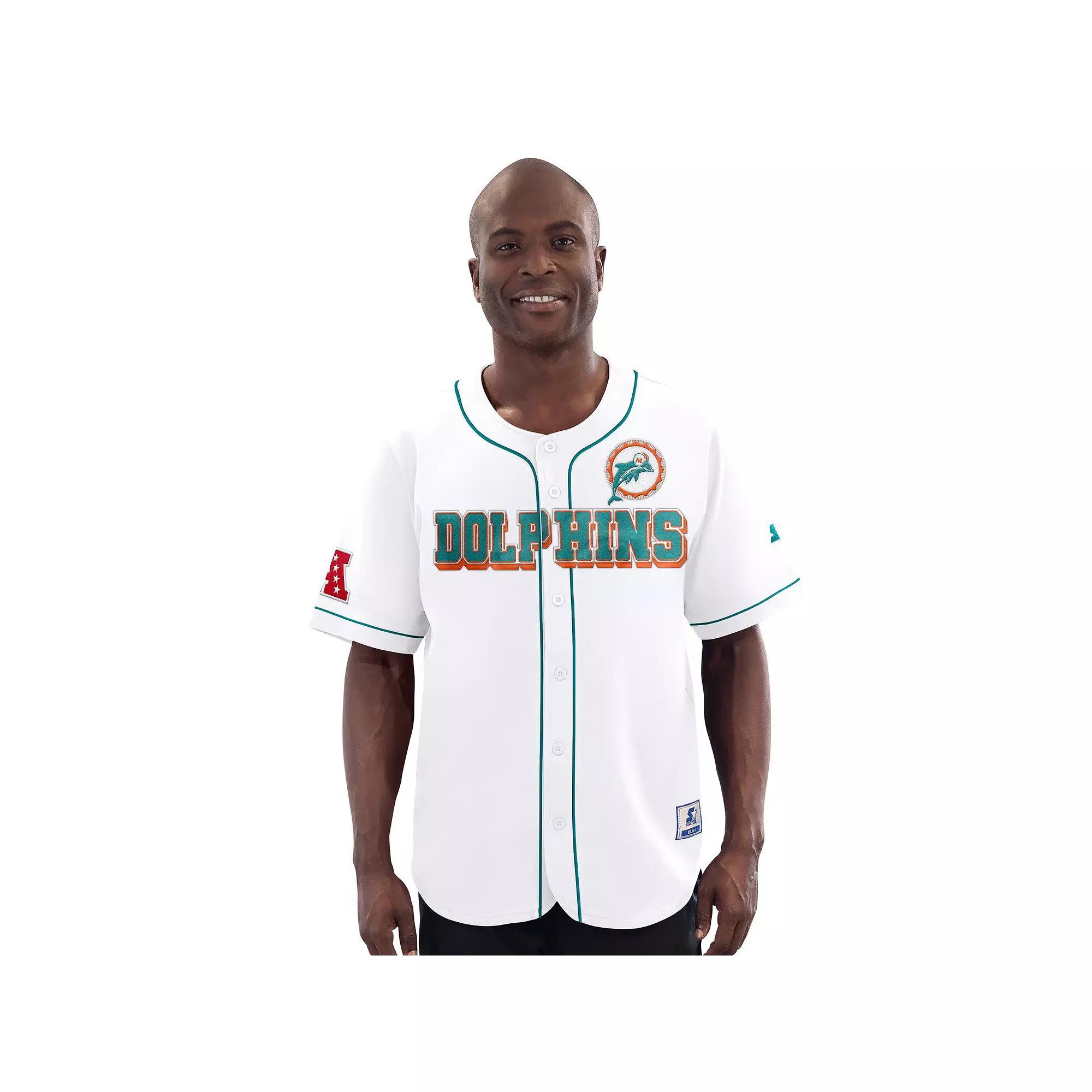 Channel the classic look of Miami Dolphins history with this Starter Relay Vintage Full-Button Baseball Jersey. The button-up design features team color piping and an embroidered team logo at the left chest for a classic, sporty aesthetic. Constructed from 100% cotton, this Miami Dolphins jersey offers a comfortable and breathable feel whether youre at the stadium or watching from home.Channel the classic look of Miami Dolphins history with this Starter Relay Vintage Full-Button Baseball Jersey. The button-up design features team color piping and an embroidered team logo at the left chest for a classic, sporty aesthetic. Constructed from 100% cotton, this Miami Dolphins jersey offers a comfortable and breathable feel whether youre at the stadium or watching from home.PRODUCT FEATURESTeam color pipingMachine wash with garment inside out, tumble dry lowSewn-on team wordmark applique across frontFull-button frontOfficially licensedShort sleeveBrand: StarterImportedMaterial: 100% CottonConference applique at right sleeveRounded droptail hem for freedom of movement and ease of stylingEmbroidered team logo at left chest Size: XL. Color: White. Gender: male. Age Group: adult.