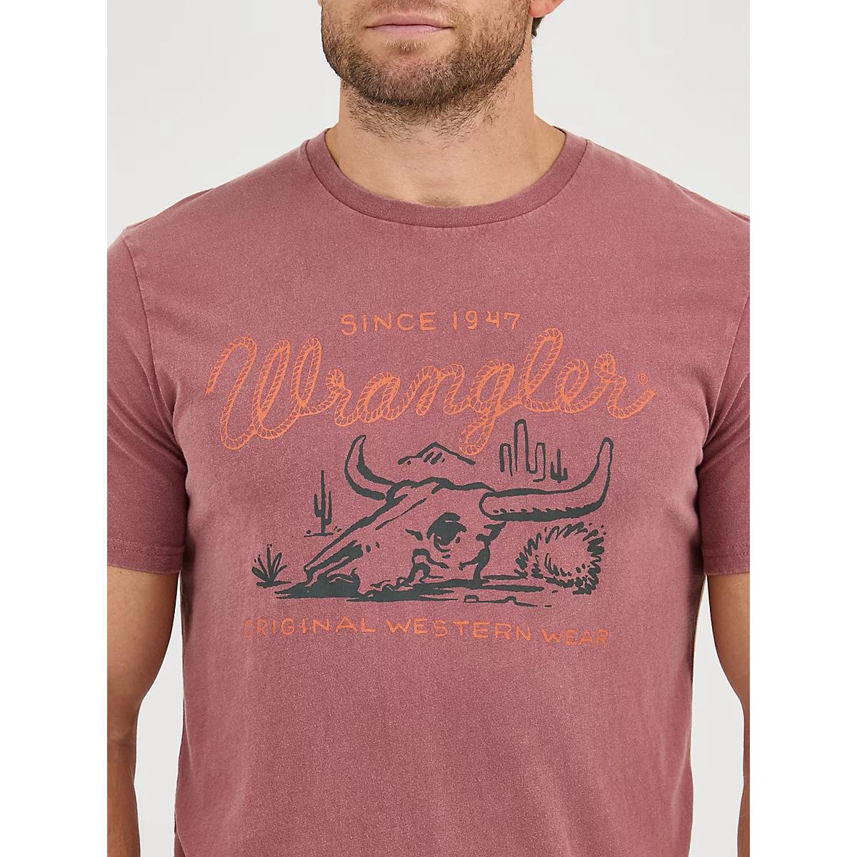 Nothing speaks to the spirit of the American west quite like a steer head. This sturdy tee holds up the legacy of Wrangler® in true form. It's made of a soft cotton with a vintage mineral wash for a vintage look that will keep you comfy all year long. Make this regular fit t-shirt the foundation of your casual outfit.