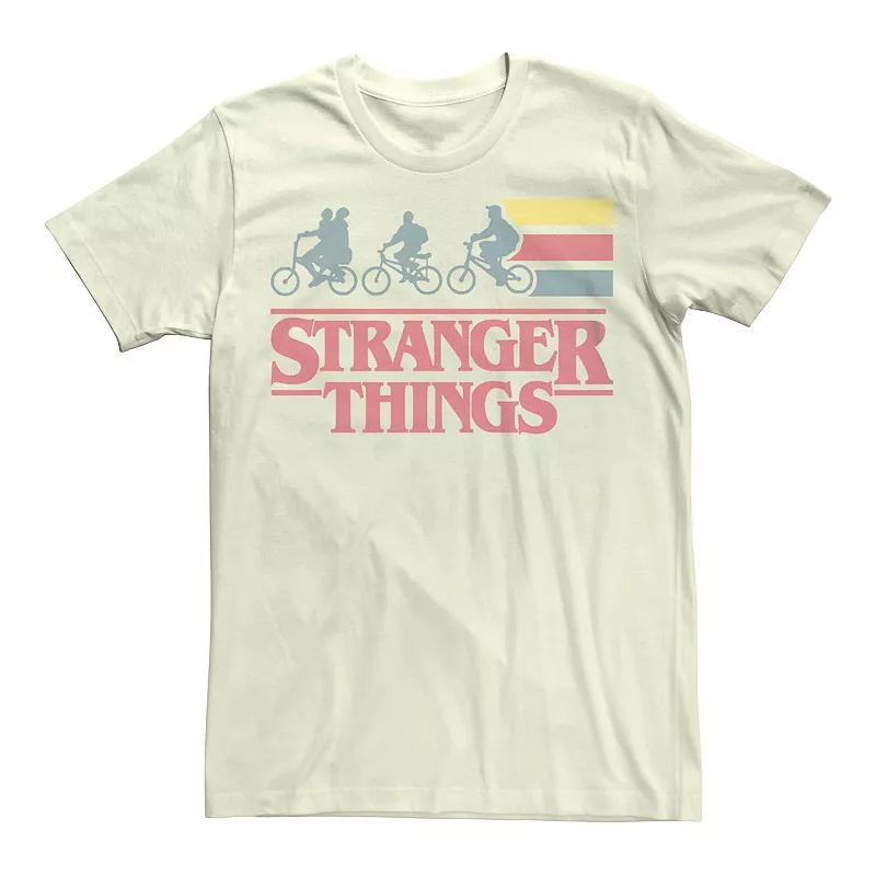 Hell love the look and feel of this Mens Stranger Things Bike Stripes Logo Graphic Tee. FEATURES Crewneck Short SleevesFABRIC & CARE Cotton Machine wash Imported Size: XS. Color: Natural. Gender: male. Age Group: adult. Material: Cotton Blend.