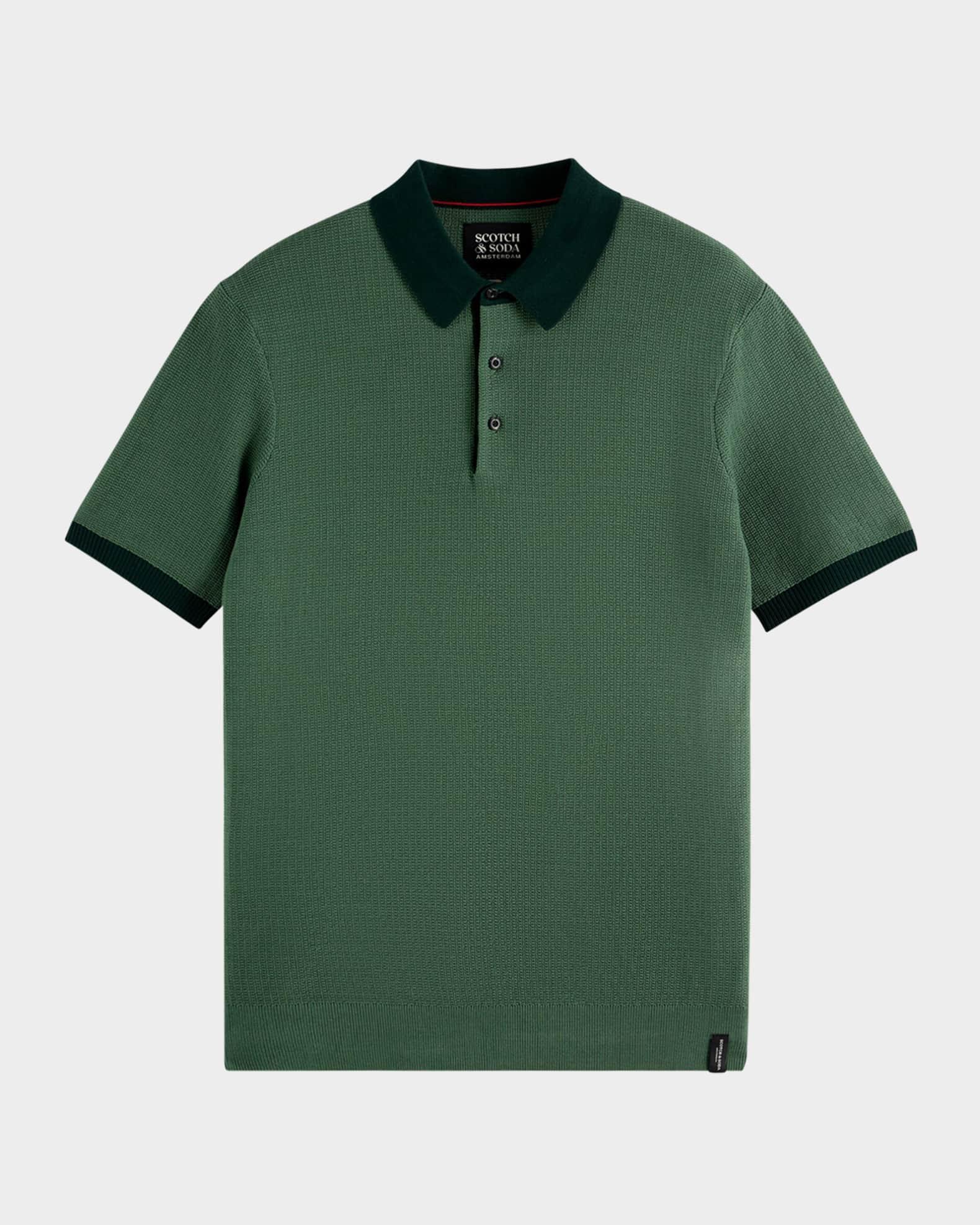 Scotch & Soda polo shirt in solid knit cotton Contrast collar and cuffs Three-button placket Short sleeves Ribbed cuffs and hem Pullover style Cotton Machine wash cold Imported