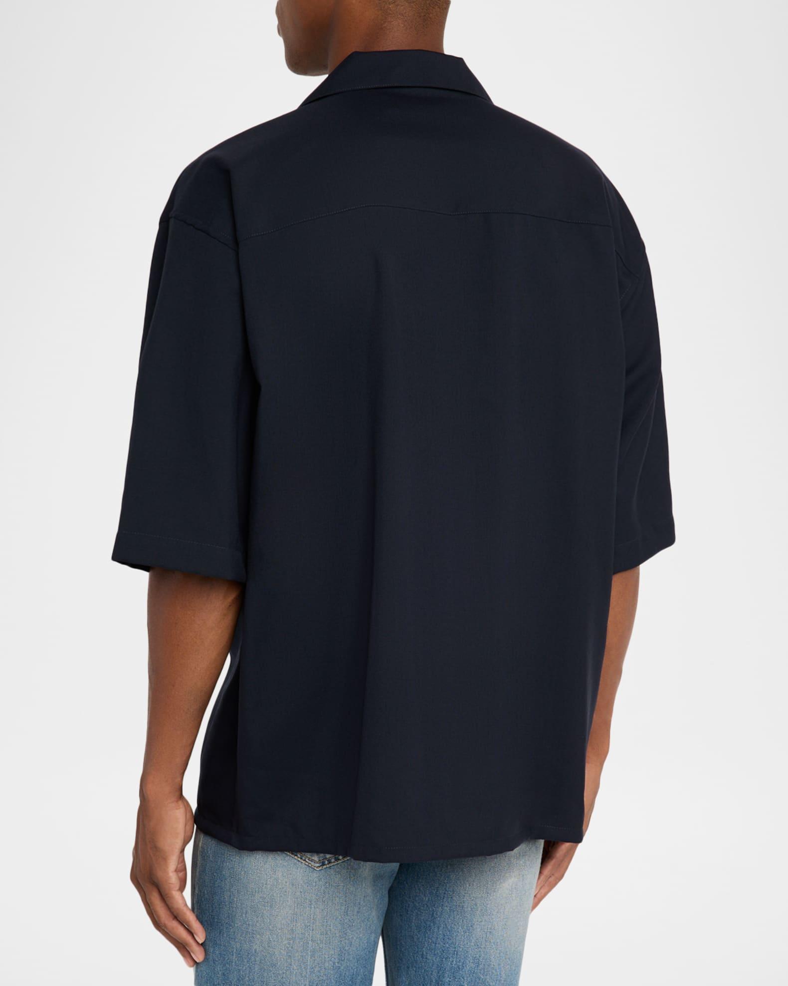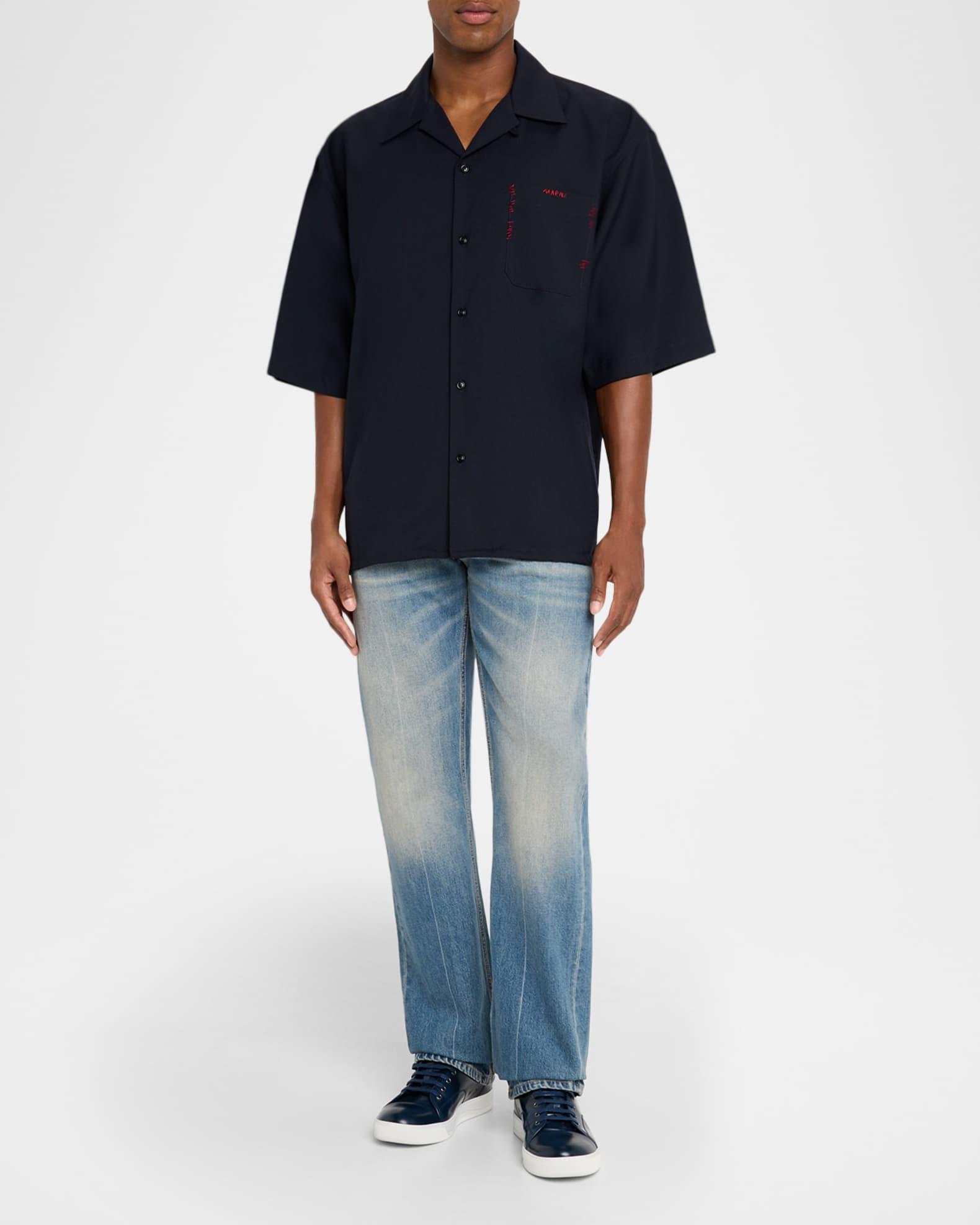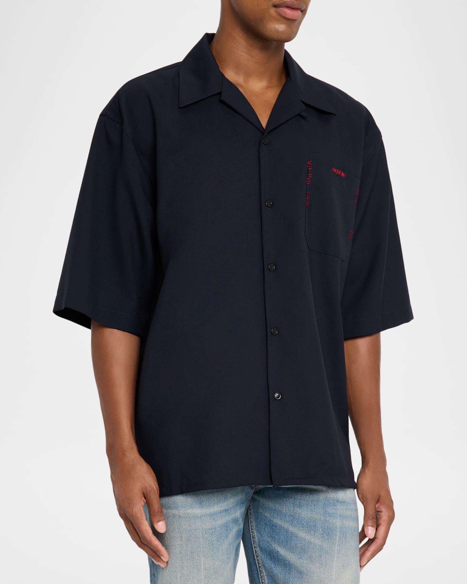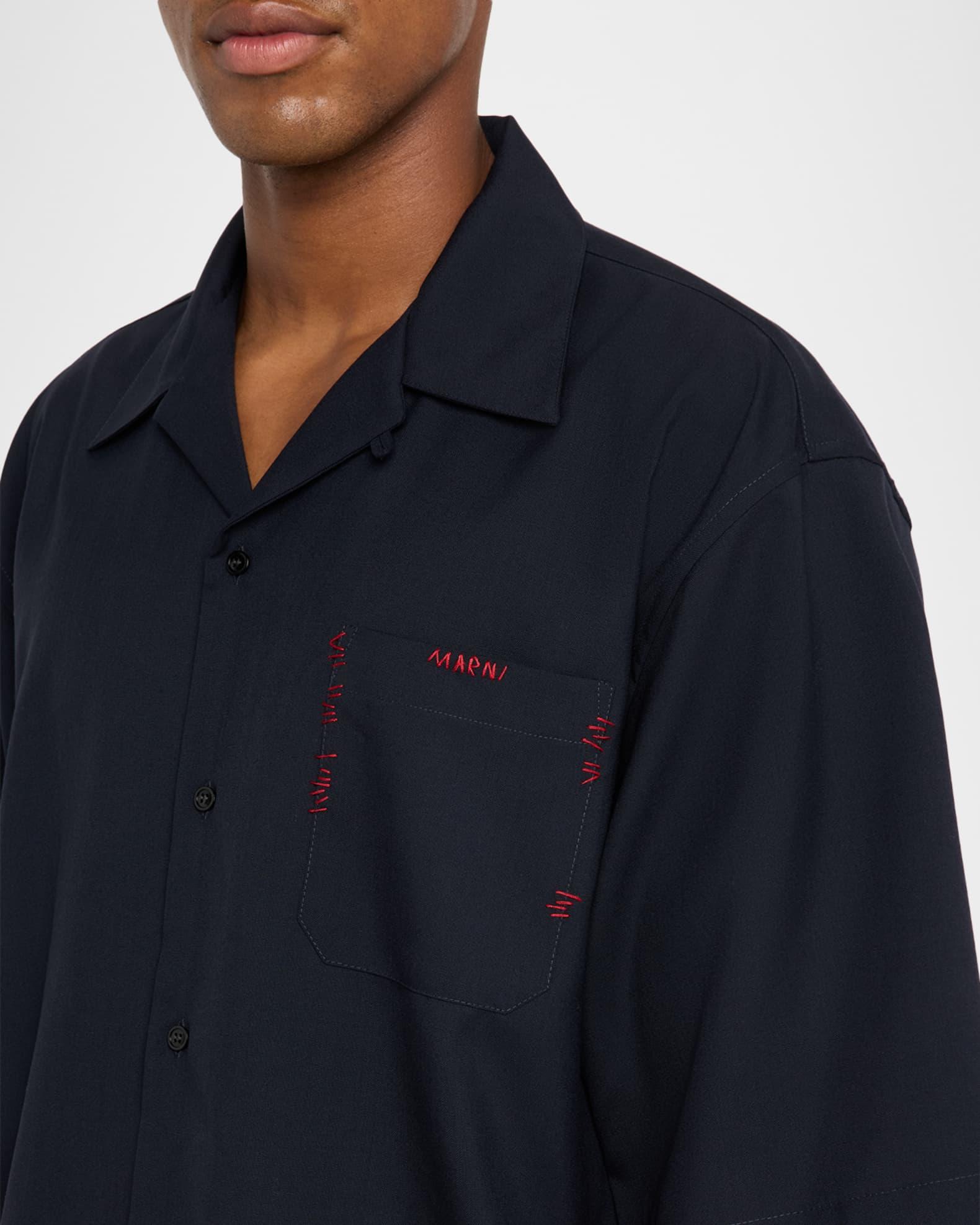 Marni bowling shirt in tropical wool defined by a chest pocket with mending and hand-embroidered logo Genuine mother-of-pearl buttons Point collar Button placket Short sleeves Back yoke Straight hem Classic fit Virgin wool Dry clean Made in Romania