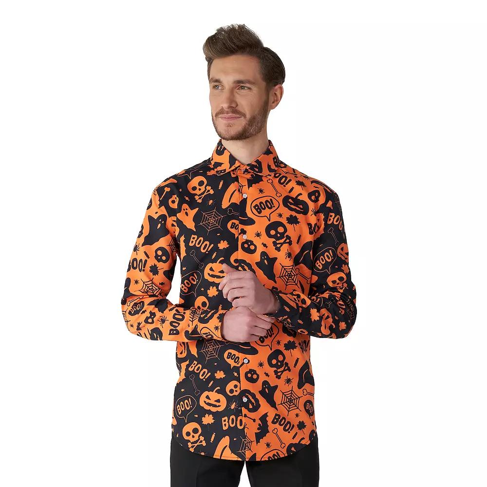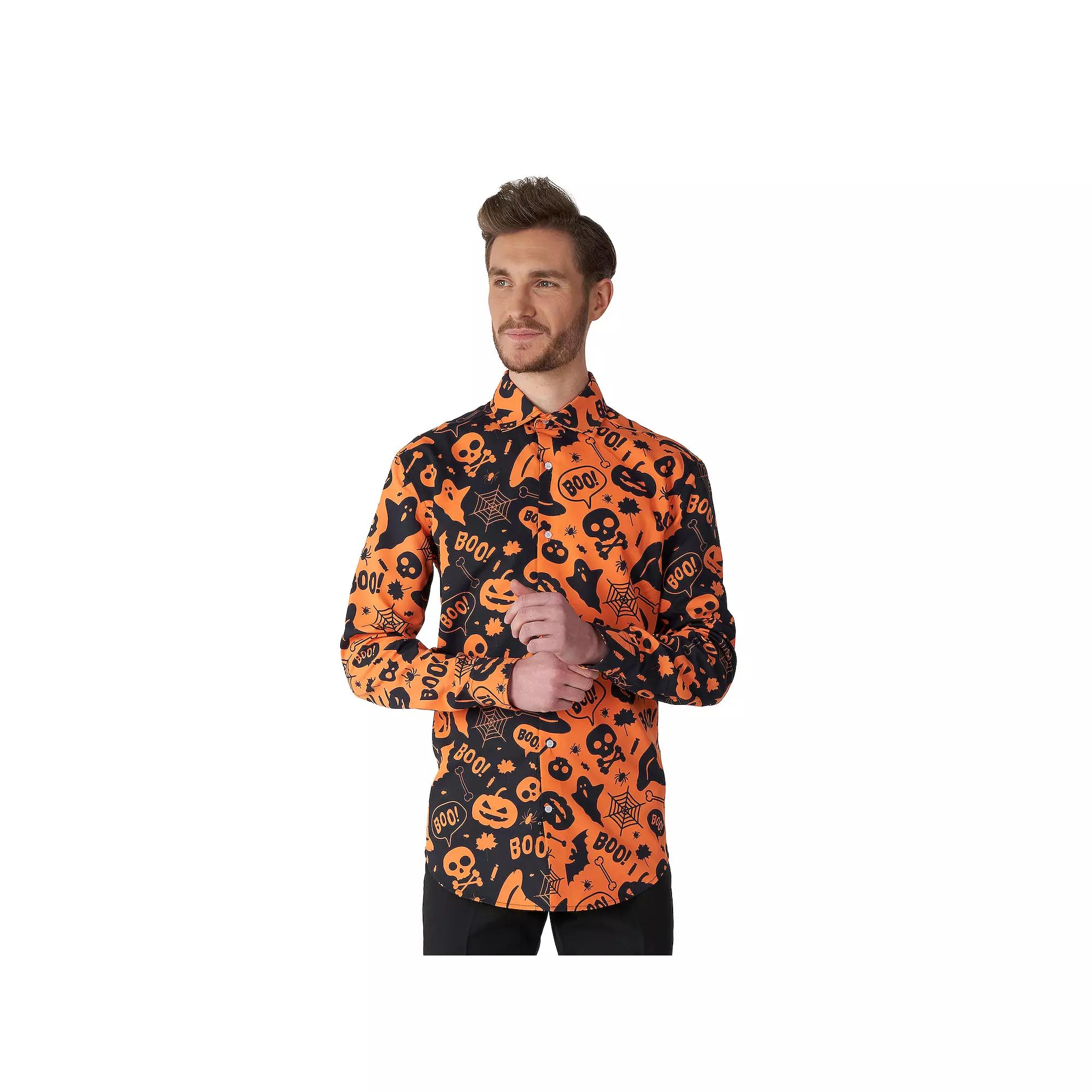 Turn heads in this Mens Suitmeister Halloween Shirt. Turn heads in this Mens Suitmeister Halloween Shirt. FEATURES Button front Long sleeve CuffedFIT & SIZING Slim fitFABRIC & CARE Polyester Machine wash Imported Size: XXL. Color: Orange. Gender: male. Age Group: adult.