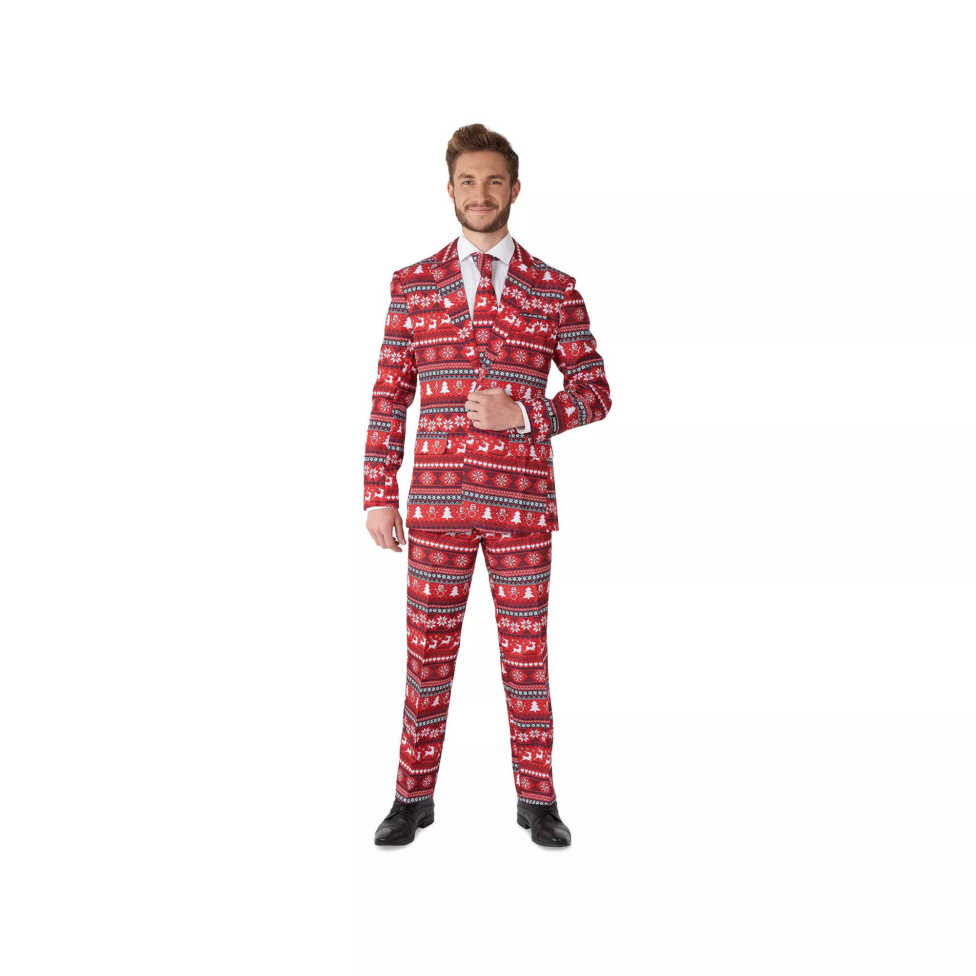 Conquer the holiday season in bold style with this mens Suitmeister Christmas novelty suit set. Conquer the holiday season in bold style with this mens Suitmeister Christmas novelty suit set. Includes: suit jacket, pants & matching tie Jacket: padded shoulders, notched lapels, 2-button front, 5-pocket, long sleeves, regular-length jacket fits those between 58 and 511 tall Pants: adjustable waistband, flat-front waistline, 4 pockets, zipper fly with hook & button closureFIT & SIZING Slim fit features high arm holes, slightly narrow straight body and tapered leg openings When in doubt between two sizes, we recommend you pick the larger of the twoFABRIC & CARE Polyester Machine wash Imported Gender: male. Age Group: adult. Pattern: Pattern.