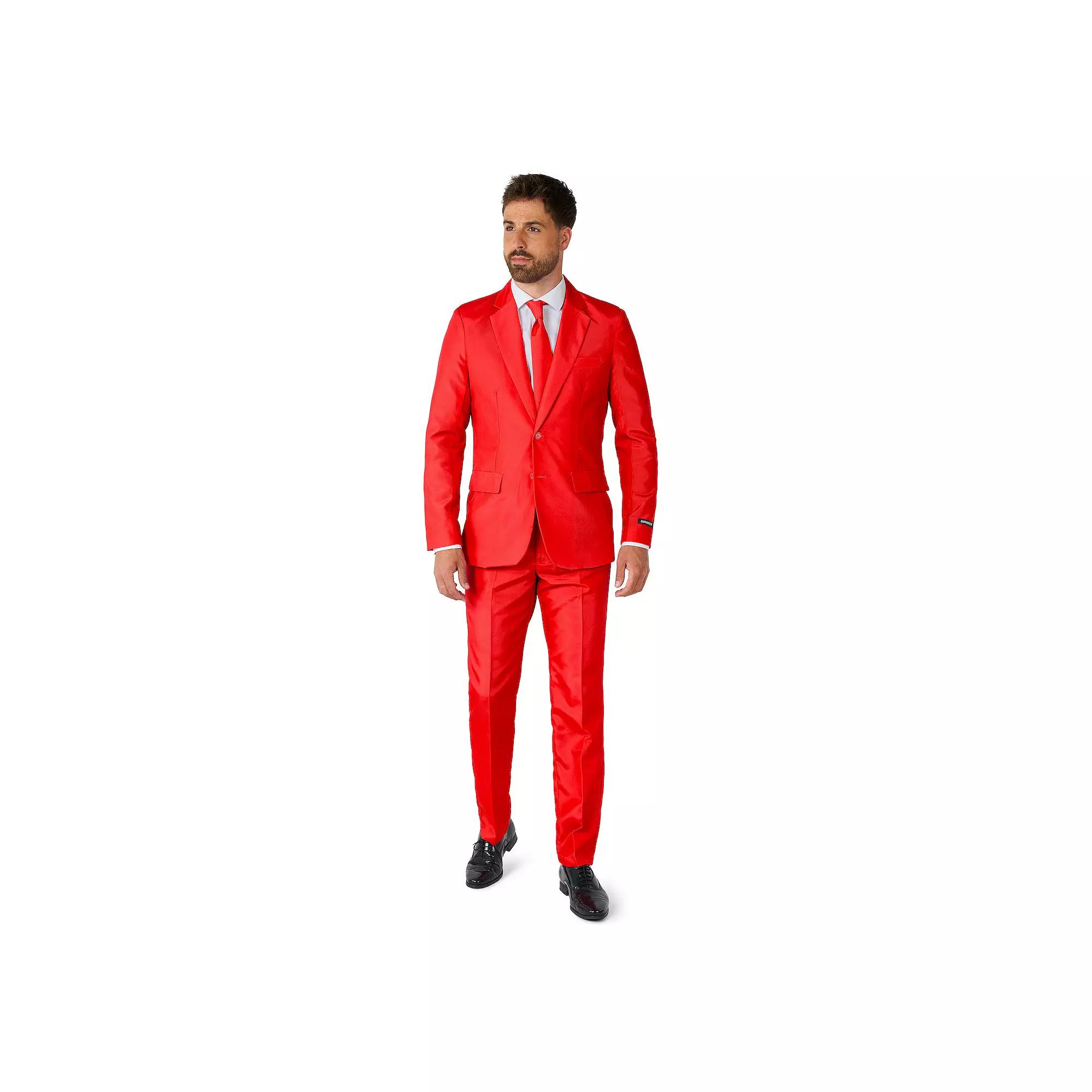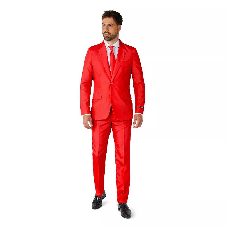 This red suit great for everyone who likes to stand out from the crowd while being covered in the color of power and passion. The slim fit outfit consists of a jacket, pants and a tie. The pants have an adjustable waistband for a perfect fit. | Suitmeister Men's Solid Colored Suit, Red, Large
