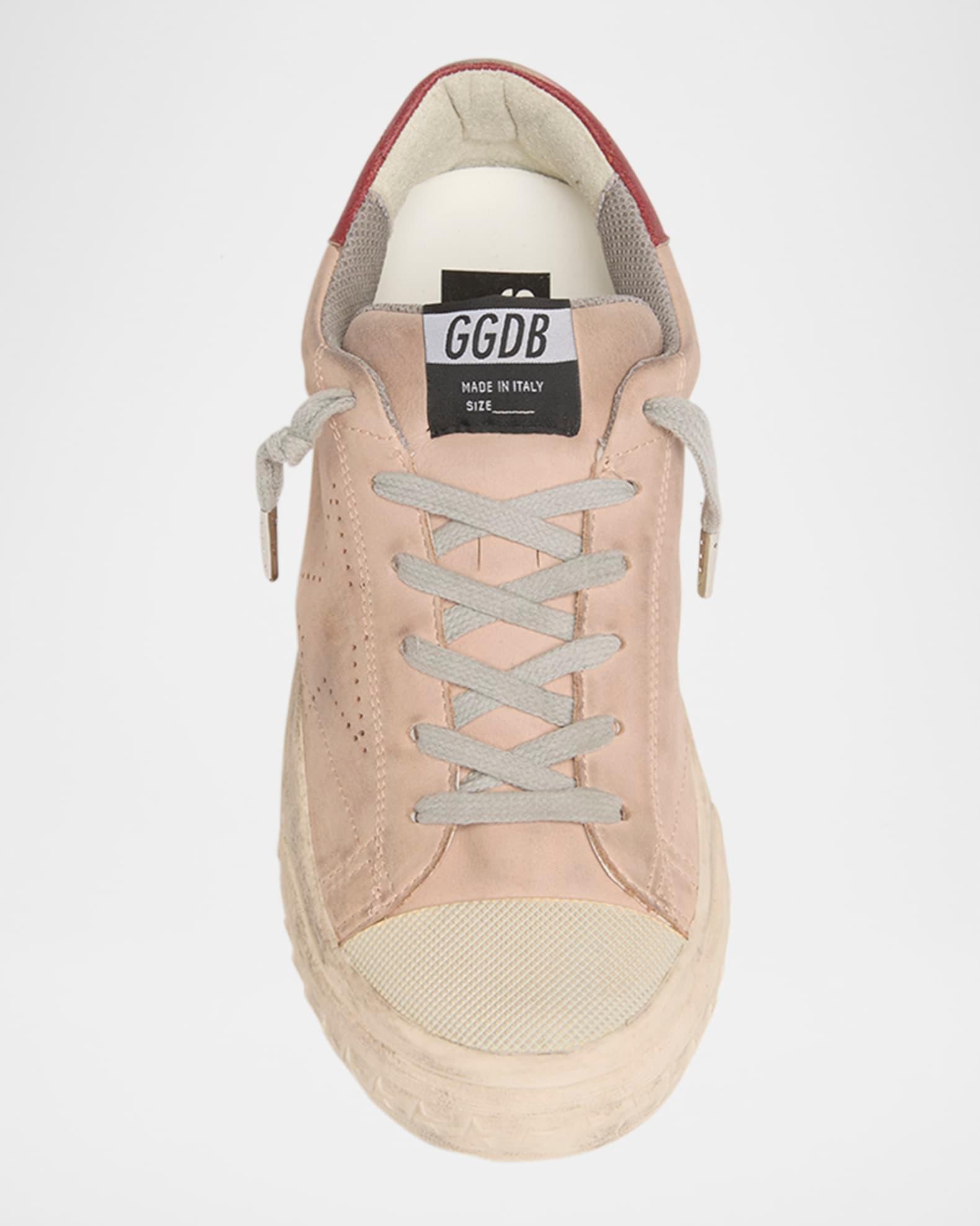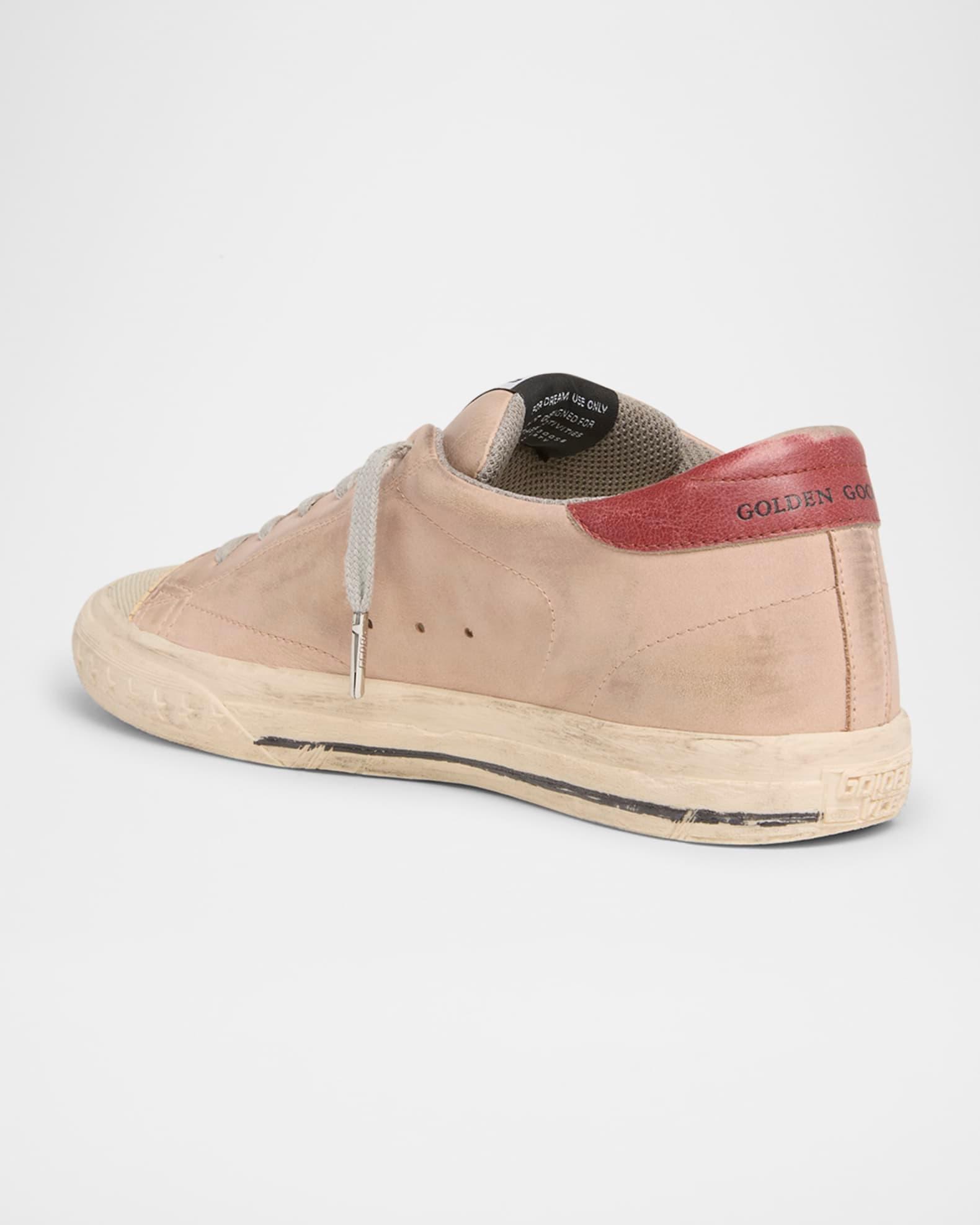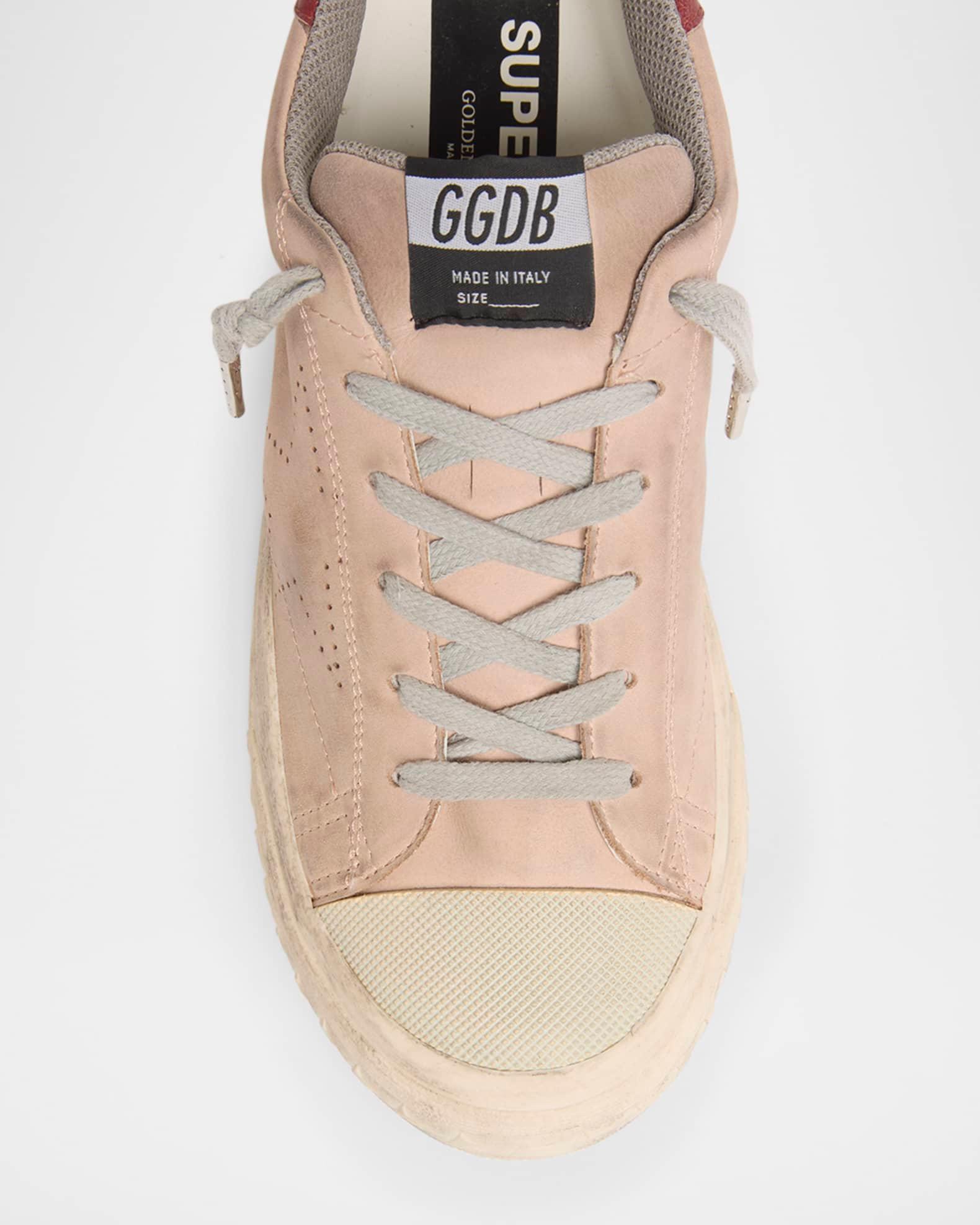 Golden Goose SuperStar fashion sneakers in nubuck leather featuring a vintageeffect Flat heel Round cap toe Laceup vamp Tongue with woven label Padded collar Backstay leather logo Raised logo on the heel Perforated star on the side Rubber outsole Made in Italy