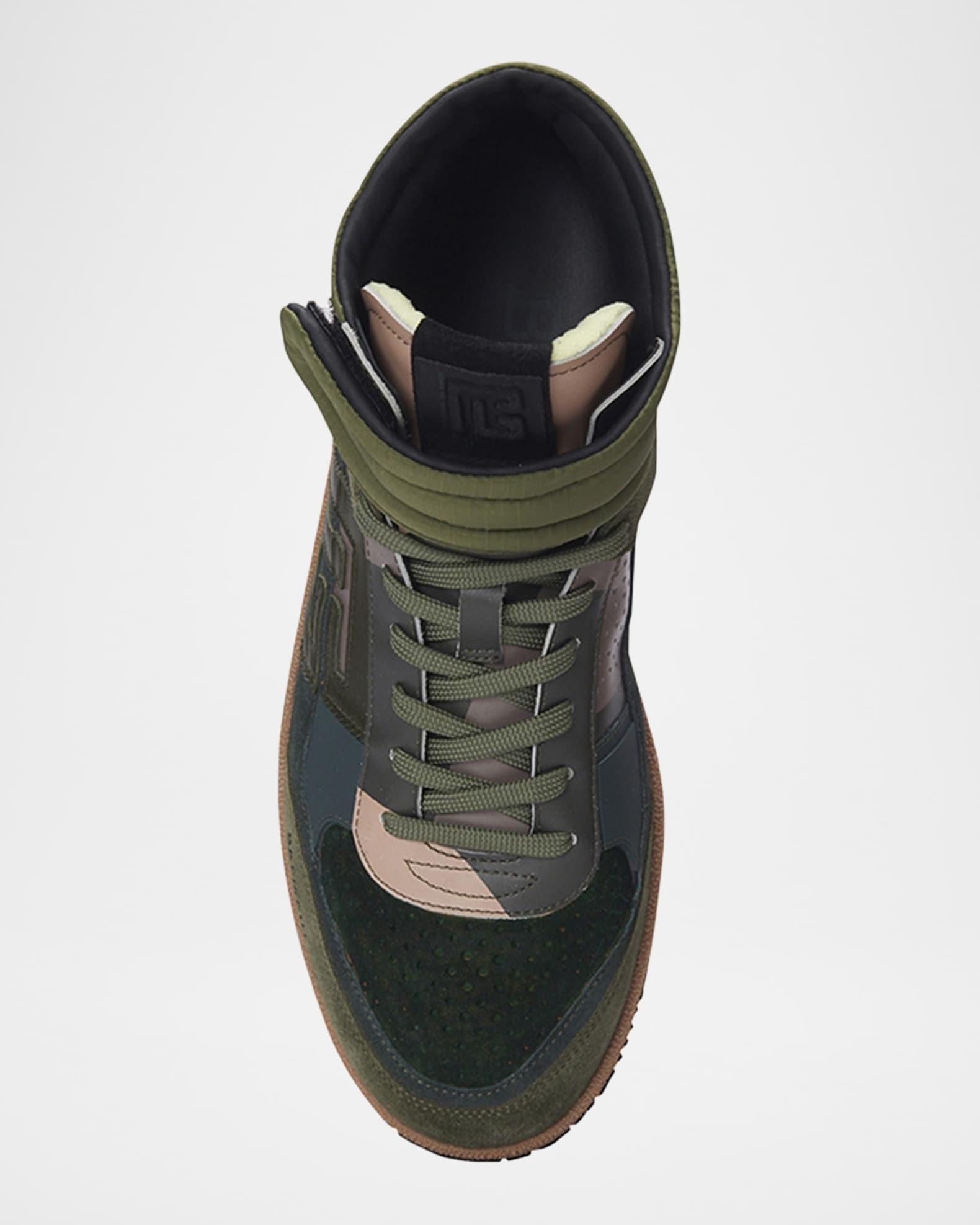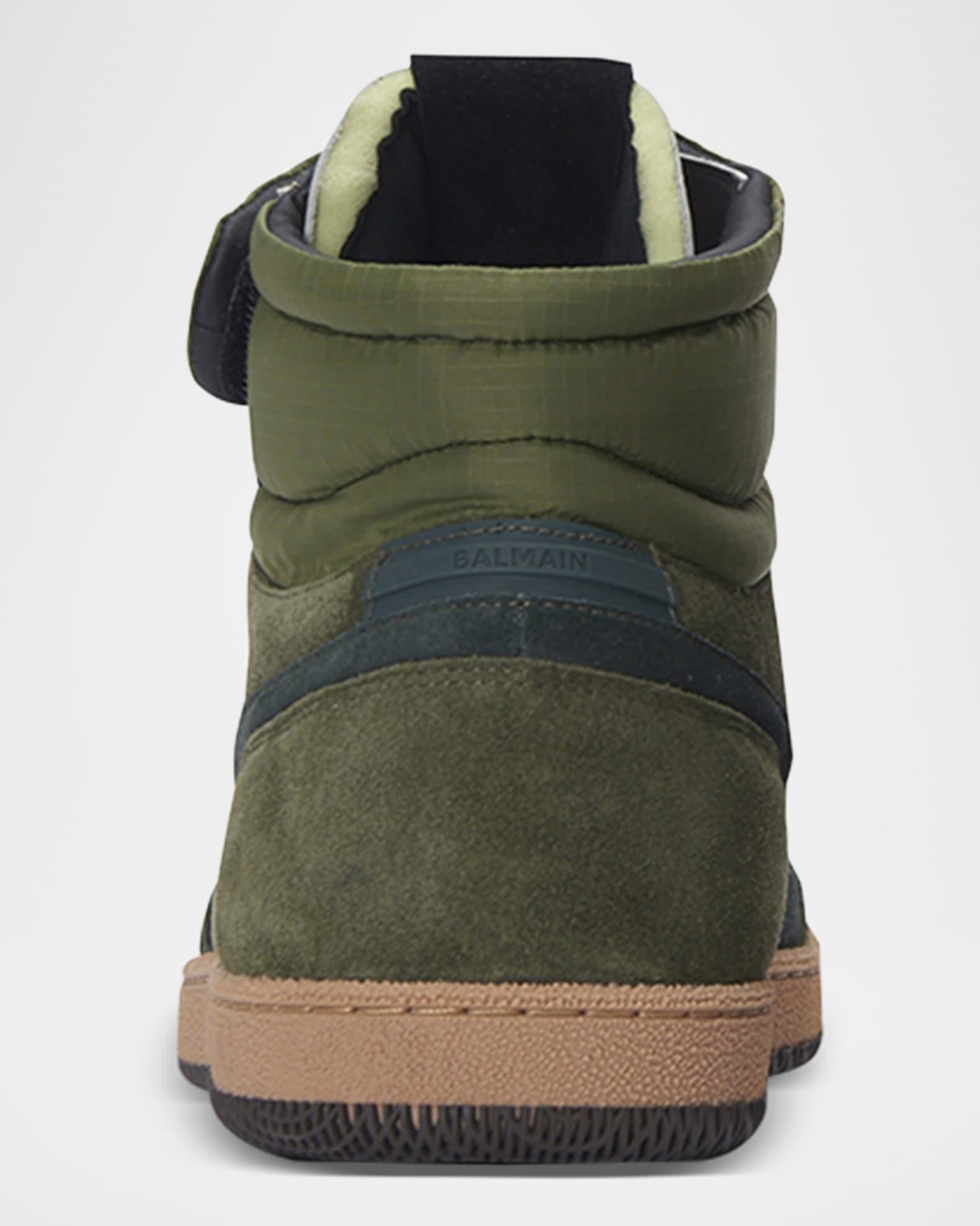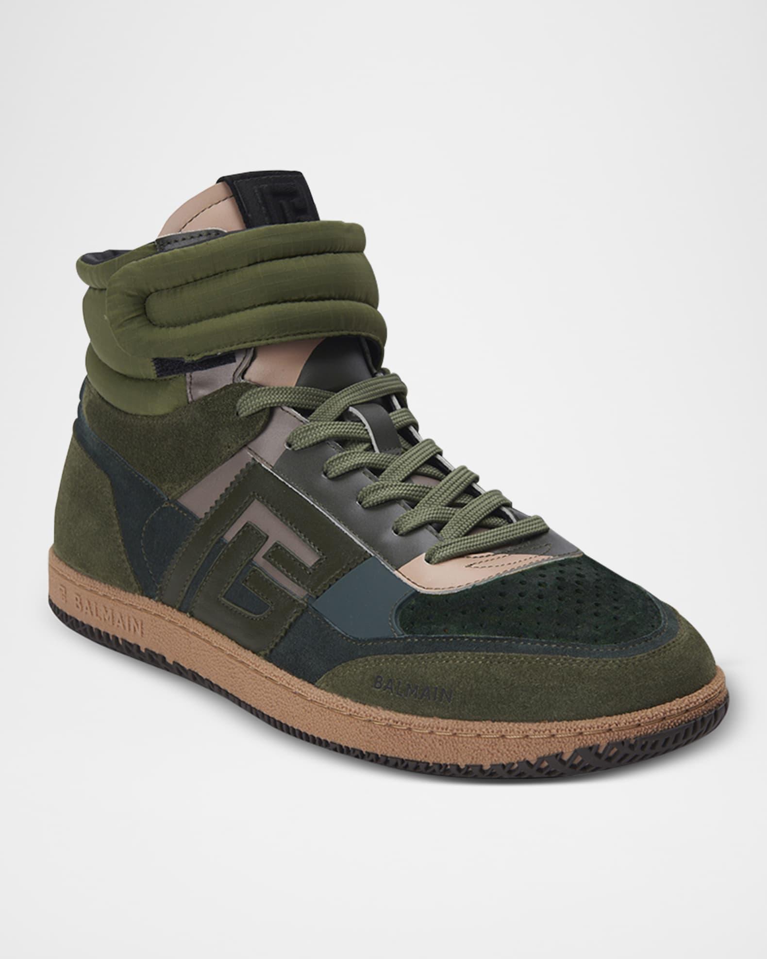 Balmain "Swan" mid-top sneakers in calfskin and suede Flat heel Perforated round toe Lace-up vamp; grip strap Leather tongue with embossed pb logo label Leather lining and insole Pb logo insert on the side Logo embossed on the side and backstay Textured rubber outsole with raised logo Spot clean Made in Italy