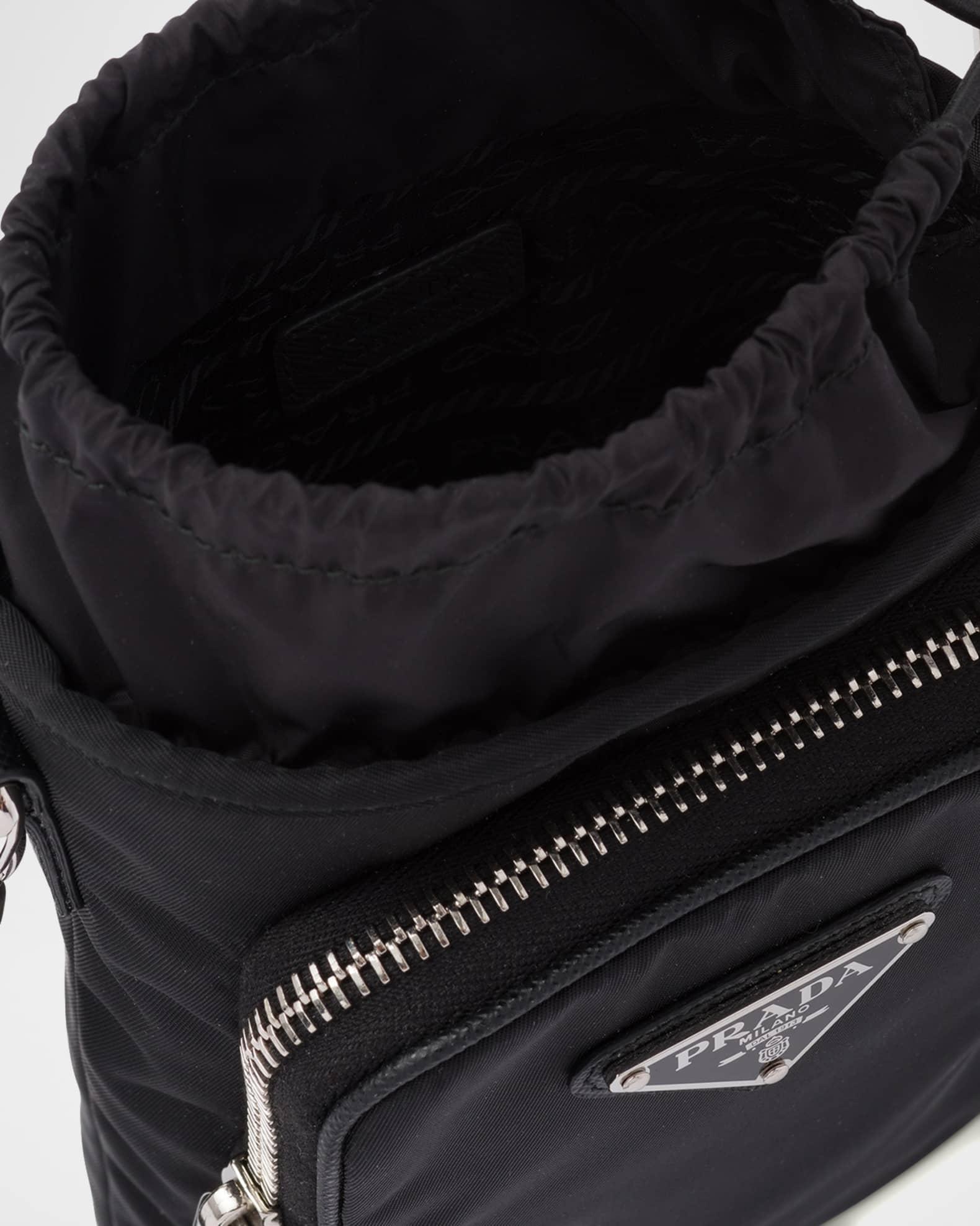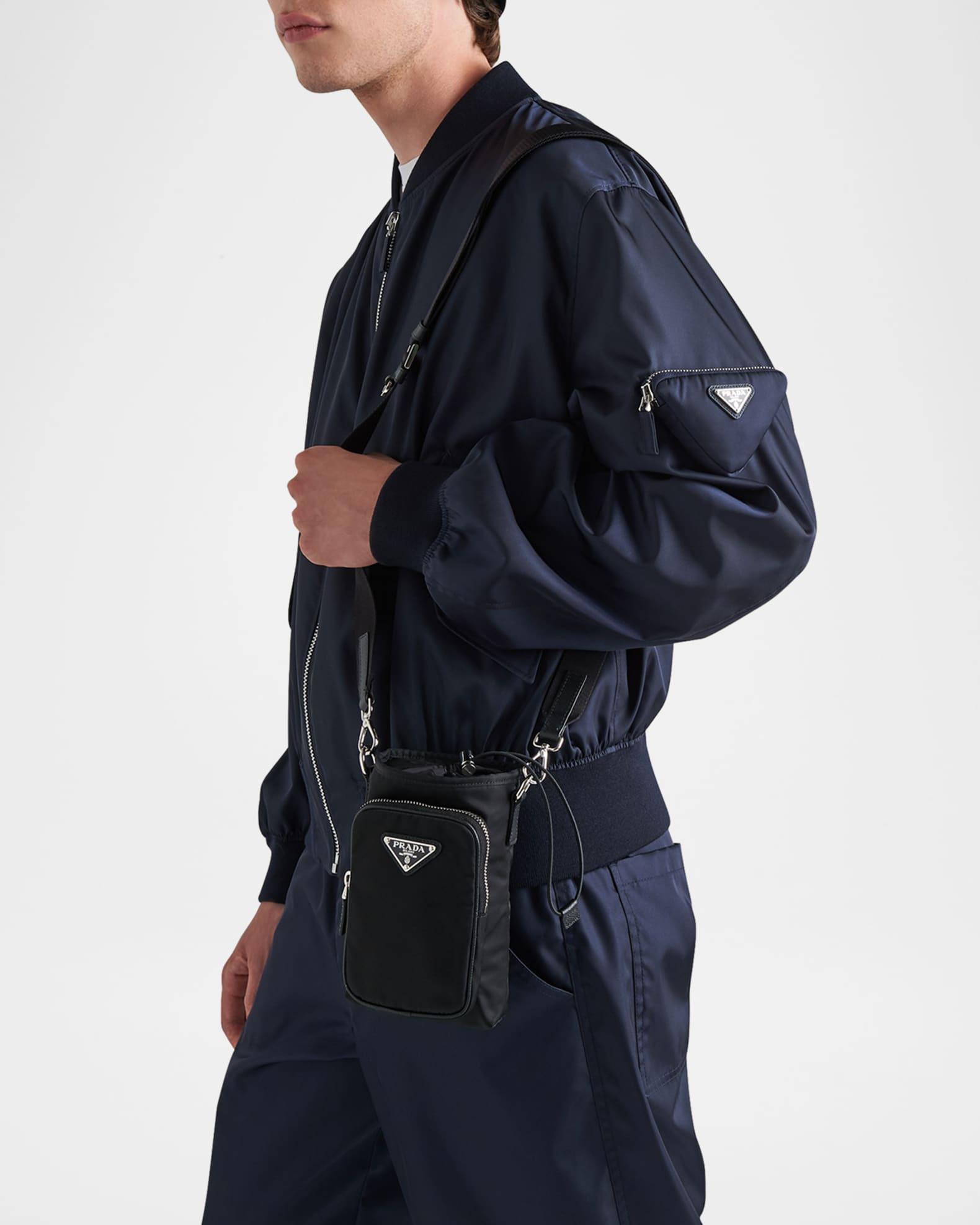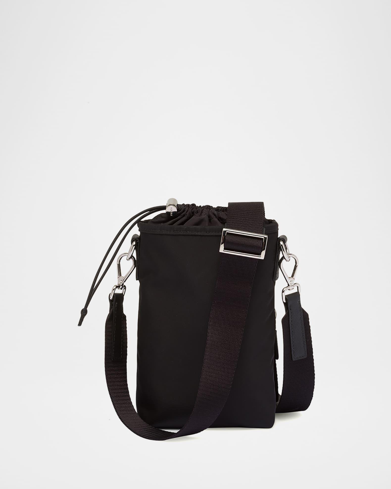 Prada "Tessuto" smartphone case features enameled metal triangle logo at front Approx. 2"L x 0.5"W x 5.5"H Drawstring closure Front zip pocket Detachable adjustable woven shoulder strap Re-nylon fabric Imported