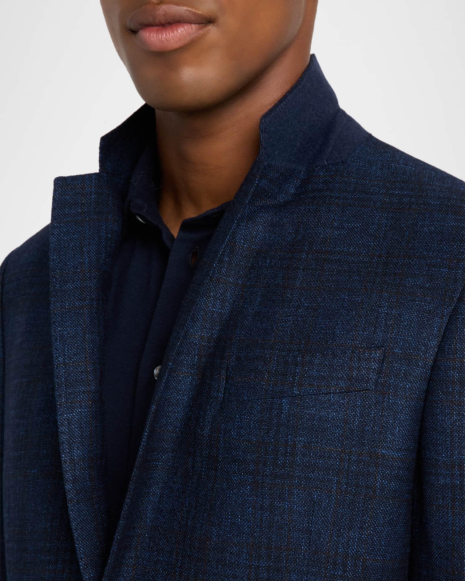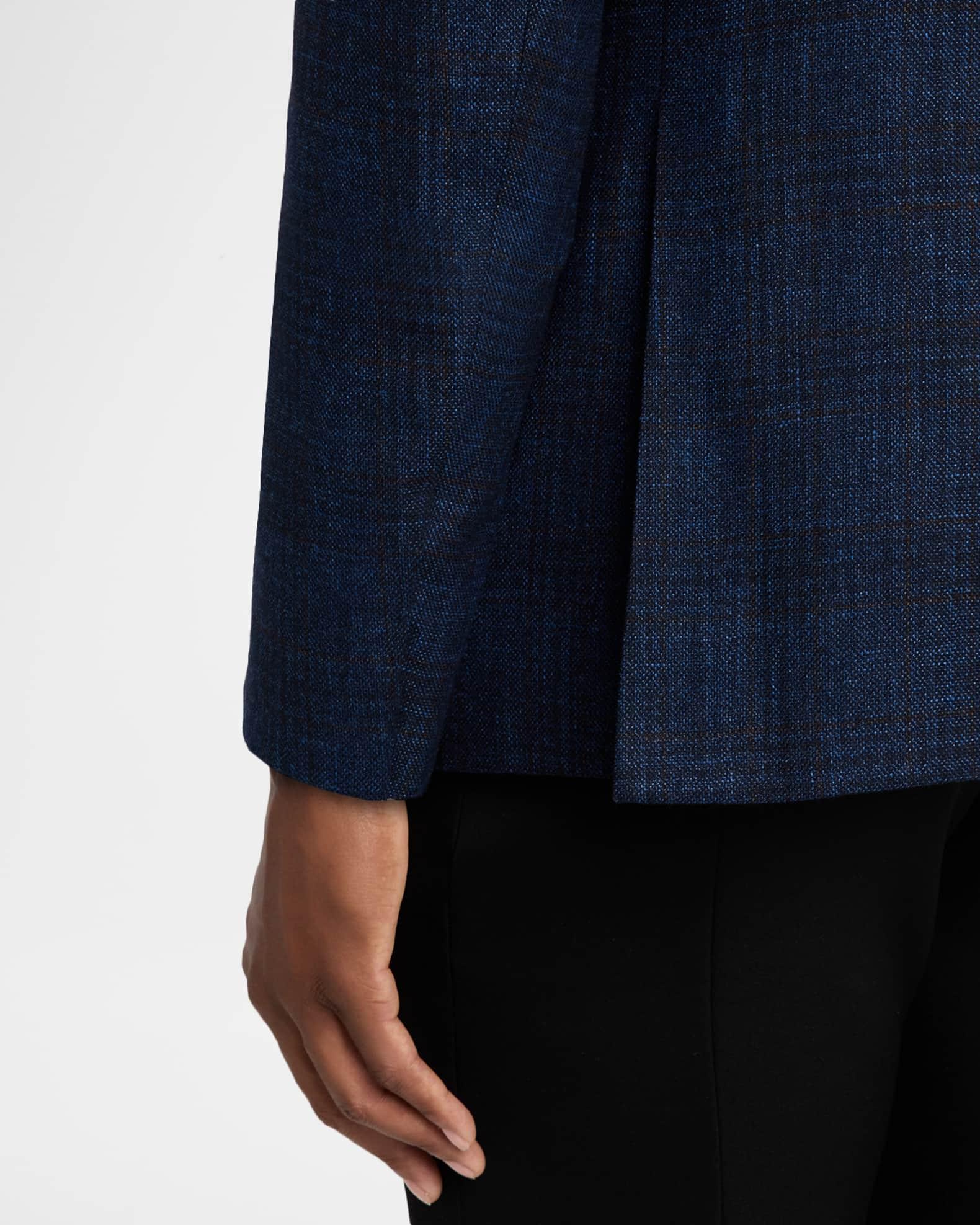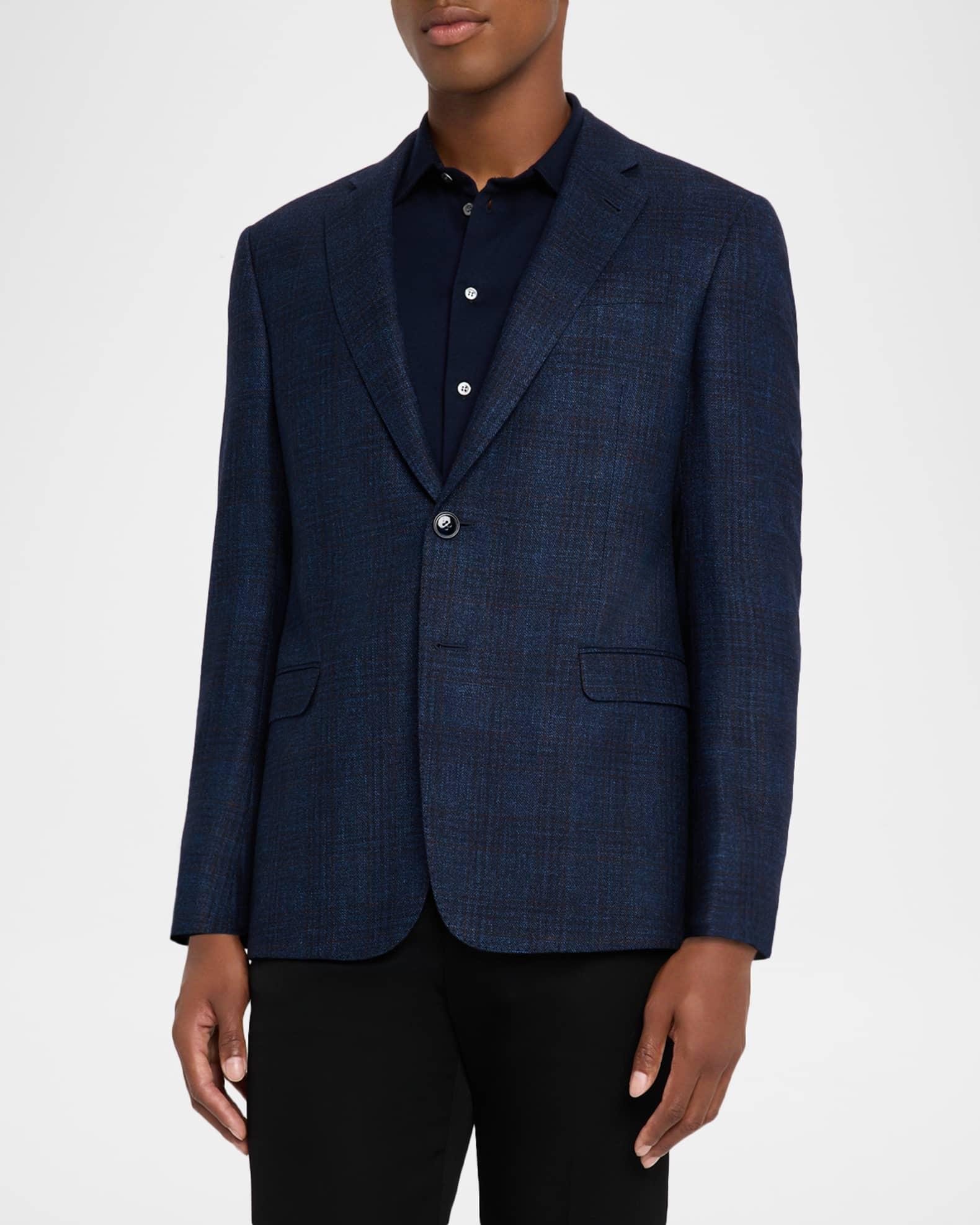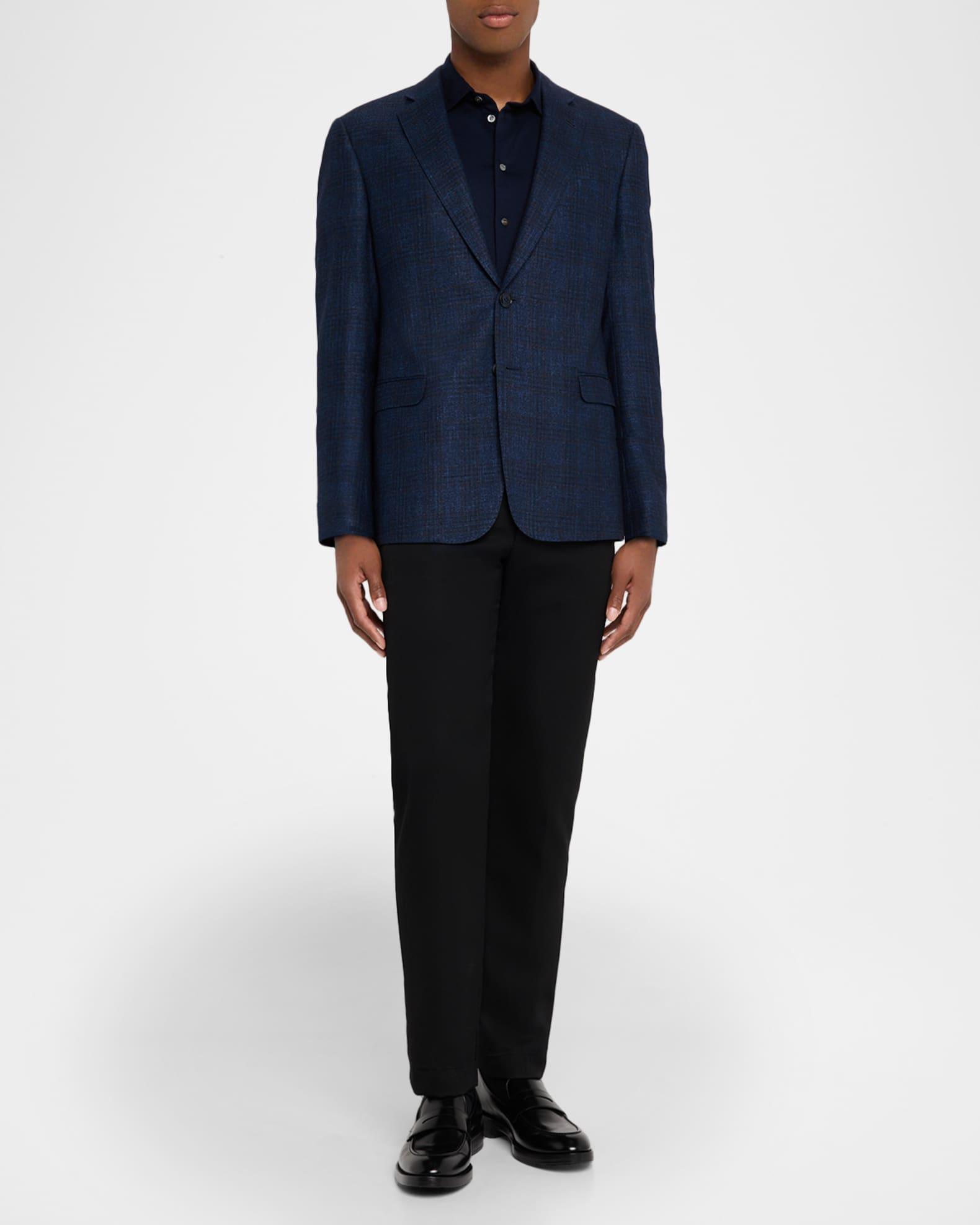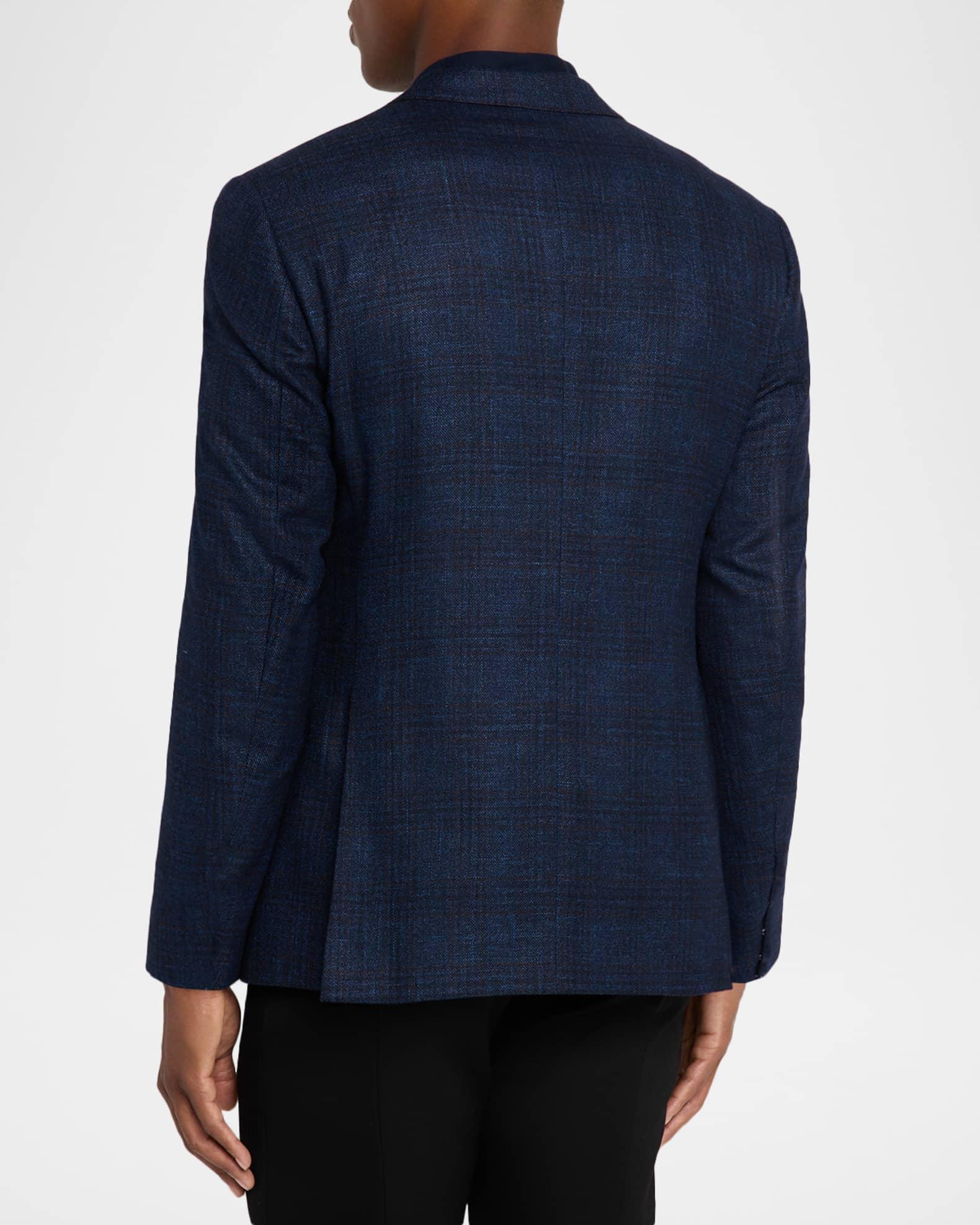 Giorgio Armani sport coat in a soft wool blend displaying a textured windowpane pattern Notched lapels Single-breasted front Chest welt pocket Internal breast pocket Hip flap pockets Long sleeves Double-vented back Virgin wool/linen/cashmere Dry clean Made in Italy