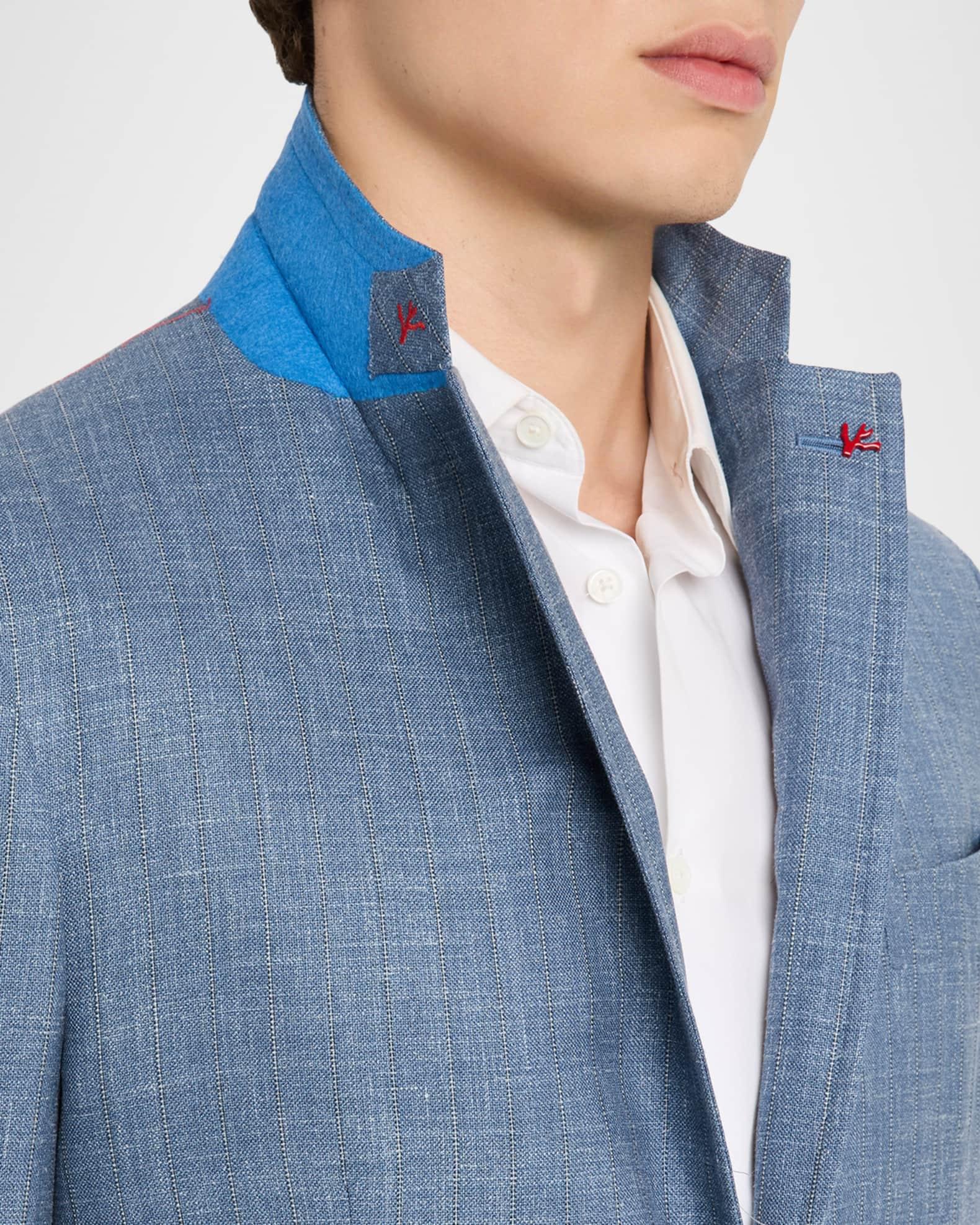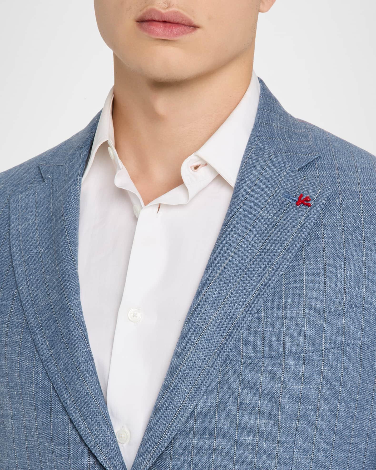 Isaia two-piece suit in a premium wool blend highlighted with seasonal thin stripes Wool/silk/linen Dry clean Made in Italy Jacket: Notched lapels Single-breasted front Chest welt pocket Hip patch pockets Internal breast pocket Double-vented back Pants: Regular rise Flat front Side slip pockets Modern fit through straight legs Extended button-zip front; belt loops