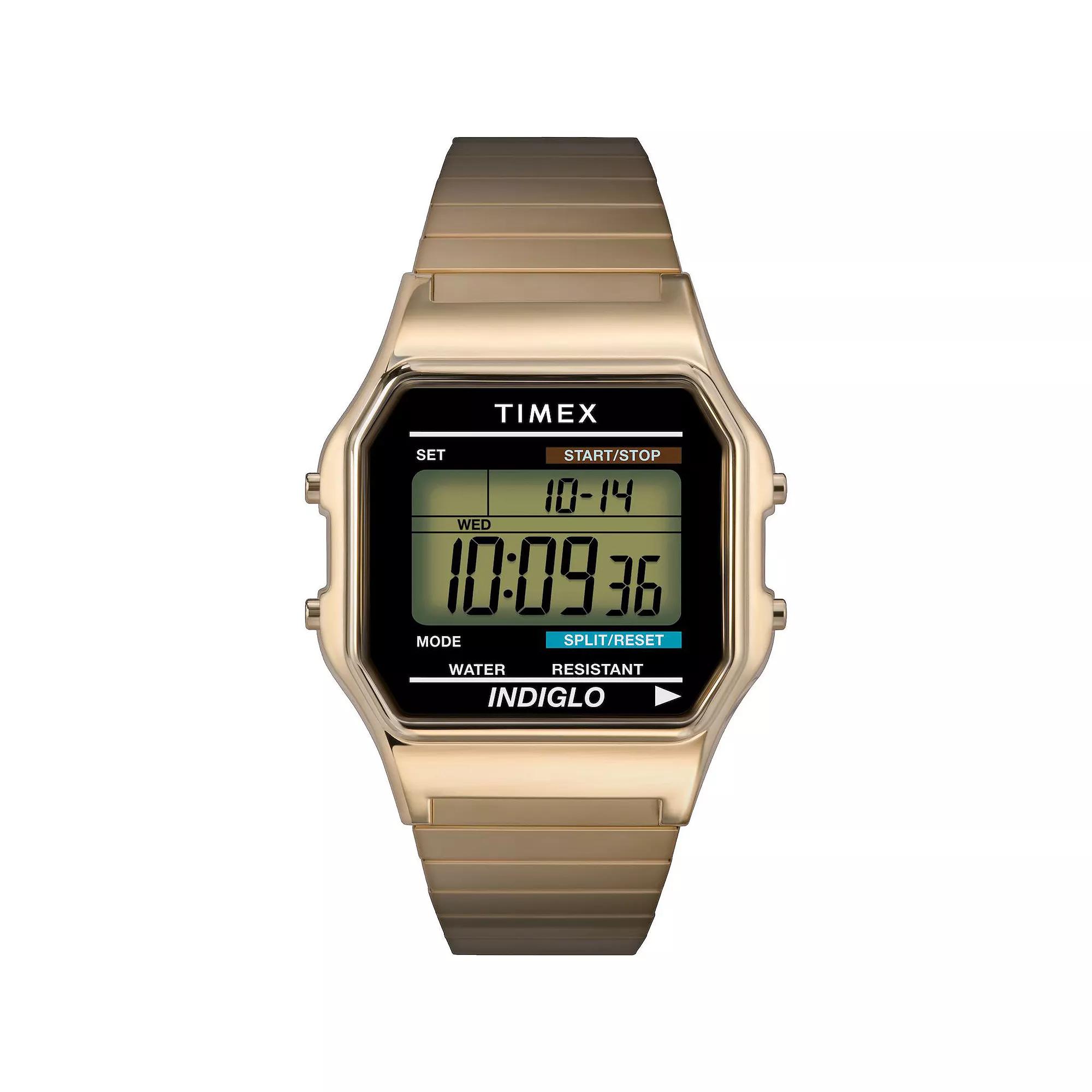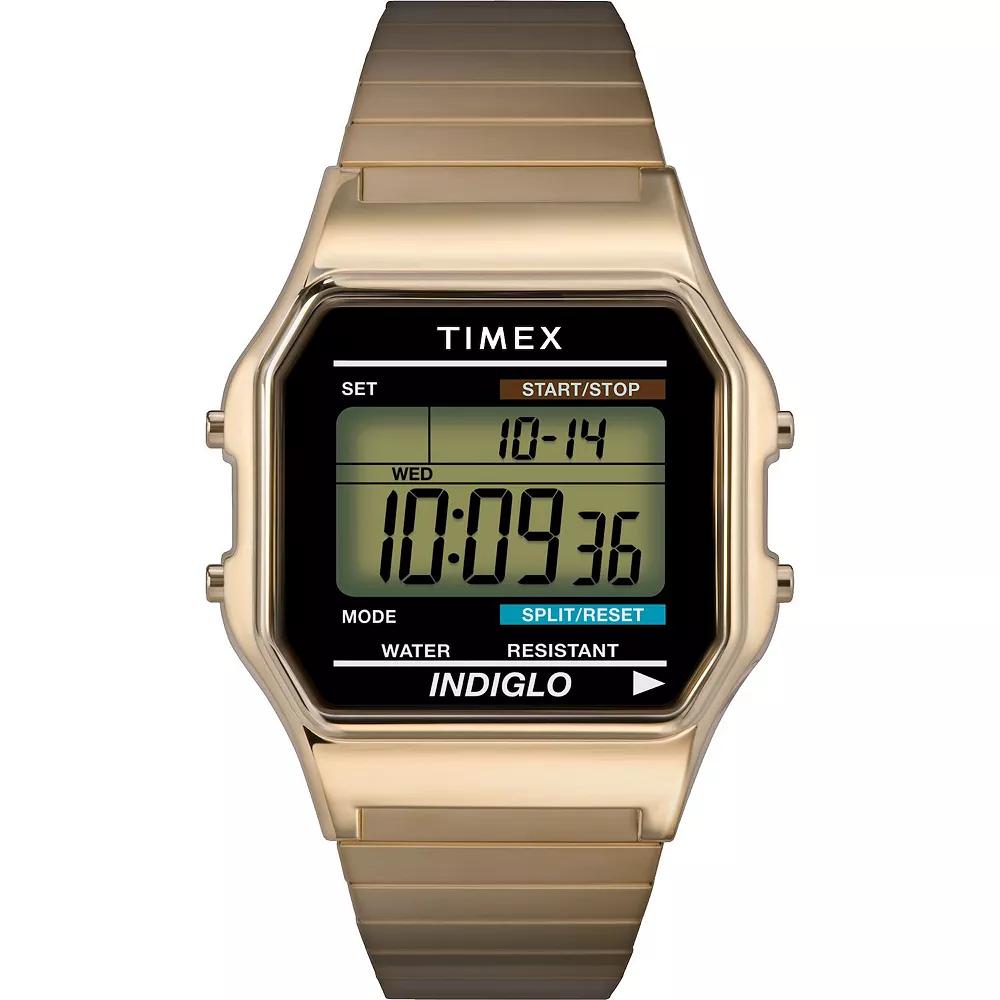 This Mens Timex(R) digital inglo gold-tone watch showcases a timeless and masculine design. It features a stainless steel expansion band, a chronograph, an alarm, timer functions, and is water resistant up to 30 meters. Height: 10mm, Width: 34mm. Your TIMEX(R) watch is warranted against manufacturing defects by Timex Group USA, Inc. for a period of ONE YEAR from the original purchase date.