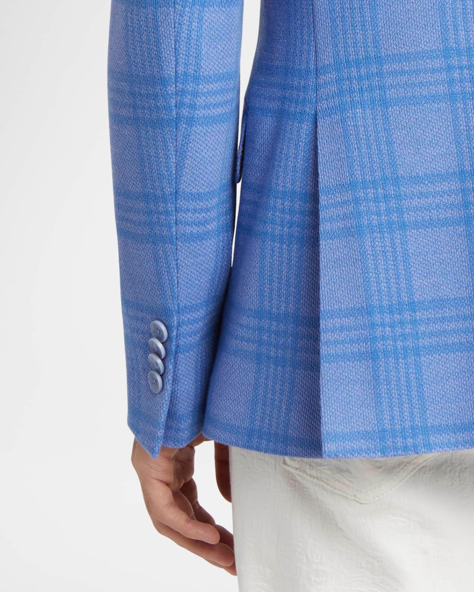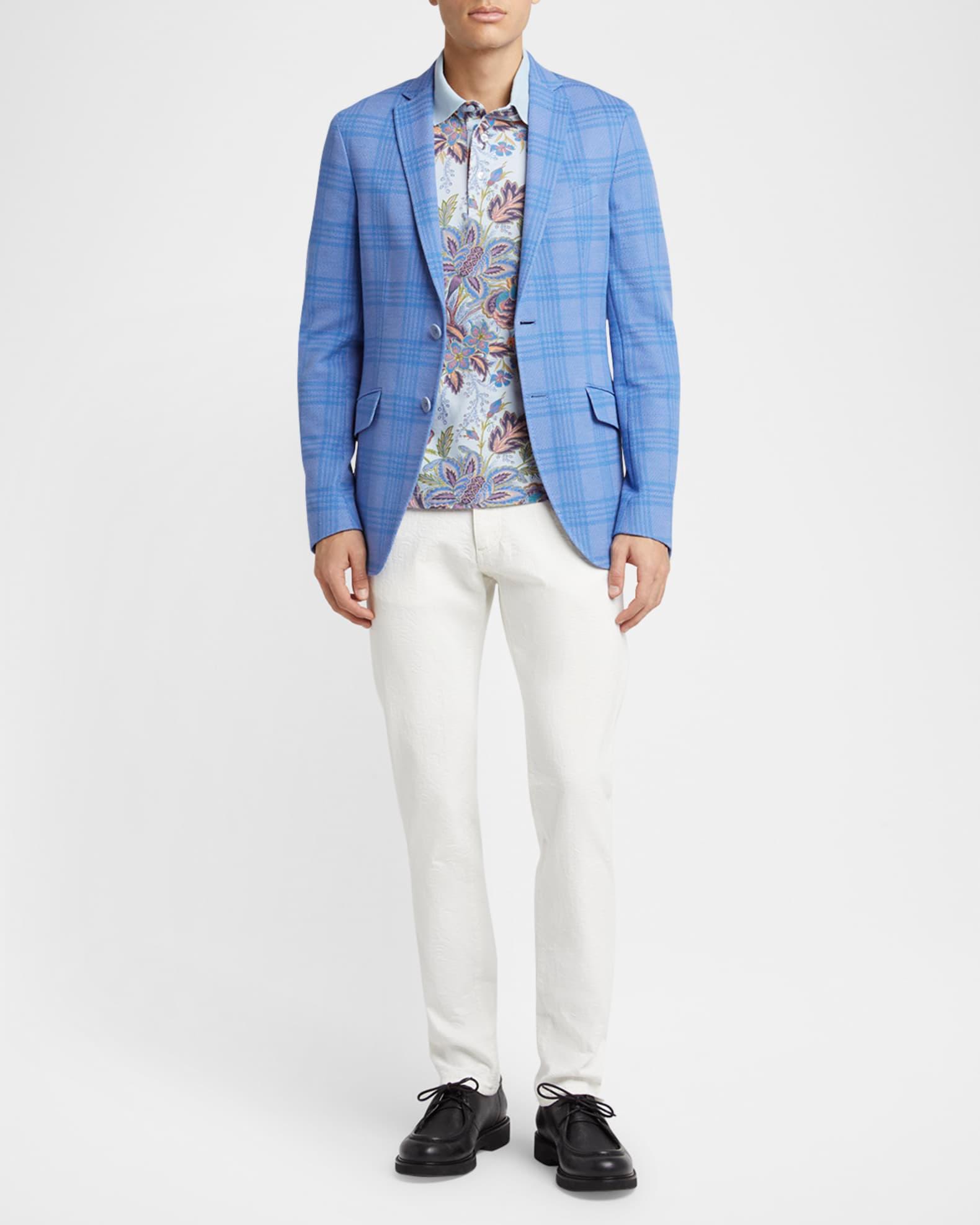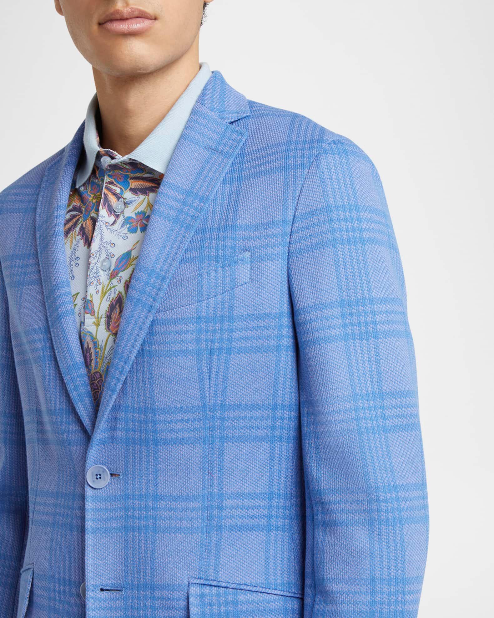 Etro sport jacket in a sophisticated tonal check jacquard Bold motif printed on the interior Notched lapels Two-button front Barchetta chest pocket Hip flap pockets Long sleeves Four-button cuffs Double-vented back Cotton/wool/polyester Lining: Viscose/polyester Professional cleaning recommended Made in Italy