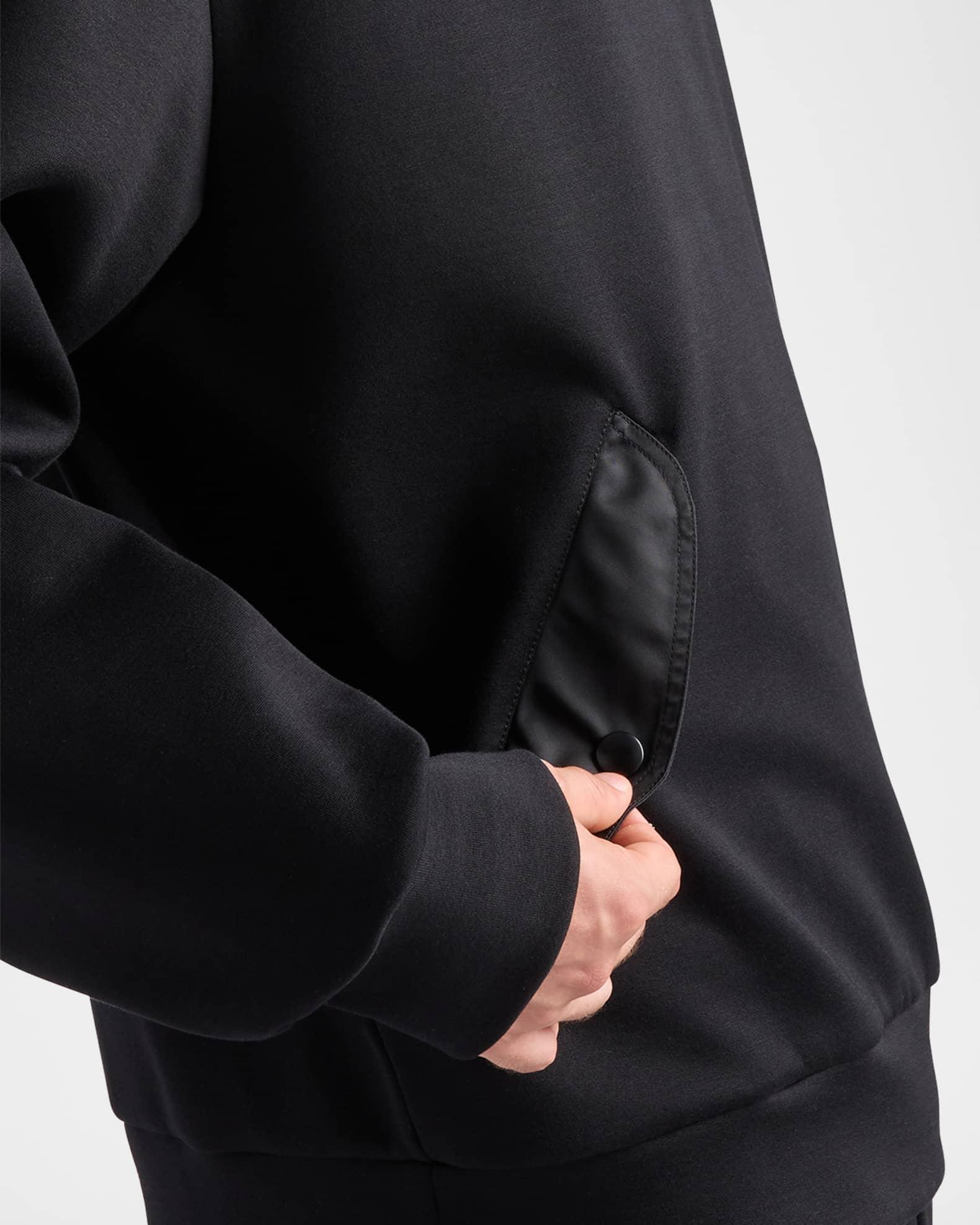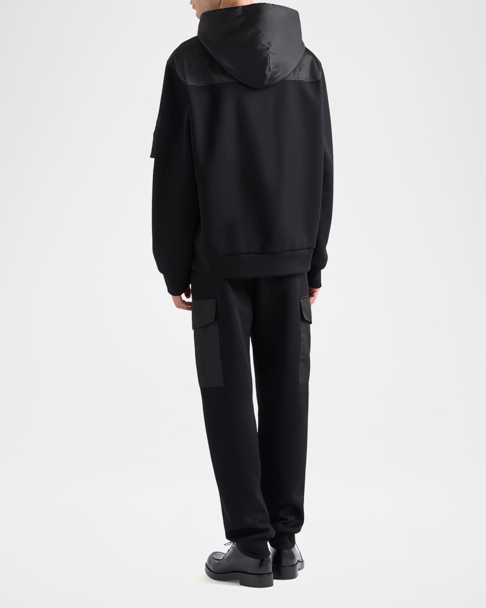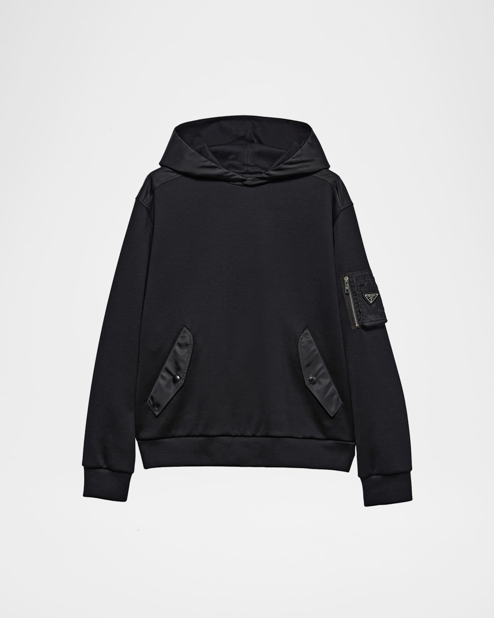 Prada sweatshirt in solid fleece with tonal Re-Nylon panels Fixed hood Dropped shoulders Long sleeves Side flap pockets with snap closure Utility pocket on sleeve Enameled metal triangle logo Relaxed fit Pullover style Cotton/nylon/polyamide Calf leather patch Dry clean Imported