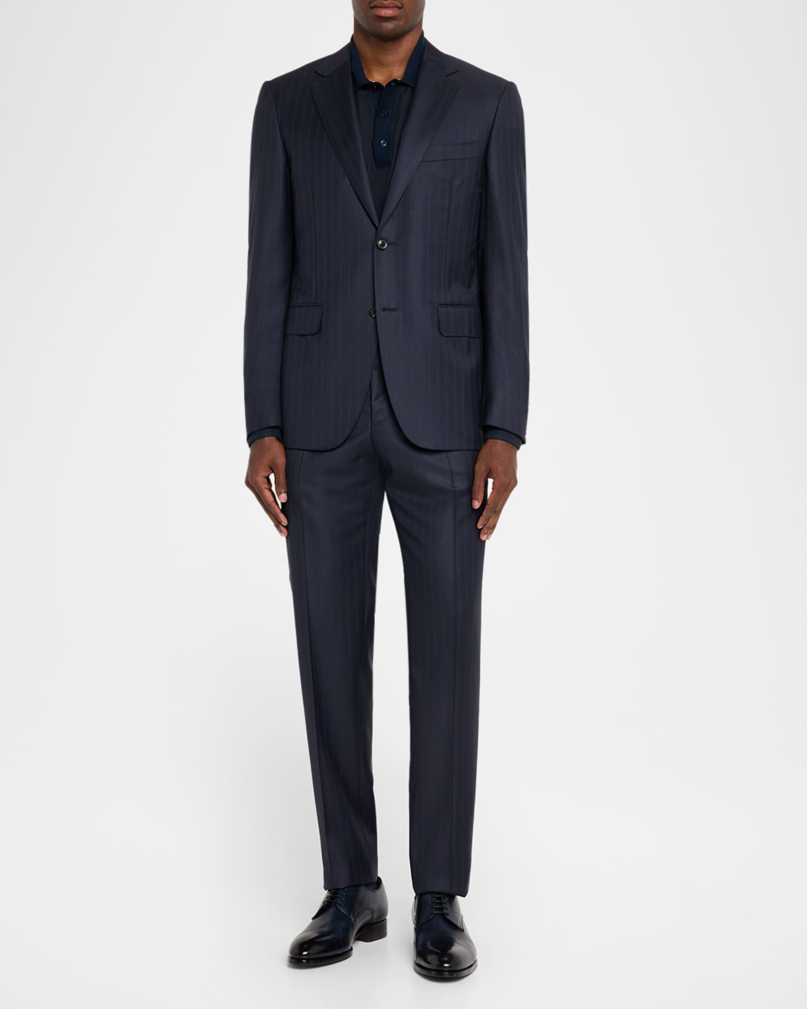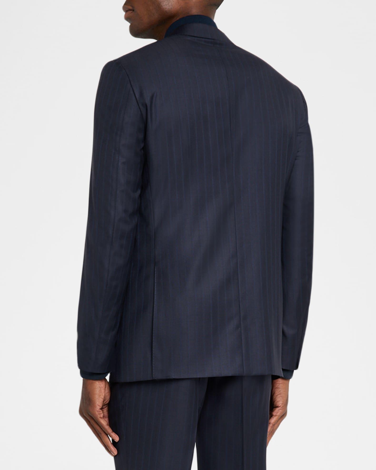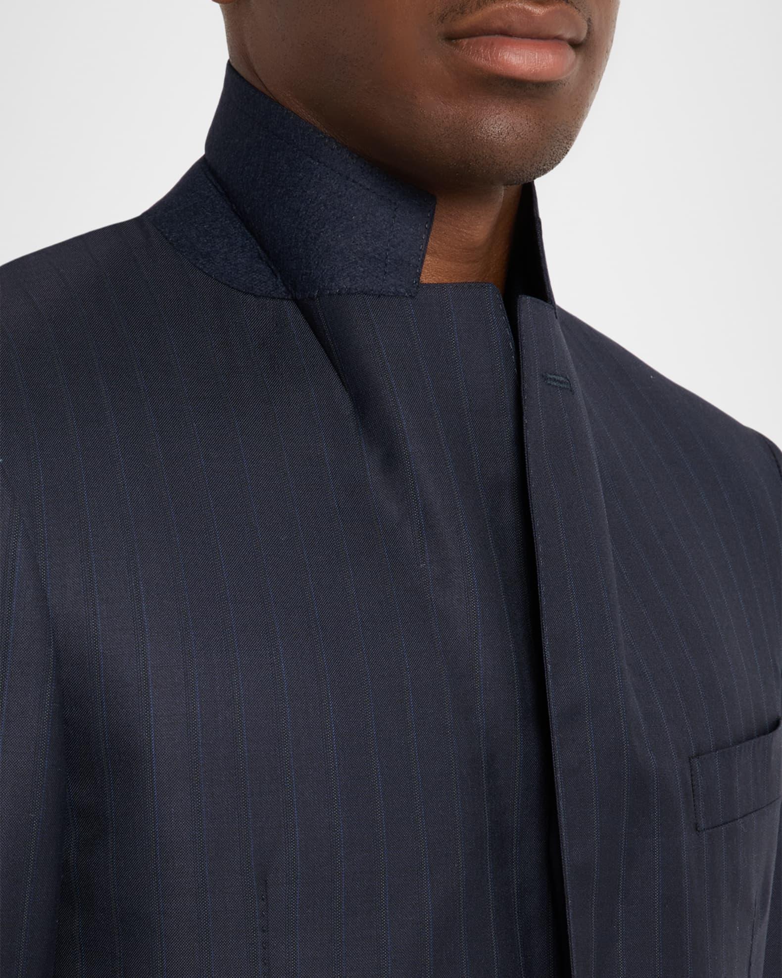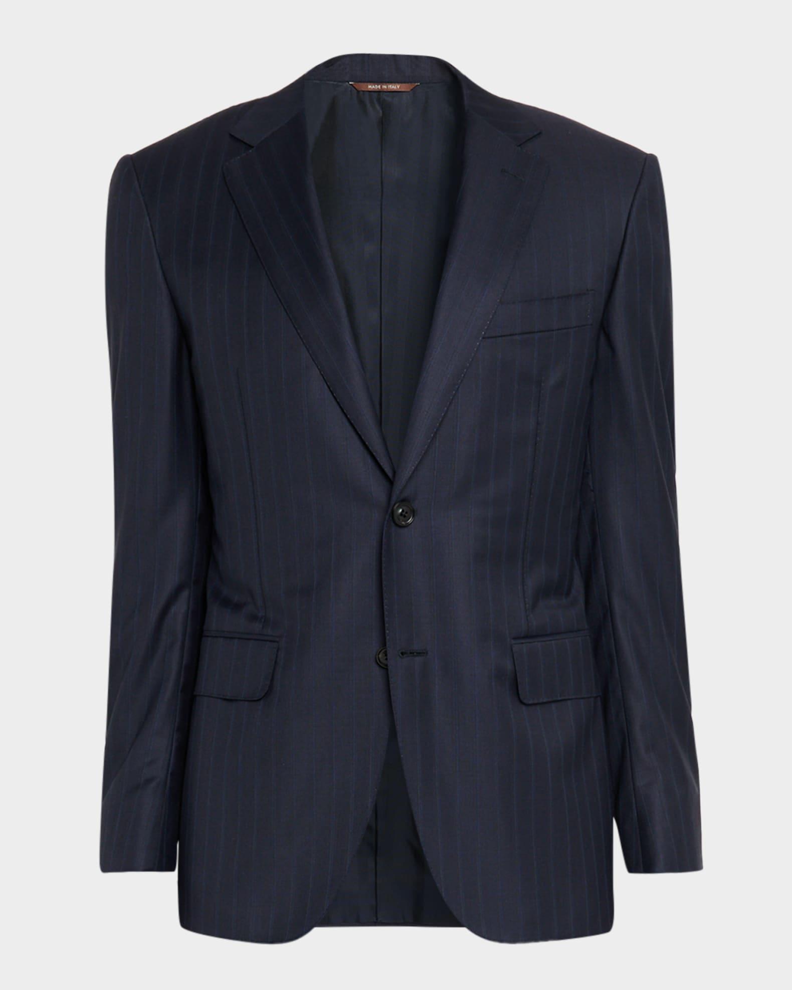 Canali sport coat in wool with a slight comfortable stretch, adorned with muted vertical stripes Notch lapels Single-breasted front Chest welt pocket Hip flap pockets Internal breast pocket Structured shoulder Double-vented back Wool/elastane Lining: Cupro Dry clean Made in Italy
