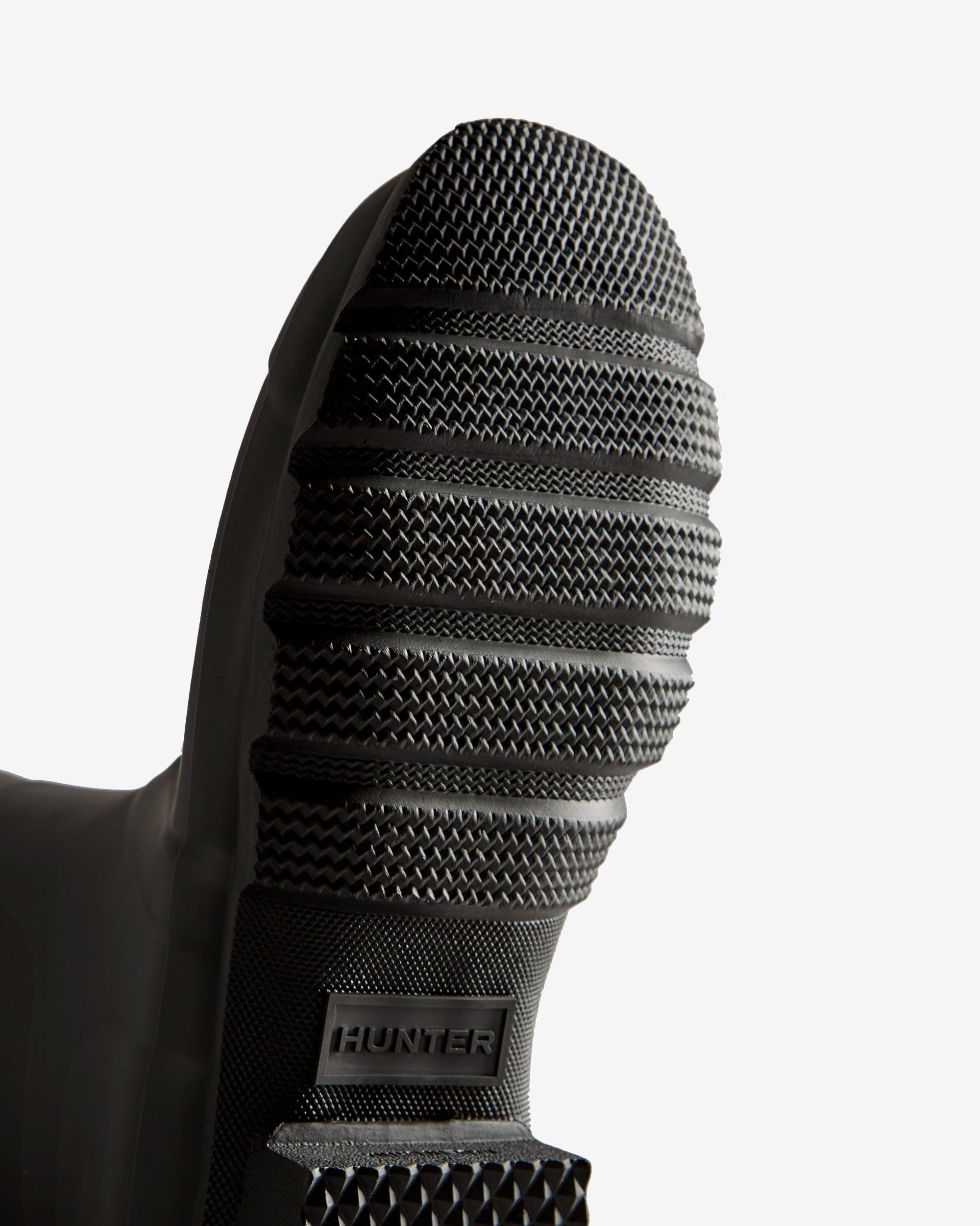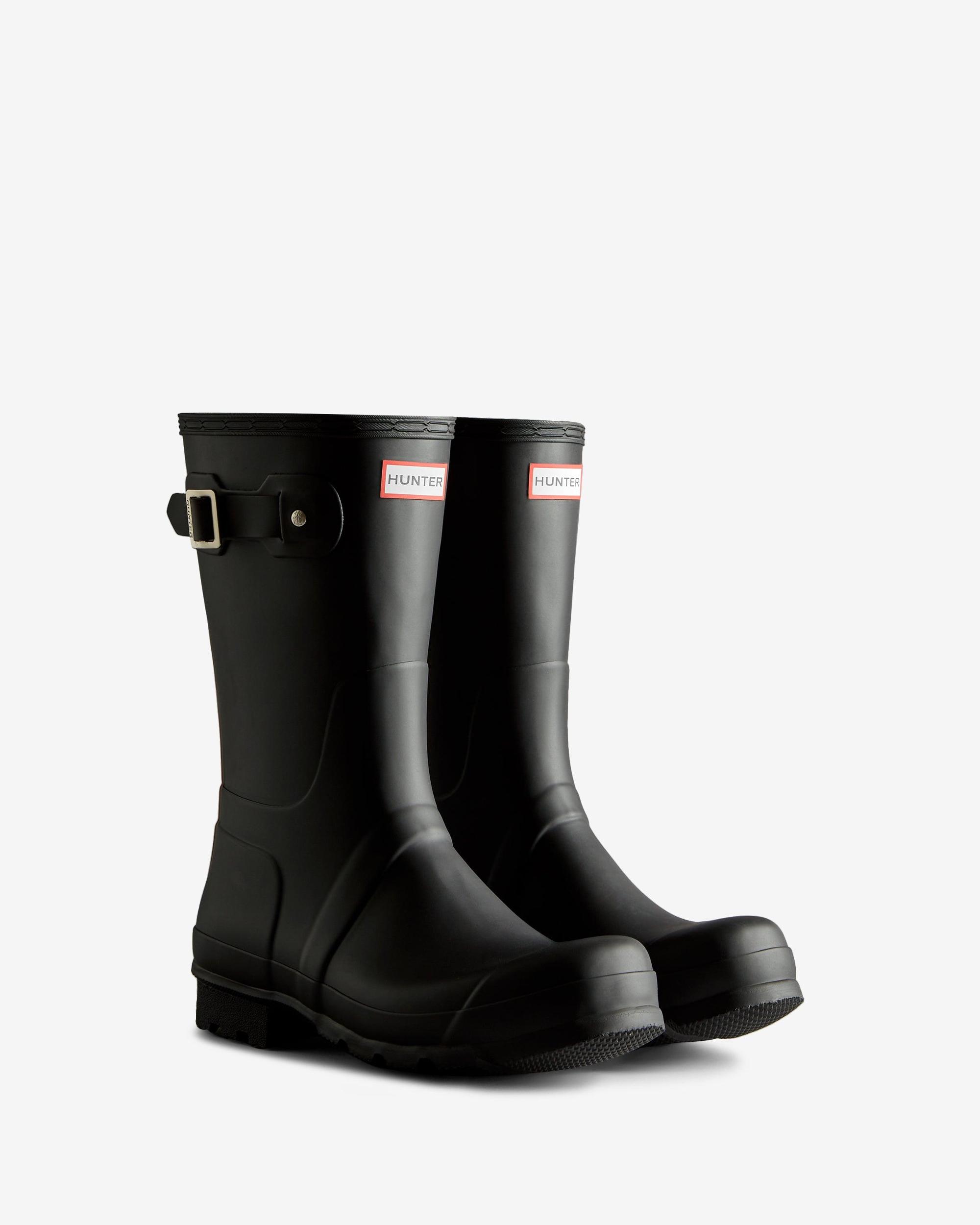 Men's Tri-Colour Logo Backstrap Short Wellington Boots Size/Fit Summary: True to size, Regular fit. Crafted from FSC®-certified natural rubber from forests independently audited to Forest Stewardship Council® standards. The Hunter Original Short Boot has now been updated with the iconic Hunter tri-colour logo on the backstrap. Perfect for wet-weather conditions, this natural rubber rain boot is a shorter version of the iconic Hunter Original Tall Boot. Each black boot is handcrafted and assembled over three days before being vulcanised for superior protection. The Hunter Original tread pattern and comfortable recycled polyester linings complete the design. We recommend that all Hunter boots be worn with socks to protect the wearer's skin from contact with rubber. All Hunter Boot Socks are specially designed for use with our boot range and feature a fold over top to cover the rubber and nylon boot edge, preventing any rubbing associated with wear.