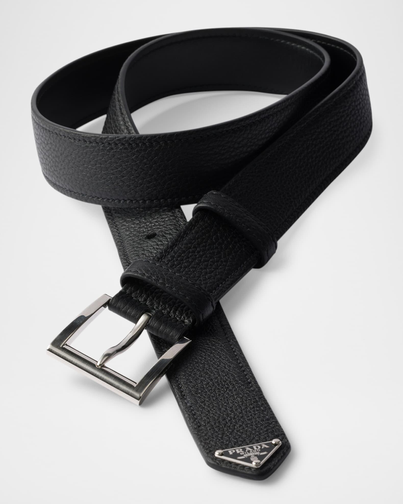 Prada pebbled leather belt with signature enameled metal triangle logo end Approx. 1.3"W Silvertone hardware Topstitching Adjustable fit Leather Imported