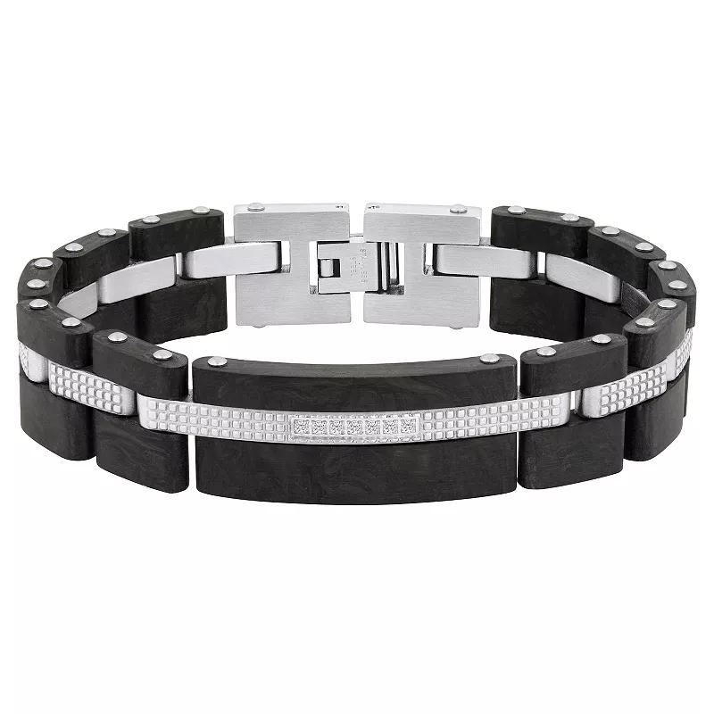 This bracelet offers contemporary style for men, and is perfect for those who appreciate a simple, yet striking urban aesthetic. Click on this JEWELRY & WATCHES GUIDE to learn about fit, styles, materials and more! This bracelet offers contemporary style for men, and is perfect for those who appreciate a simple, yet striking urban aesthetic. Click on this JEWELRY & WATCHES GUIDE to learn about fit, styles, materials and more! FEATURES Length: 8.5 in. Clasp: fold-over Metal: stainless steel, carbon fiber Finish: brushed, polished Packaging: boxedSTONE DETAILS Stone type: cubic zirconia Total weight: 1/6 ct. Shape: round Setting: prong Size: 8.5. Color: White. Gender: male. Age Group: adult.