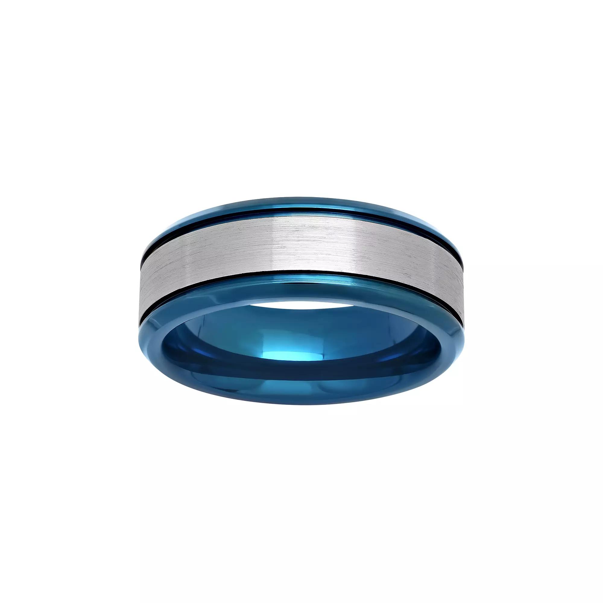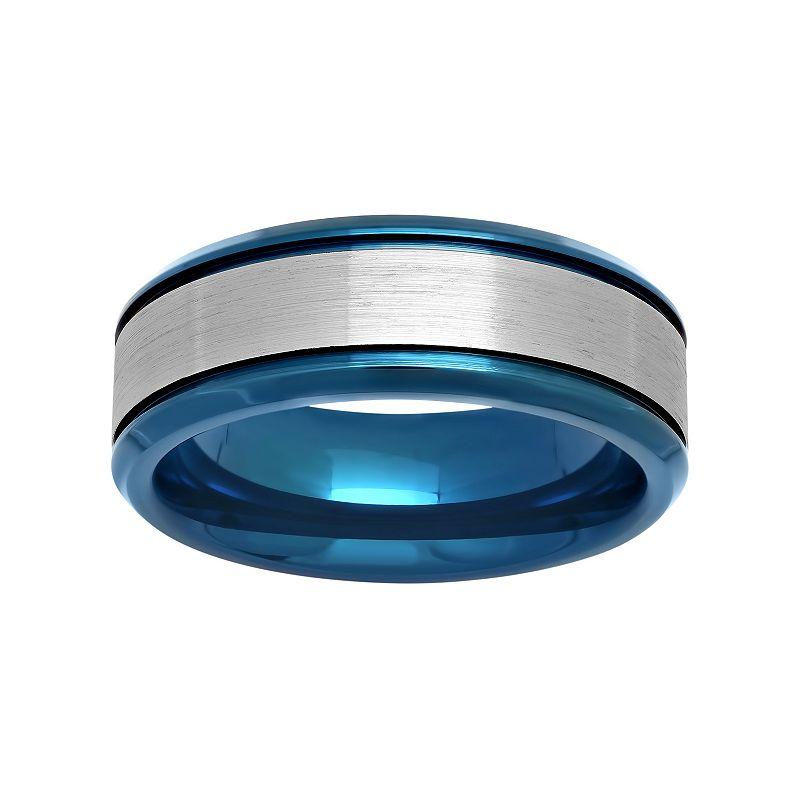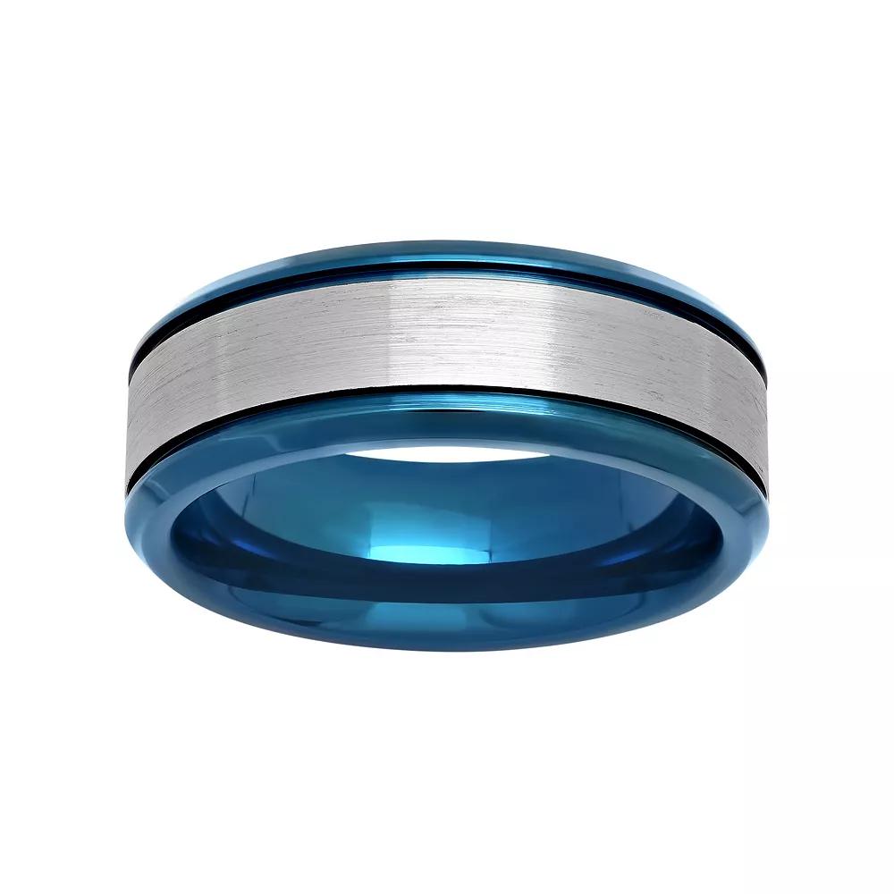 Convey your commitment with this unique two-tone stainless steel wedding band.RING DETAILS Width: 8 mm Metal: stainless steel Plating: blue ion Finish: satin Additional details: comfort-fit band Gender: male. Age Group: adult.