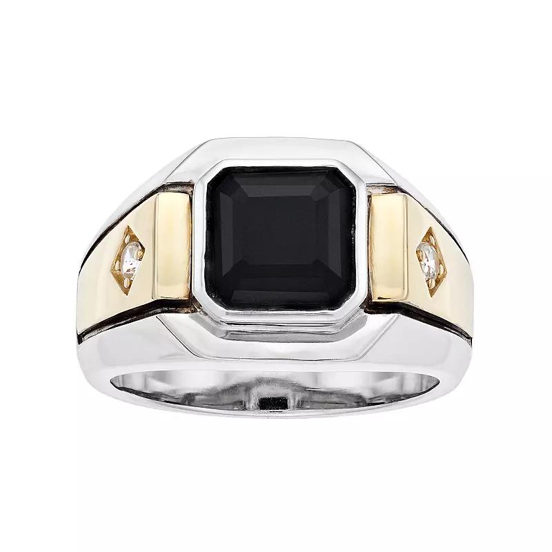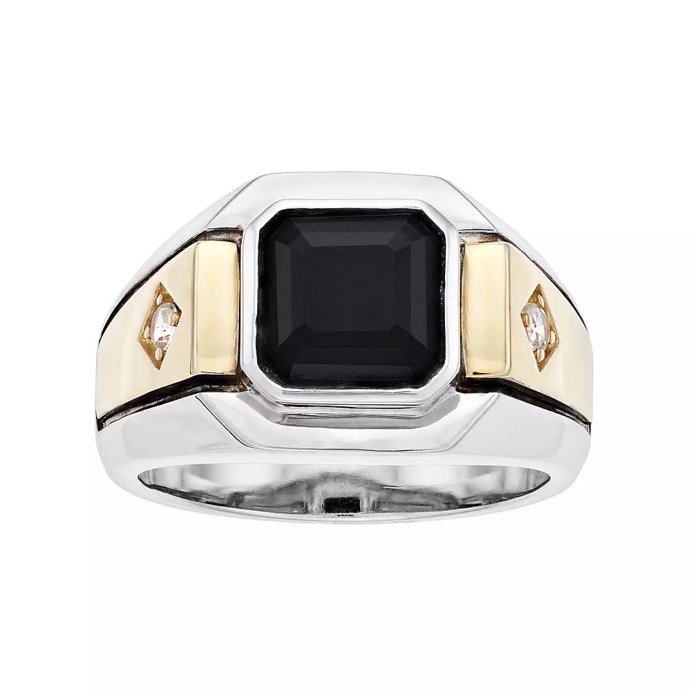 Add a masculine touch to your look when you wear this bold sterling silver onyx ring.RING DETAILS Width: .57 in. Metal: sterling silver Plating: 10k gold, rhodium Finish: polished Packaging: boxed STONE DETAILS Stone type: genuine onyx, lab-created white sapphire Total weight: 3 1/4 ct. Center stone size: 9 mm x 9 mm Shape: Asscher-cut, round Setting: bezel, prong Gemstones may have been treated to enhance their appearance. Special care may be required. Please visit our Gemstone Treatment & Special Care Guide for more information. Color: Black. Gender: male. Age Group: adult.