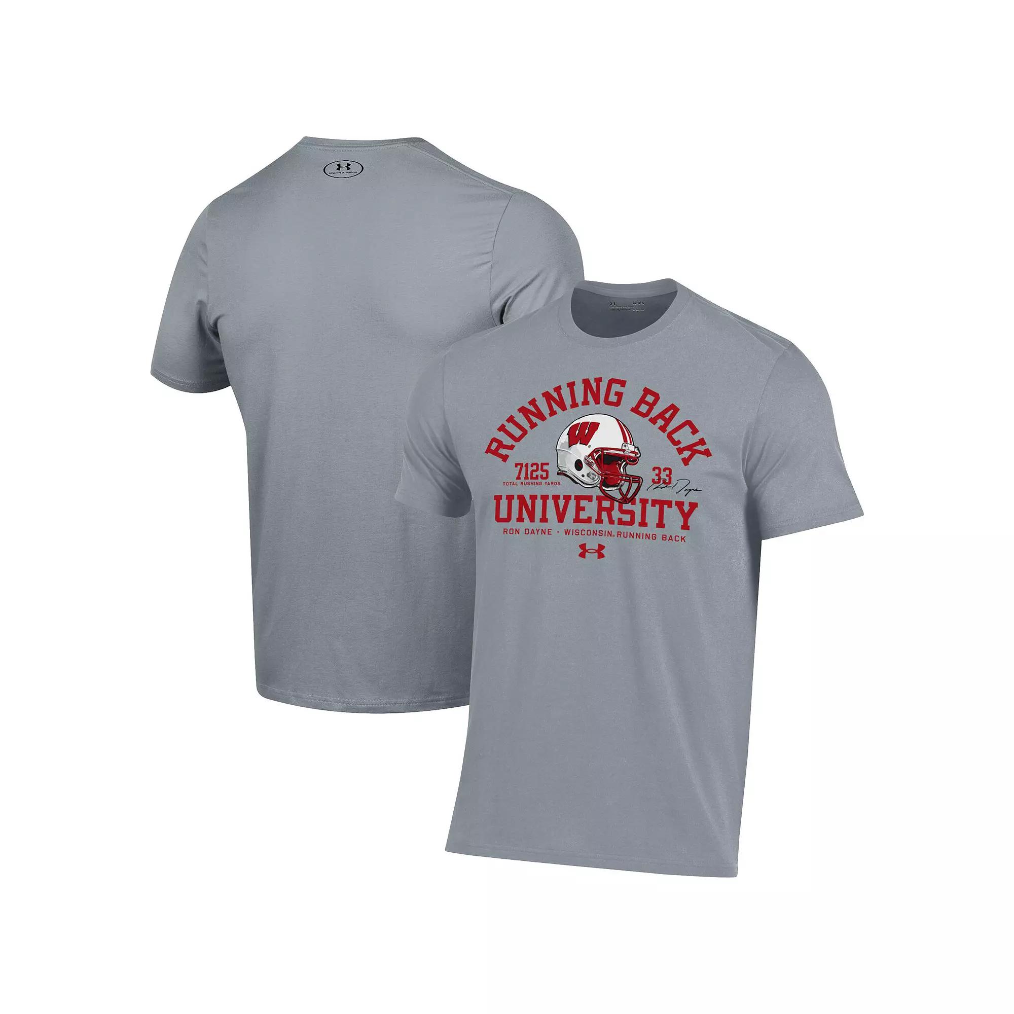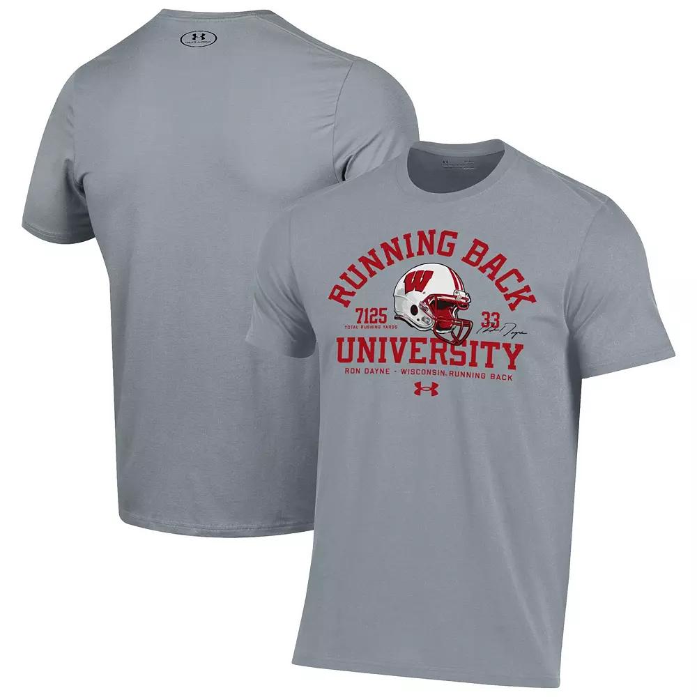 Celebrate the career of a Wisconsin Badgers legend by grabbing this Ron Dayne Running Back T-Shirt from Under Armour. The soft fabric will keep you nice and comfortable as you jump around at Camp Randall. The distinct graphics pay homage to one of the most dominant running backs in college football history.Celebrate the career of a Wisconsin Badgers legend by grabbing this Ron Dayne Running Back T-Shirt from Under Armour. The soft fabric will keep you nice and comfortable as you jump around at Camp Randall. The distinct graphics pay homage to one of the most dominant running backs in college football history.PRODUCT FEATURESScreen print graphicsBrand: Under ArmourCrew neckMaterial: 60% Cotton/40% PolyesterOfficially licensedShort sleeveImportedMachine wash, tumble dry low Color: Grey. Gender: male. Age Group: adult.