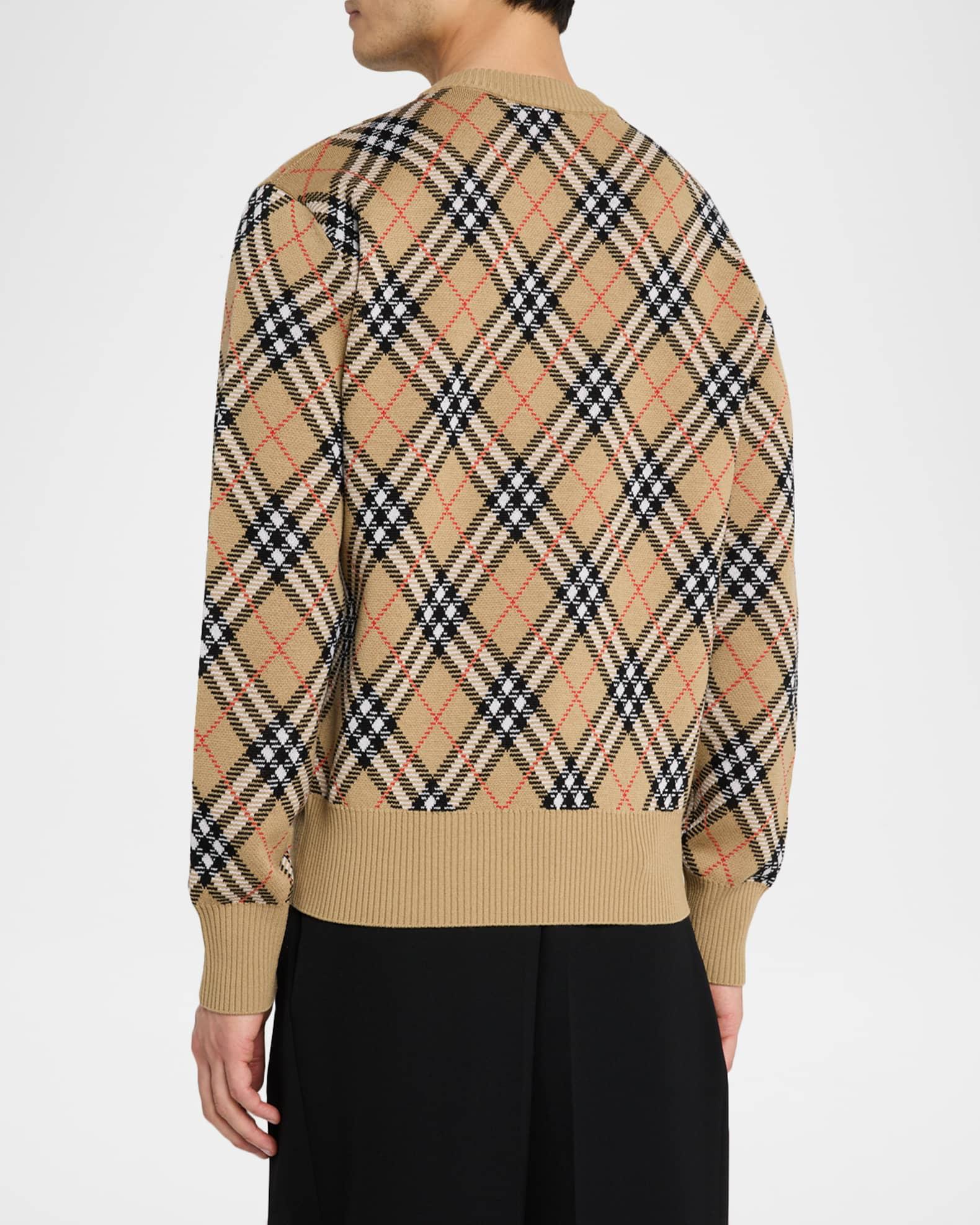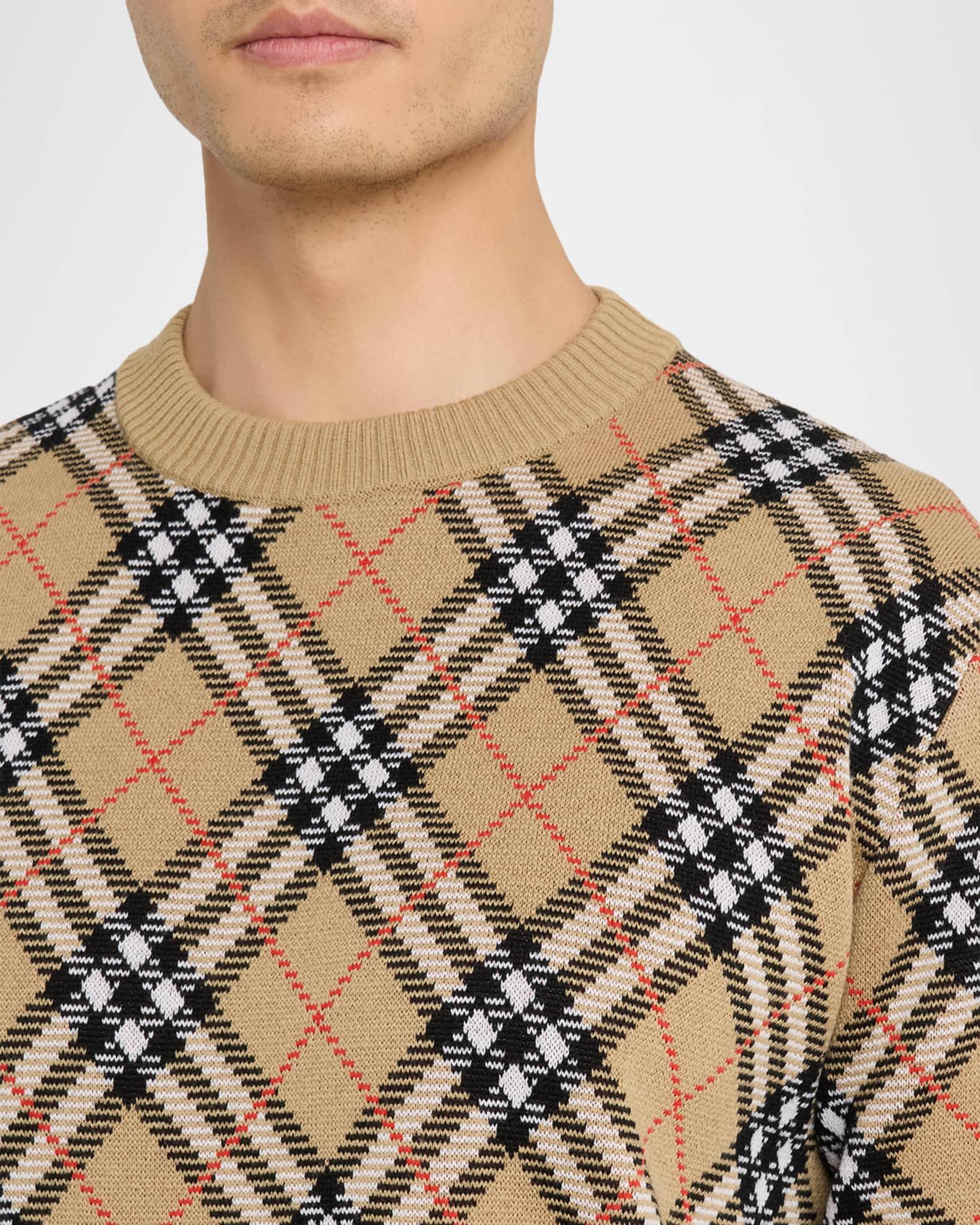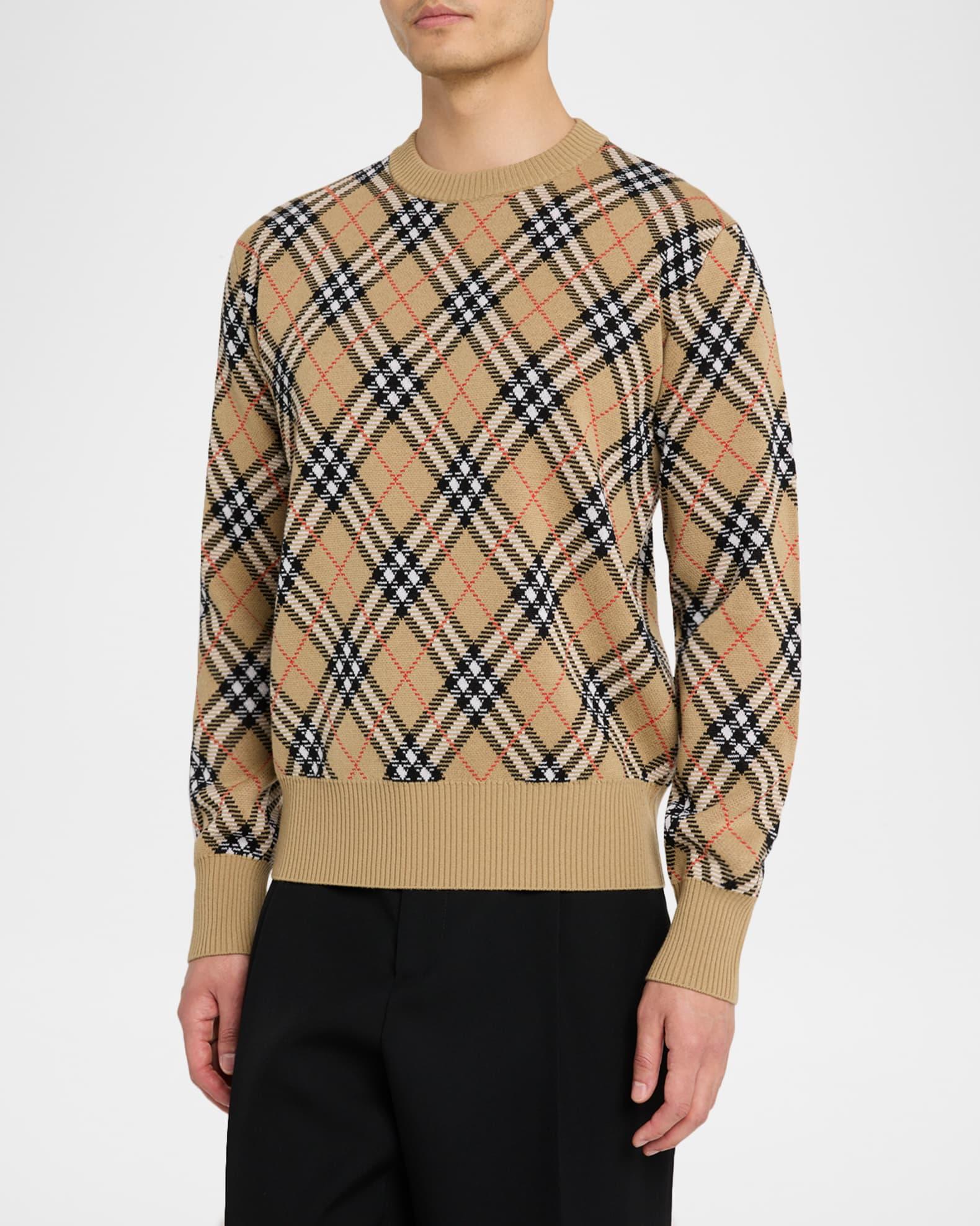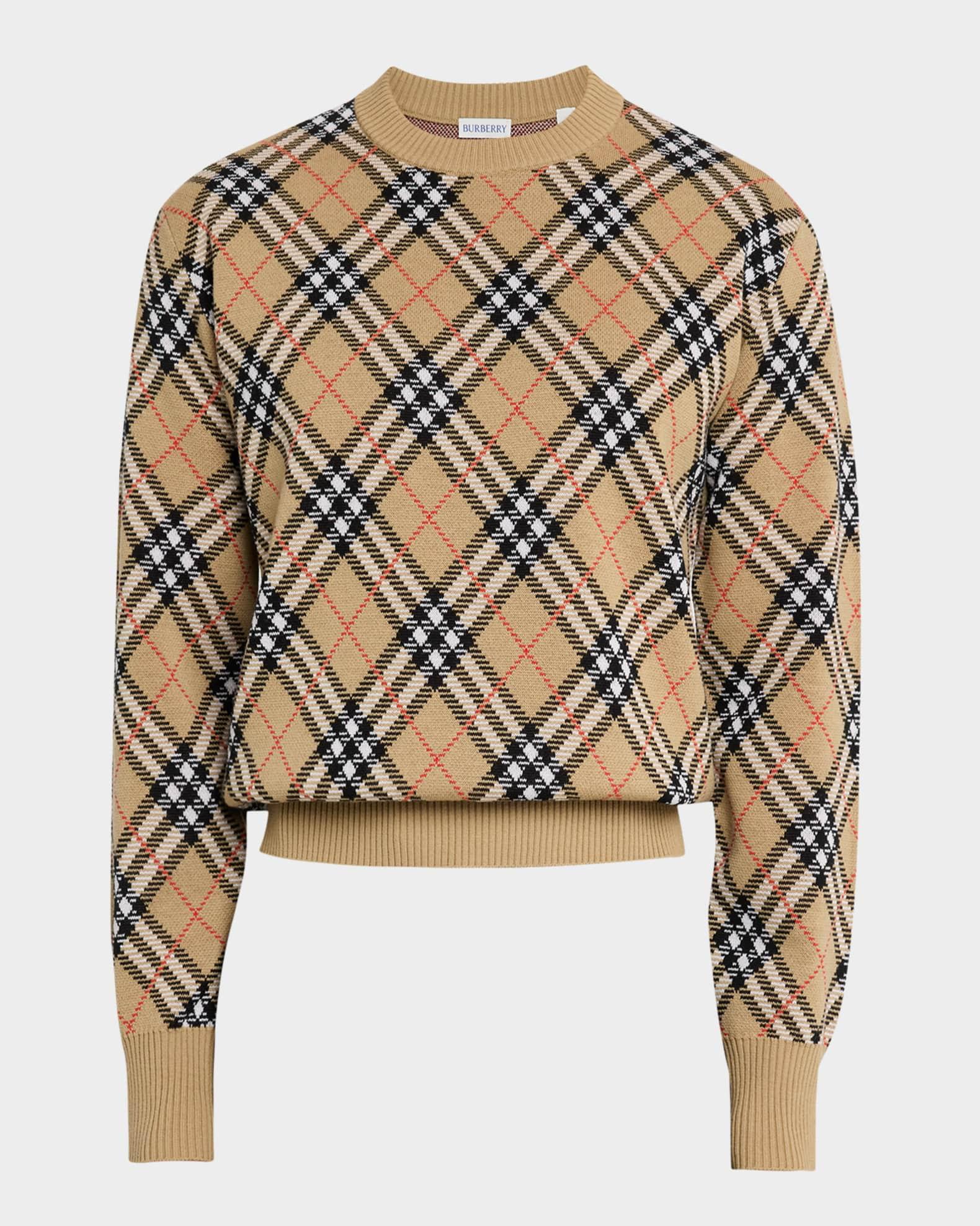 Burberry sweater in a premium wool blend showcasing the iconic vintage check Crew neckline Long sleeves Ribbed cuffs and hem Pullover style Wool/polyester Made in Romania
