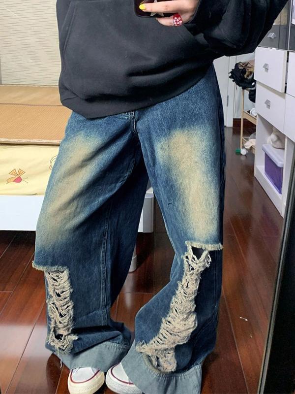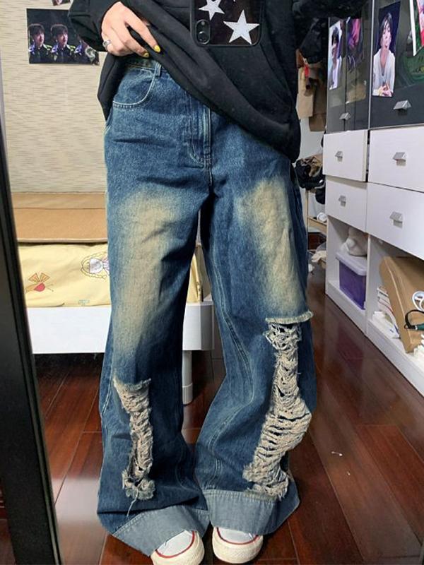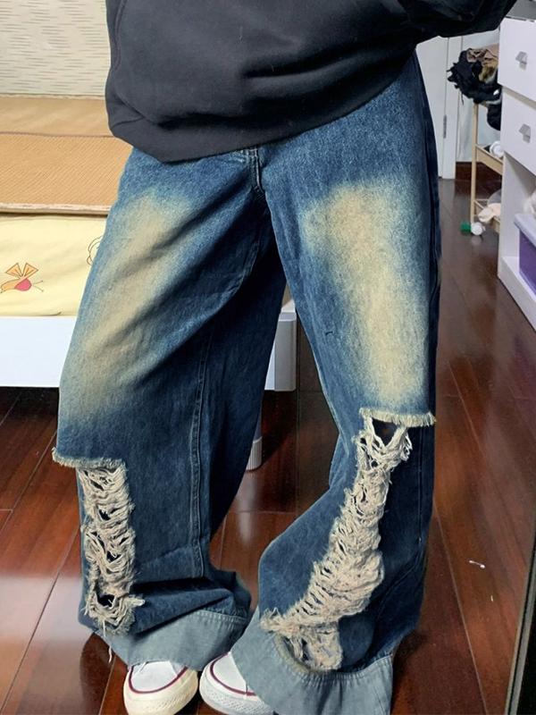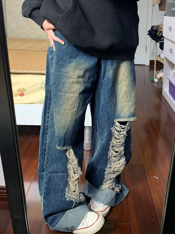 Men's Vintage Wash Ripped High Rise Loose Jeans
