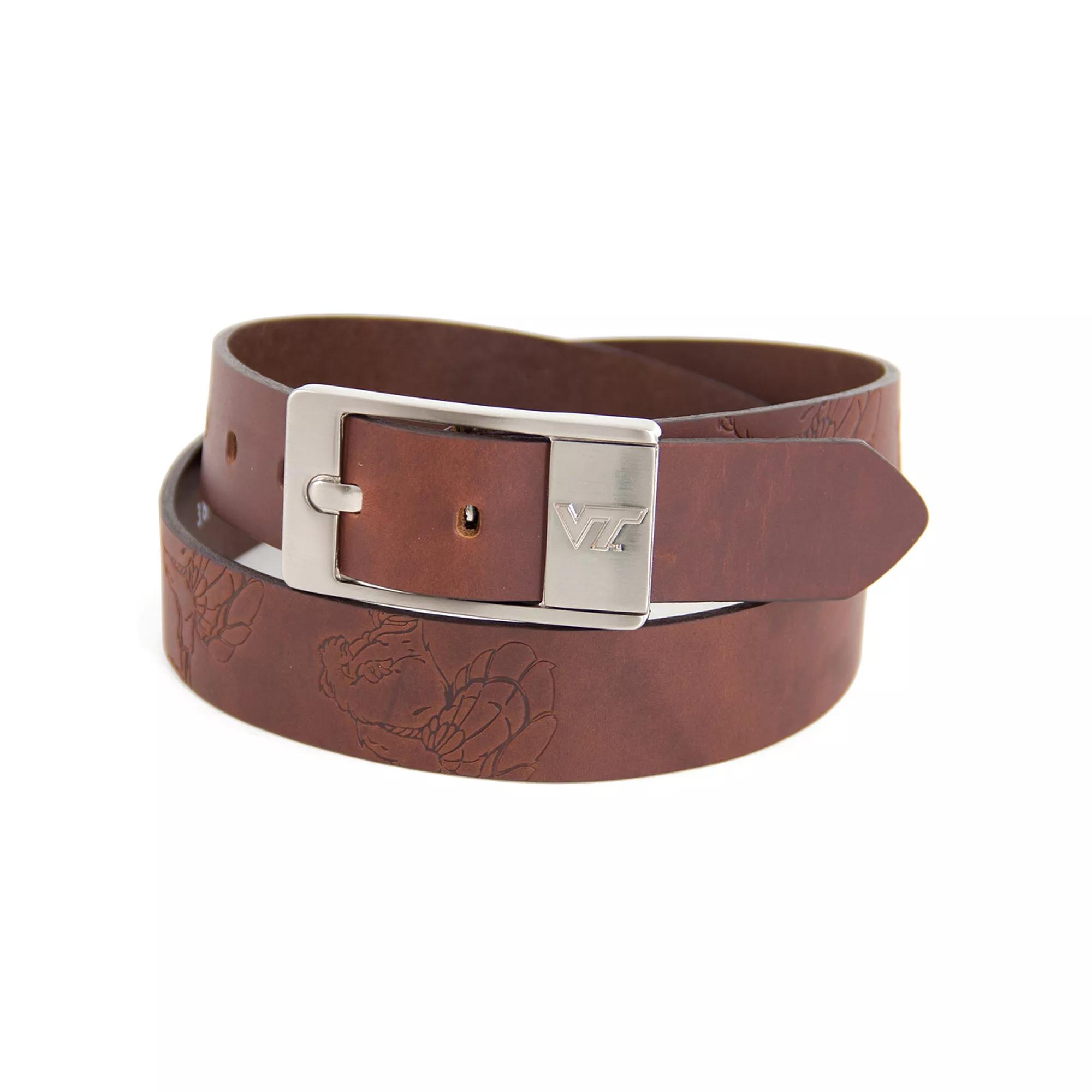 Youre a devoted Hokies fan, but face paint and gaudy team accessories just arent your cup of tea. Up your Virginia Tech ante without the garish embellishments when you sport the Brandish leather belt. Featuring embossed team graphics repeated around the belt and an engraved school wordmark on the metal buckle, this adjustable belt has tons of Hokies spirit that will never interfere with your polished personal style. This is Virginia Tech fanaticism that you can show off regardless of the occasion.