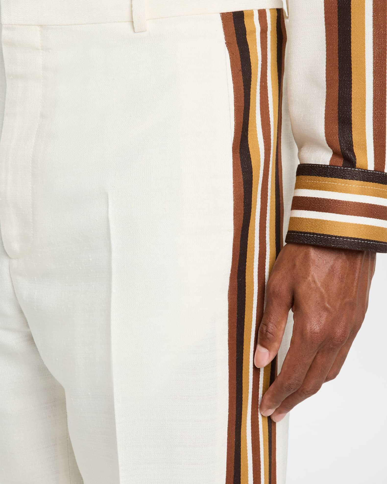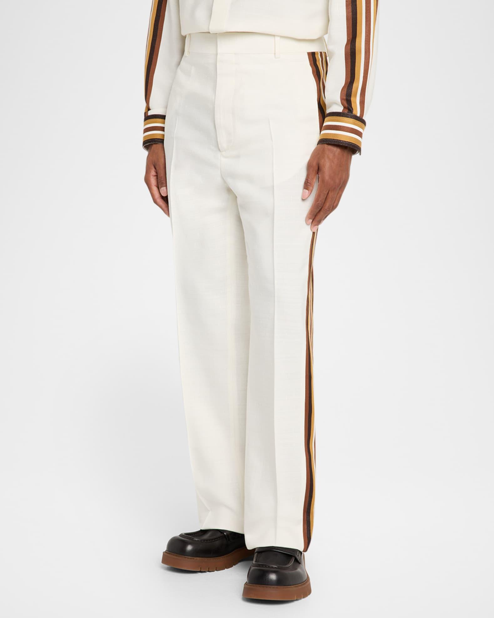 Bottega Veneta solid trousers accented with textured viscose multi-stripes Regular rise Flat front with creasing Side slip pockets Back welt pocket Relaxed fit through straight legs Full length Concealed button-front; belt loops Viscose/silk/cotton Lining: Cotton Made in Italy