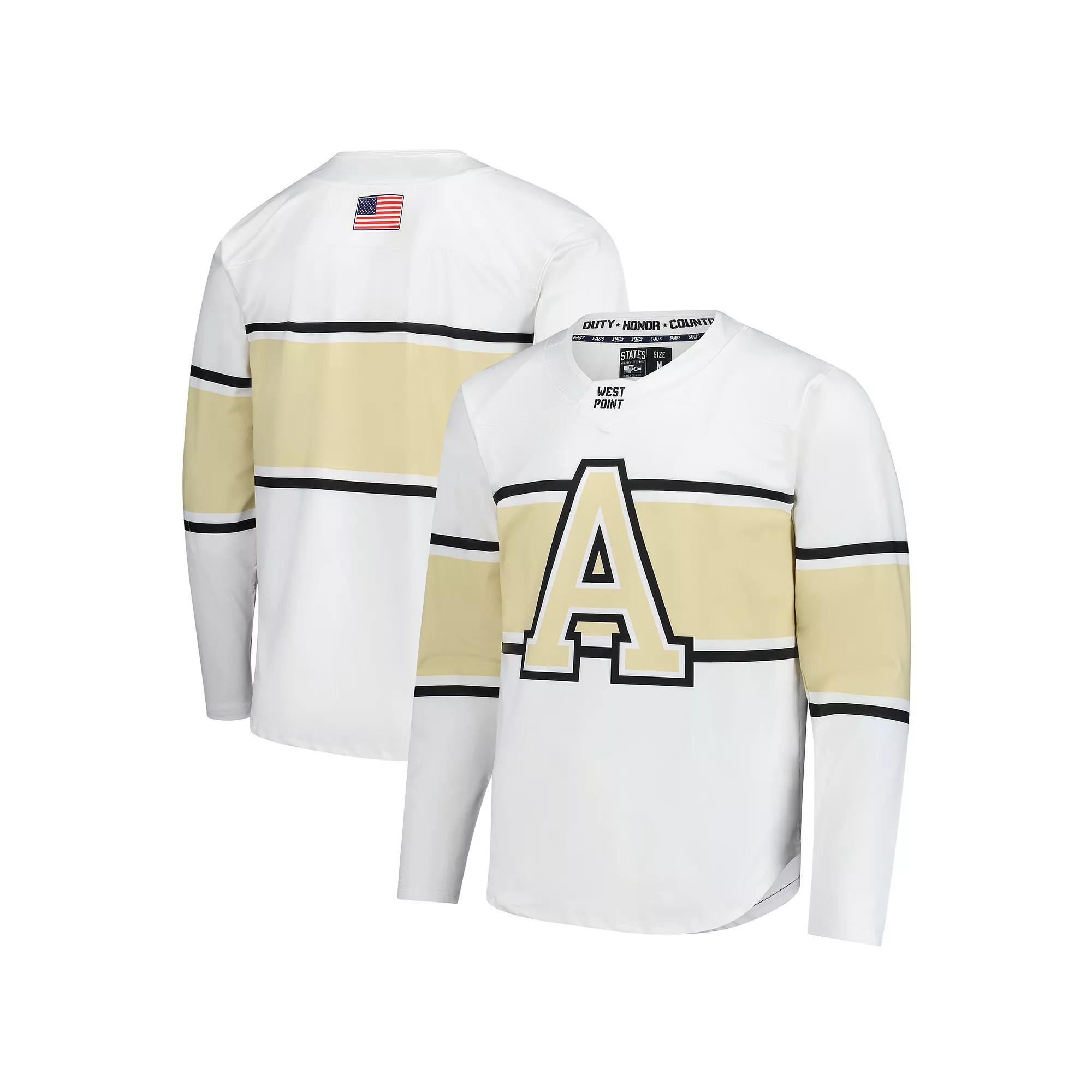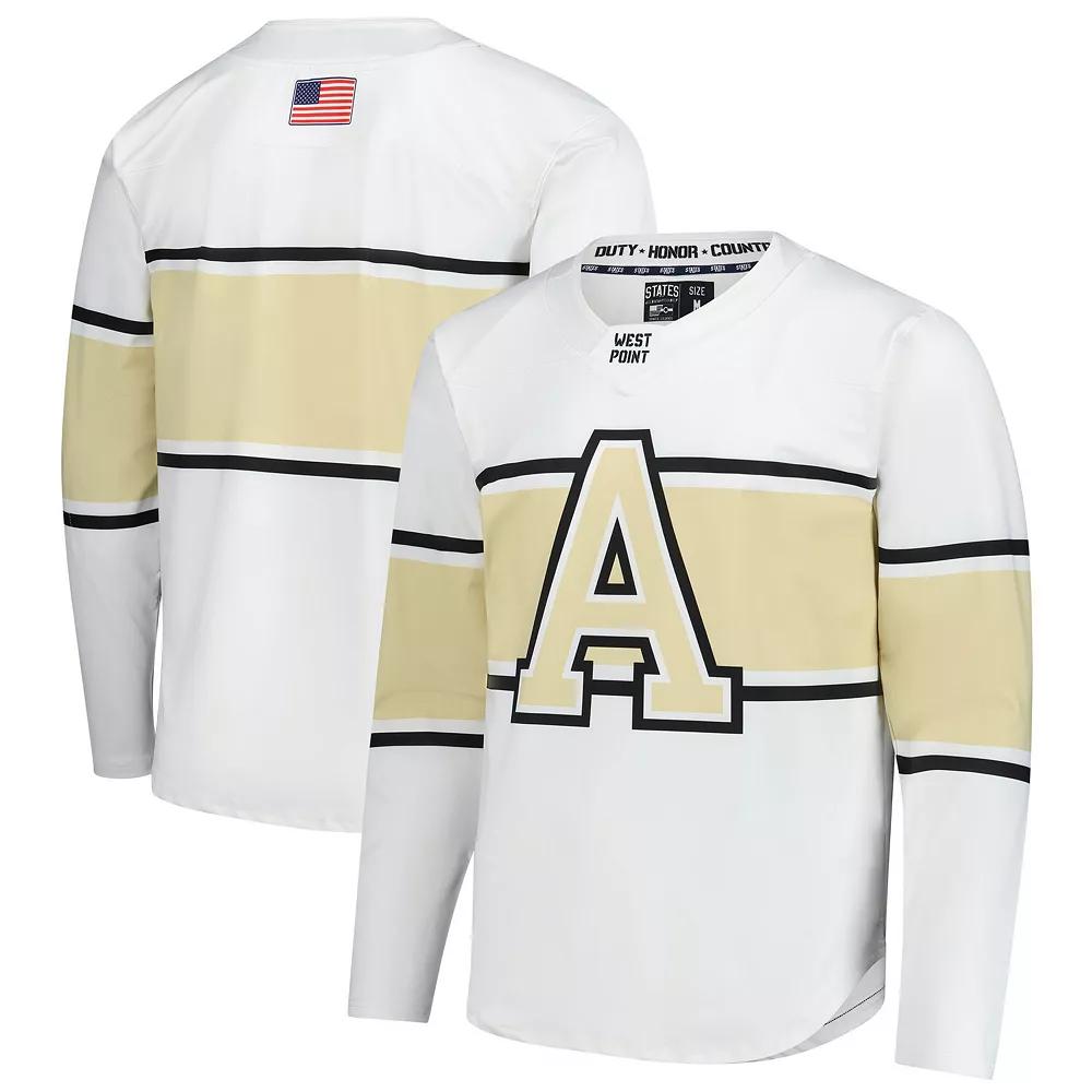 Showcase your Army Black Knights pride with this Men's White Army Black Knights Replica Hockey Jersey. This replica hockey jersey features smooth, fully sublimated Army Black Knights graphics, ensuring a comfortable fit and a sharp look. With elbow patches for added protection and a neck inset showcasing team pride, this jersey is ready for the roar of the crowd.Showcase your Army Black Knights pride with this Men's White Army Black Knights Replica Hockey Jersey. This replica hockey jersey features smooth, fully sublimated Army Black Knights graphics, ensuring a comfortable fit and a sharp look. With elbow patches for added protection and a neck inset showcasing team pride, this jersey is ready for the roar of the crowd.PRODUCT FEATURESMaterial: 88% Polyester/12% SpandexBrand: States & CoImportedElbow patches provide added protection for areas that are prone to wear and tearReplicaOfficially licensedSmooth fully sublimated graphics with no stitching or raised detailsMachine wash, line dryLong sleeveRounded hemNeck inset with team graphic Size: 2XL. Color: Nc2 White. Gender: male. Age Group: adult.