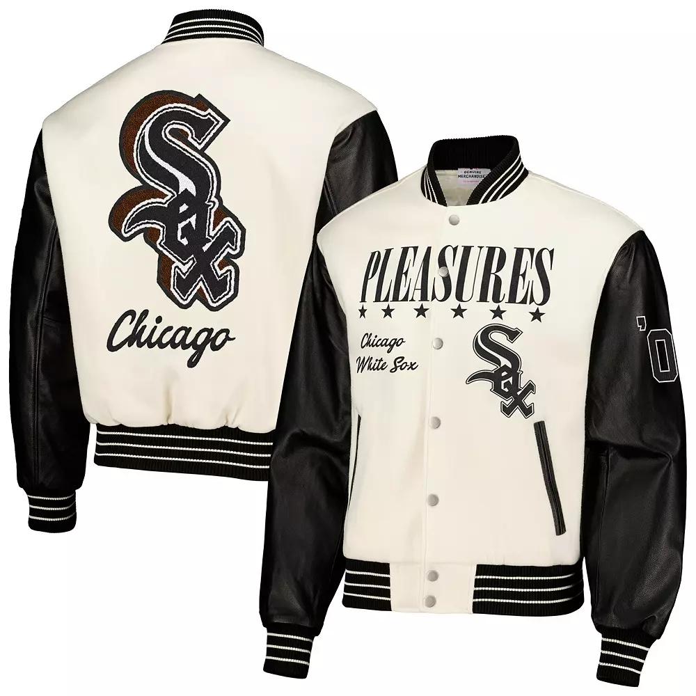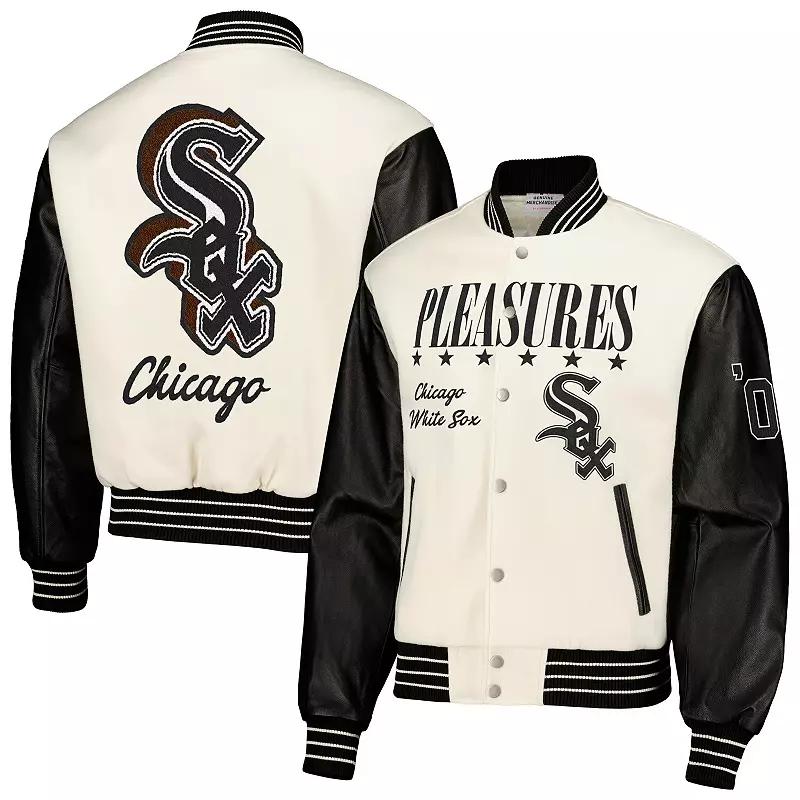 Elevate your Chicago White Sox collection by adding this full-snap Varsity jacket to your wardrobe. It features an original Chicago White Sox design with chenille details and faux leather sleeves for an eye-catching, modern look. Quilted lining and a cozy midweight construction help you sustain warmth and comfort.Elevate your Chicago White Sox collection by adding this full-snap Varsity jacket to your wardrobe. It features an original Chicago White Sox design with chenille details and faux leather sleeves for an eye-catching, modern look. Quilted lining and a cozy midweight construction help you sustain warmth and comfort.PRODUCT FEATURESOfficially licensedFull SnapDry clean onlyLong sleeveBrand: PLEASURESStand-up collarTwo front pocketsMidweight jacket suitable for moderate temperaturesImportedMaterial: 50% Wool/50% PolyesterEmbroidered graphicsFaux leather sleeves and trimQuilted liningOne interior pocketEmbroidered fabric applique with chenille details Gender: male. Age Group: adult.