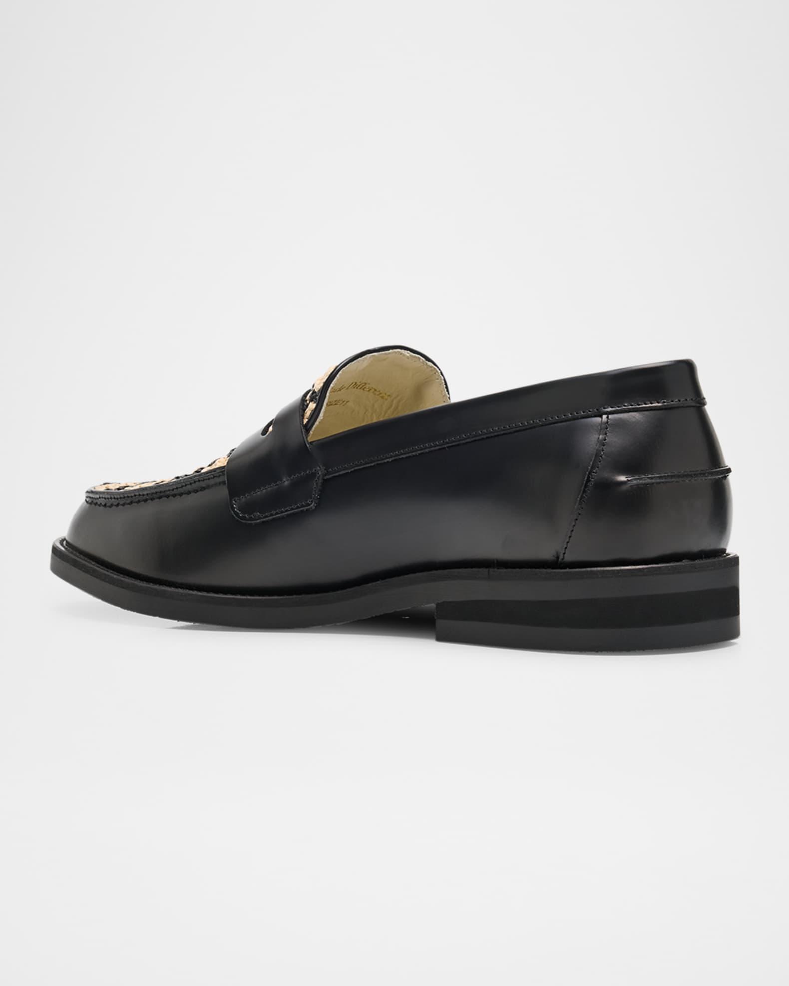 DUKE + DEXTER "Wilde Bombay" penny loafers in leather featuring a crochet wicker-skewed woven vamp Stacked heel Round moc toe Leather penny keeper strap Leather lining Slip-on style Spot clean Handmade in Portugal