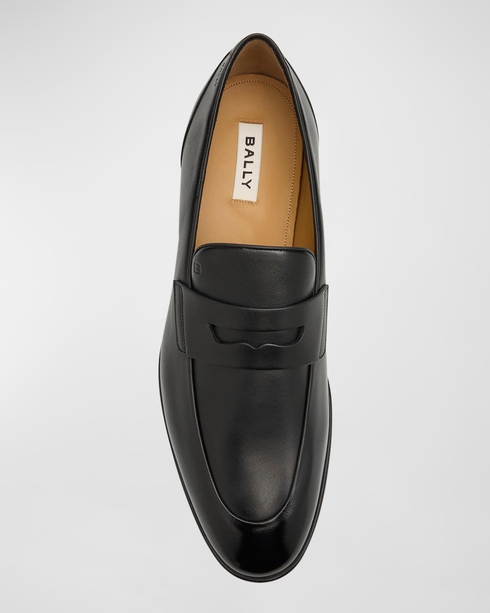 Bally "Windsor" penny loafers in smooth calf leather Stacked heel Round apron toe Leather penny keeper strap Tongue with debossed B-logo Slip-on style Made in Italy