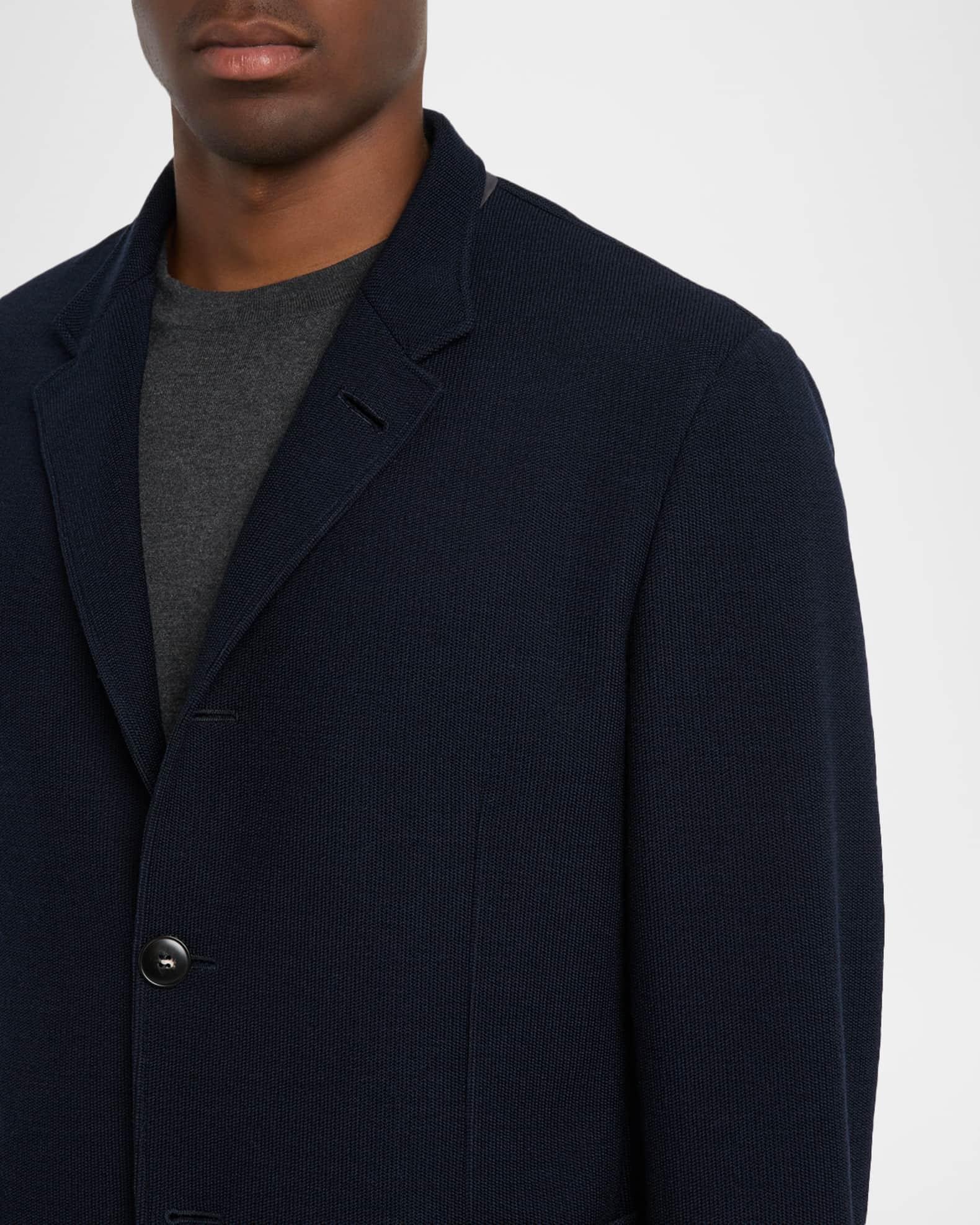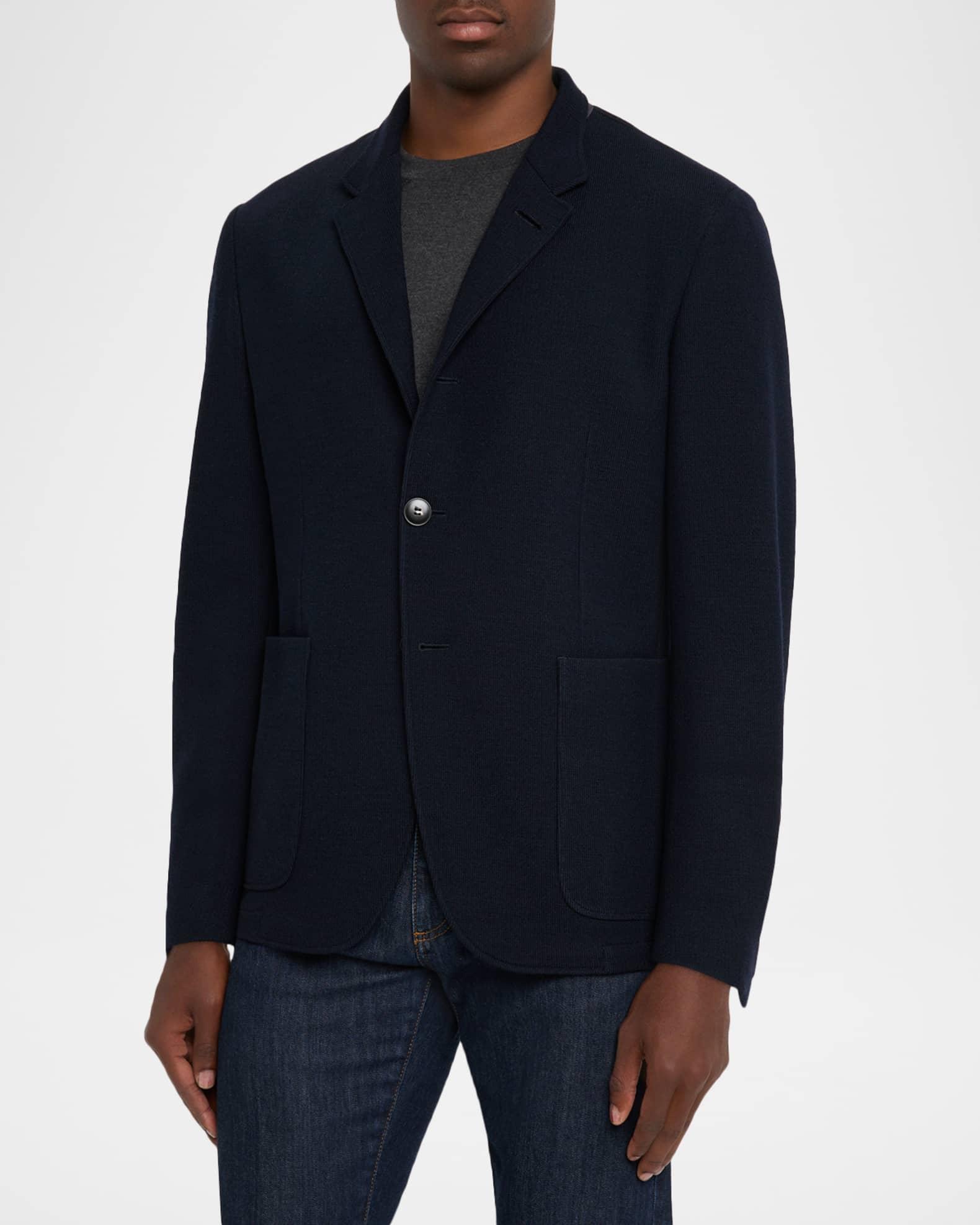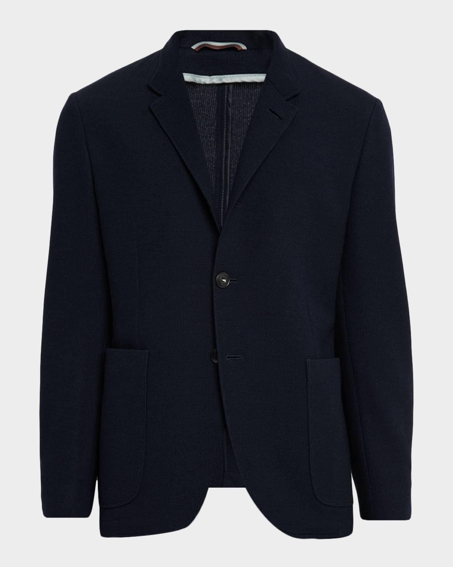 Canali blazer in textured wool and cotton jersey, showcasing breathability that wraps the body without constricting it Kei collection Notch lapels Single-breasted front Chest welt pocket Hip patch pockets Internal breast pocket Button cuffs Single-vented back Wool/cotton Lining: Cupro Dry clean Made in Italy